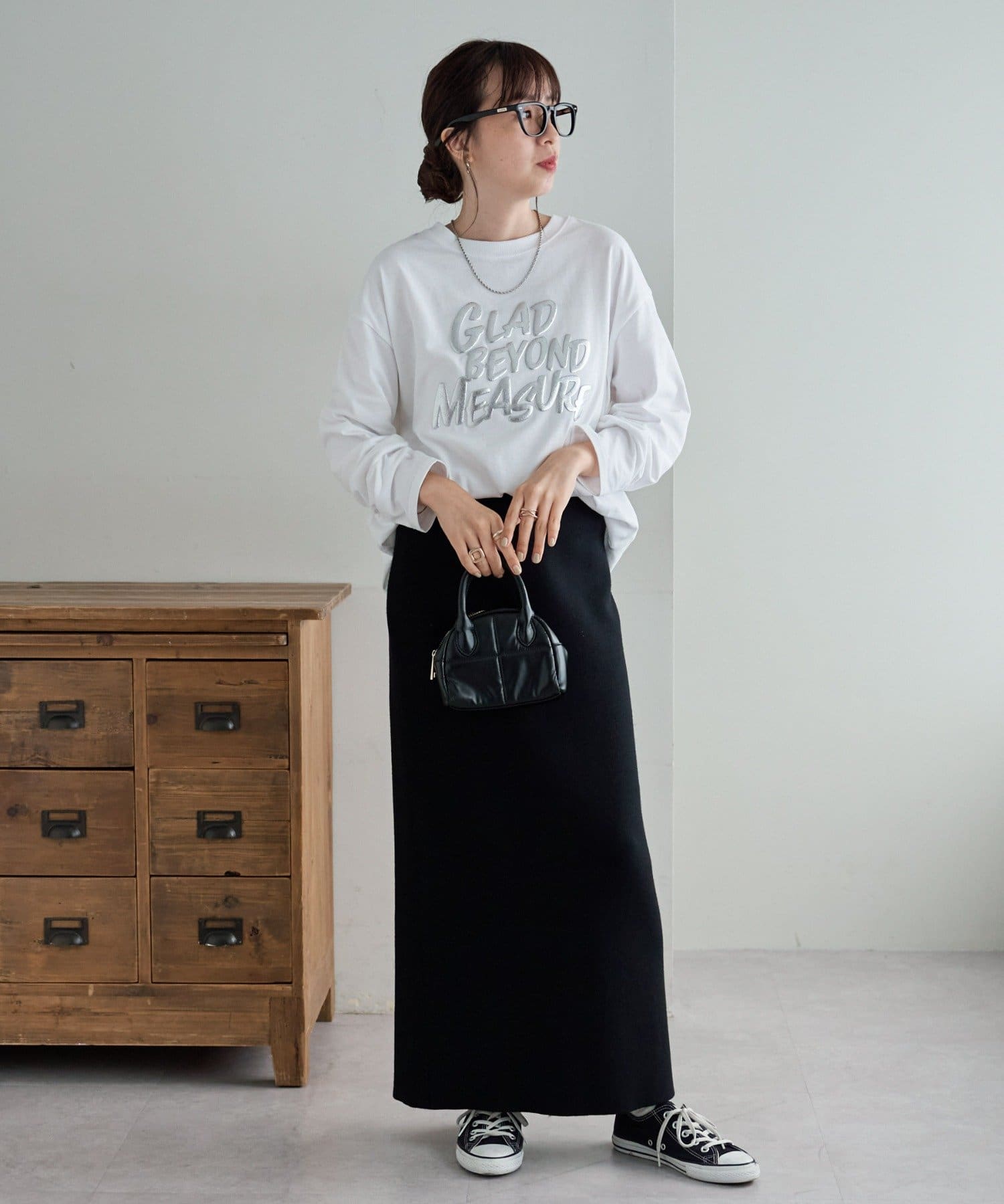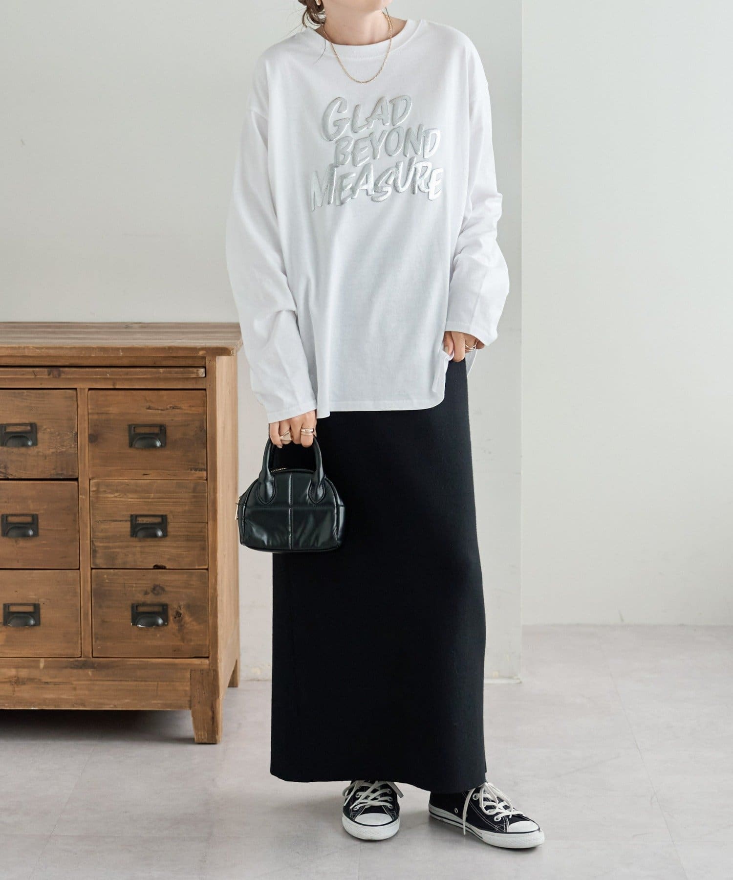 162mスタッフ(Mサイズ着用): フロントのロゴがシンプルながらアクセントになって、一枚でこなれ感が出ます!