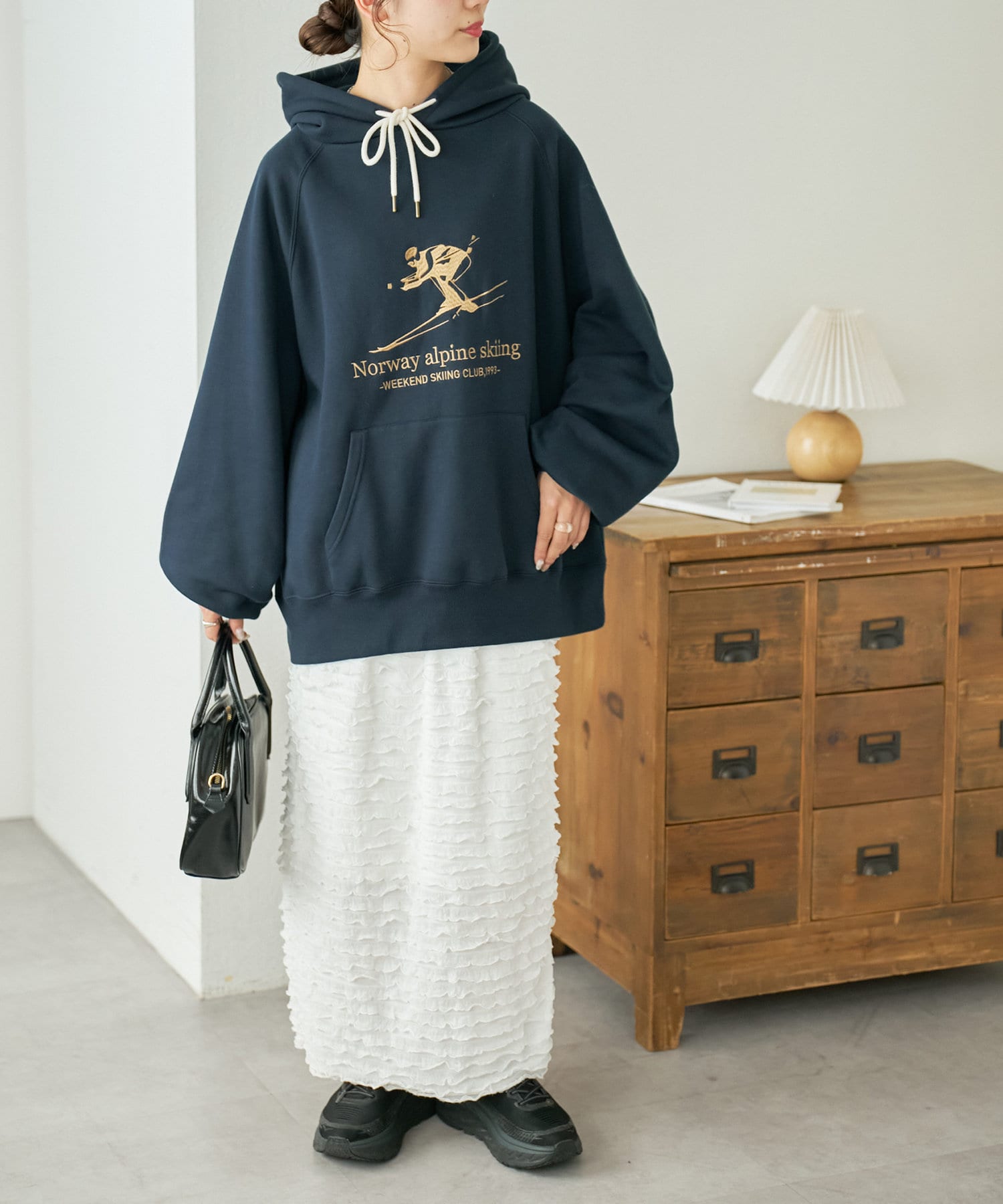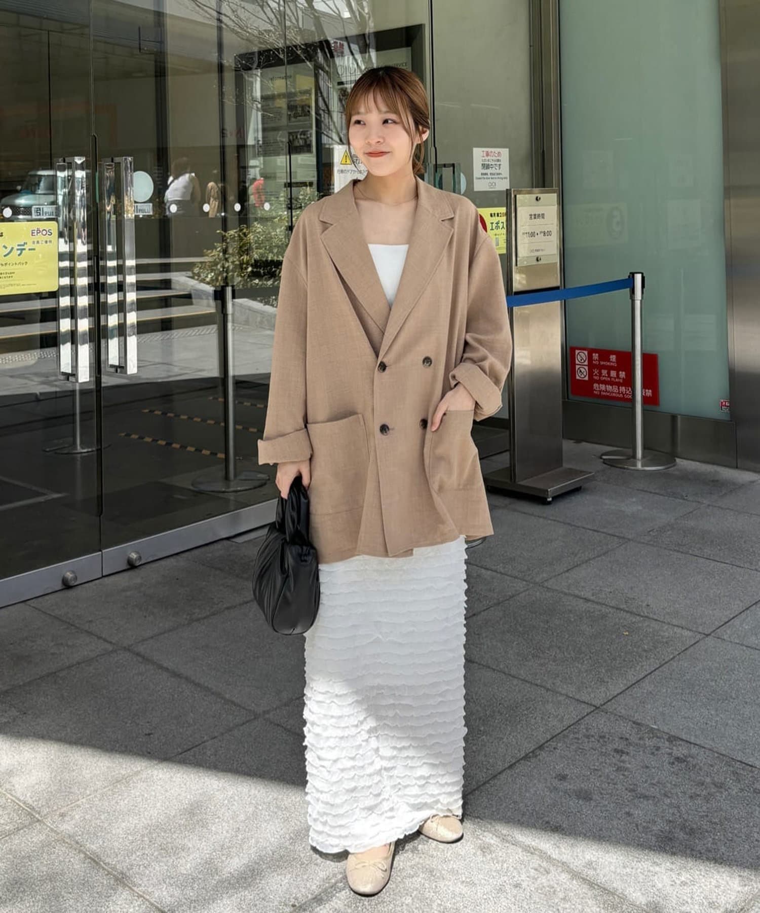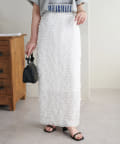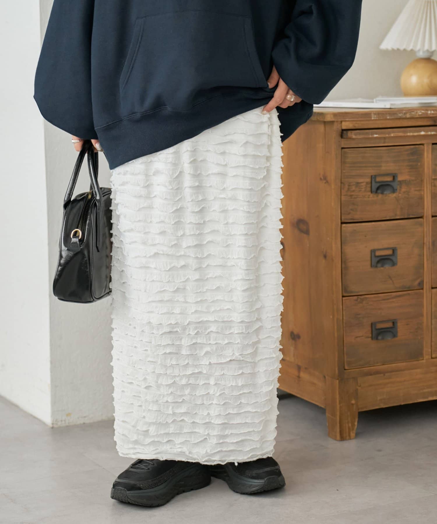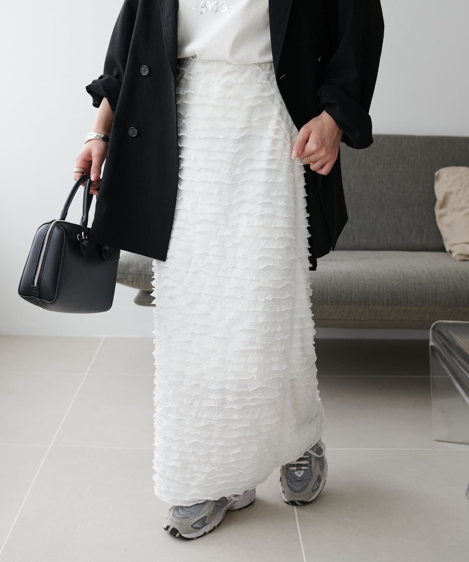 表面変化のあるフリルティアードがアクセントになり、シンプルコーデでも映えるスカート。
