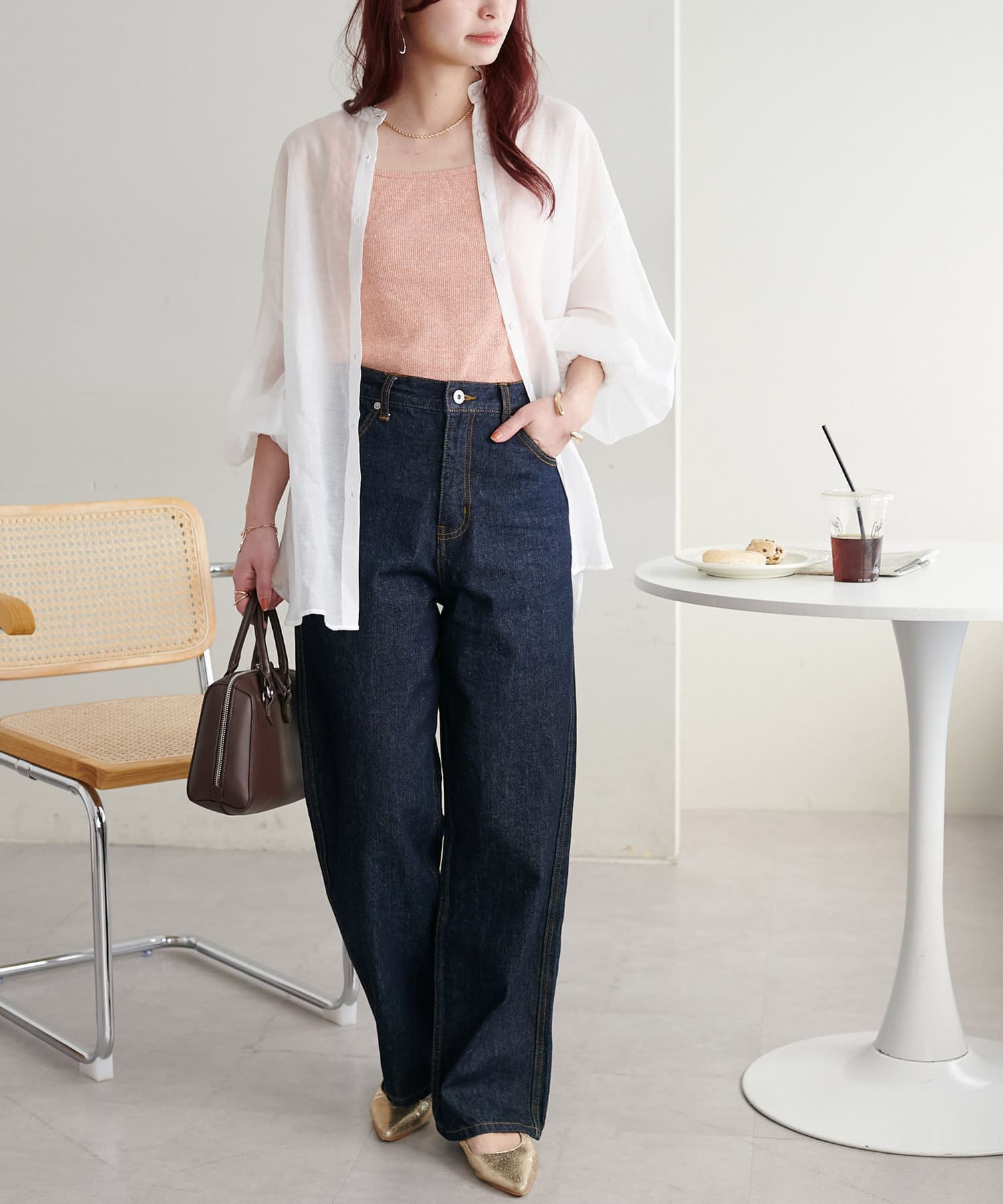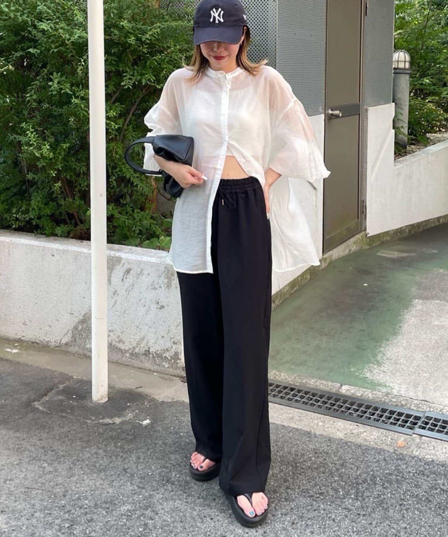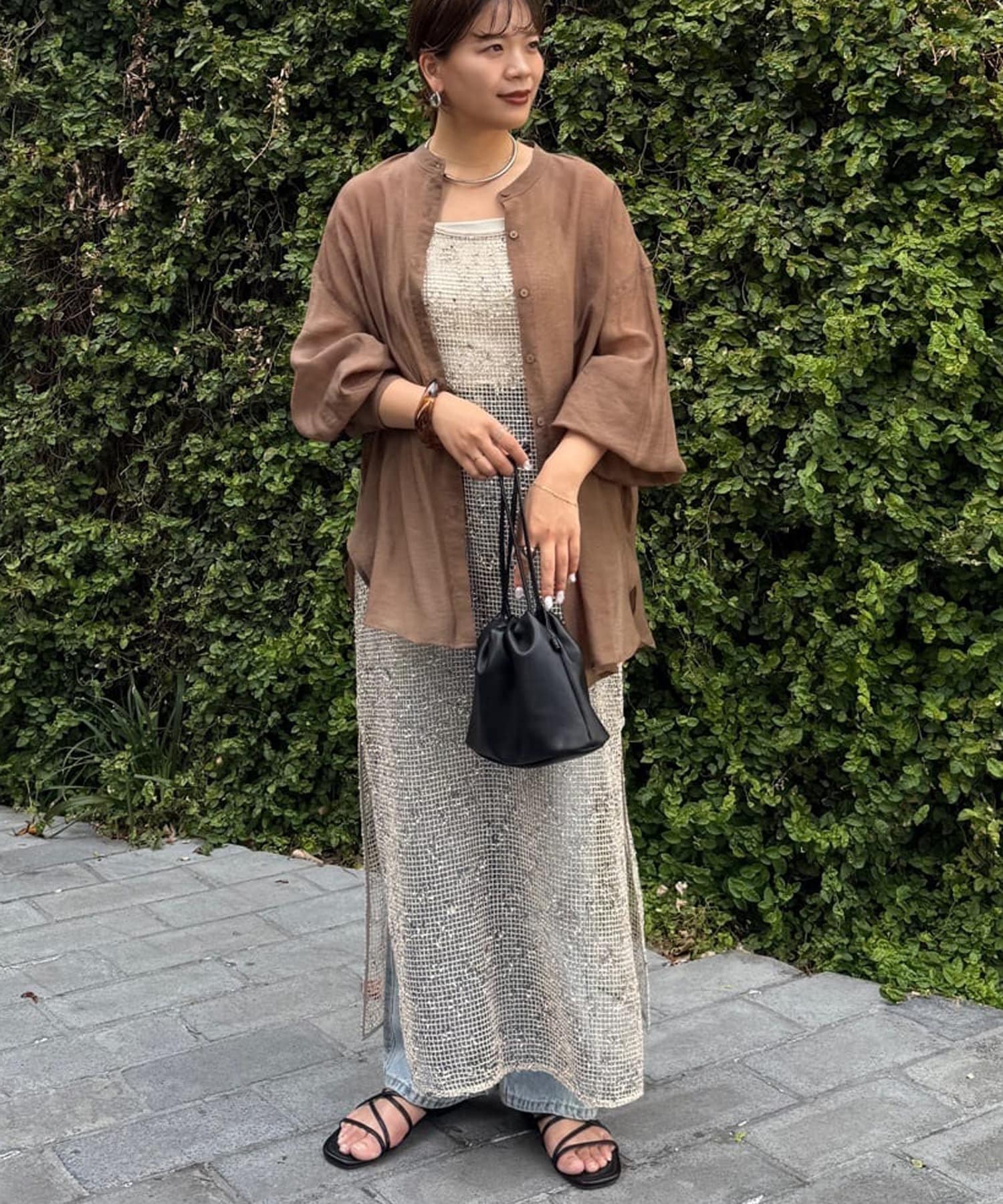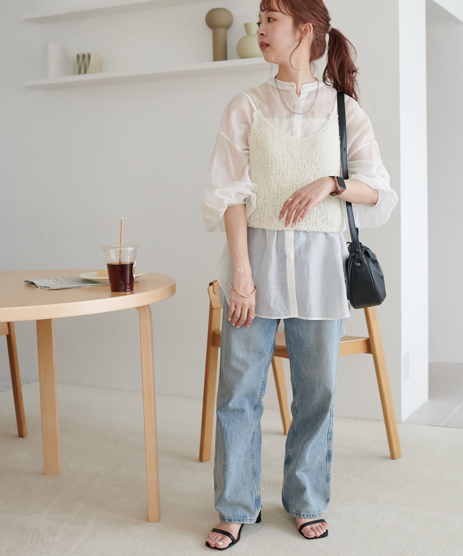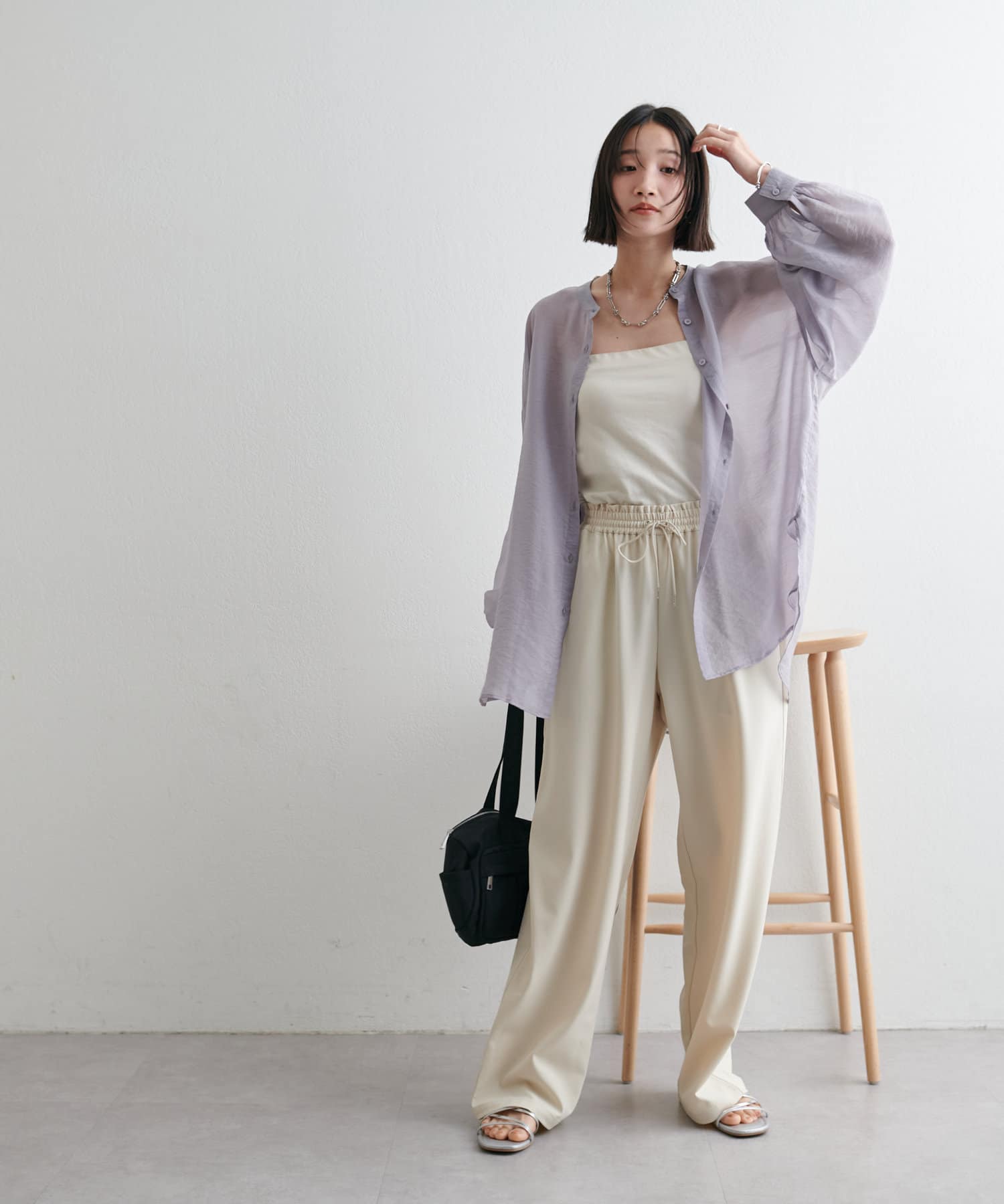 透け感があるので、キャミソールやタンクトップと合わせるとヘルシーなコーデに◎