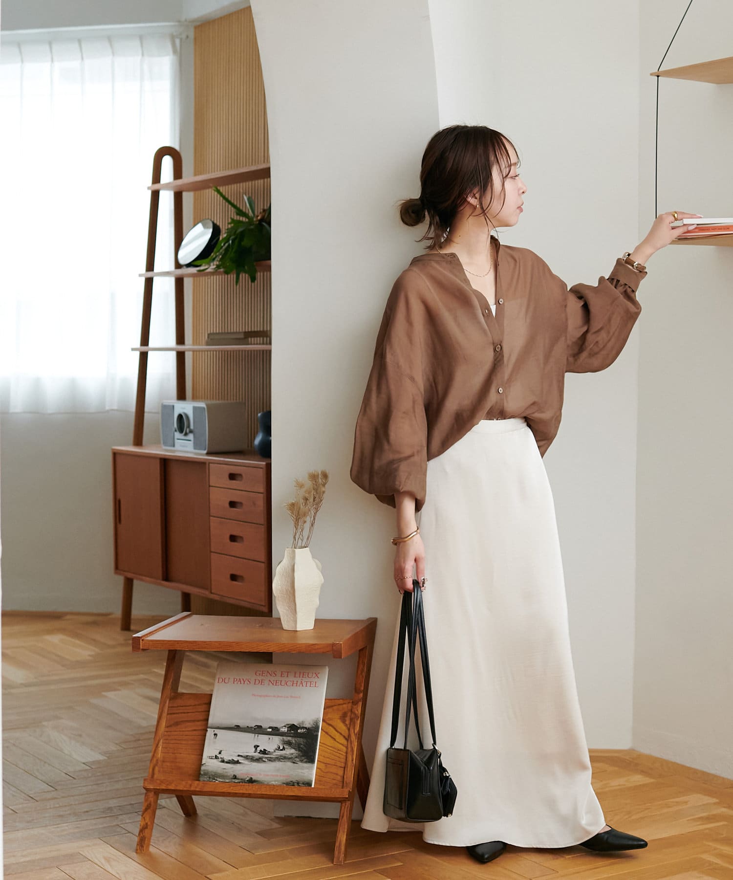 柔らかくしわが気になりにくいので、ベストやビスチェとレイヤードしたコーデもおすすめ!
