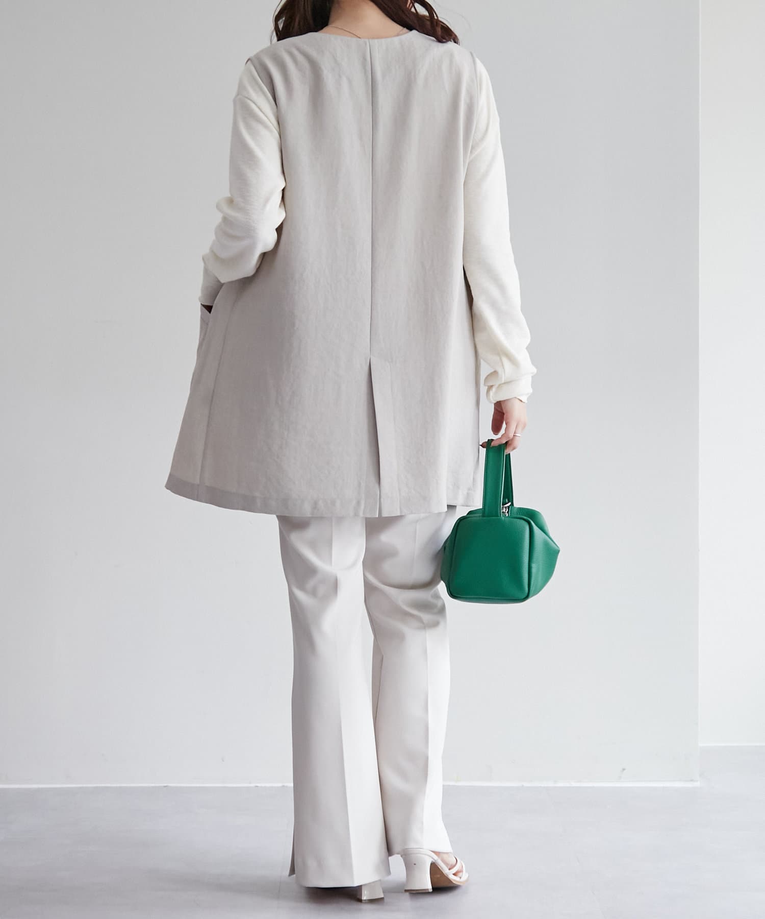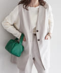 ノーカラーに、ヒップが隠れる着丈で様々なボトムスとバランスの良い仕上がりに◎