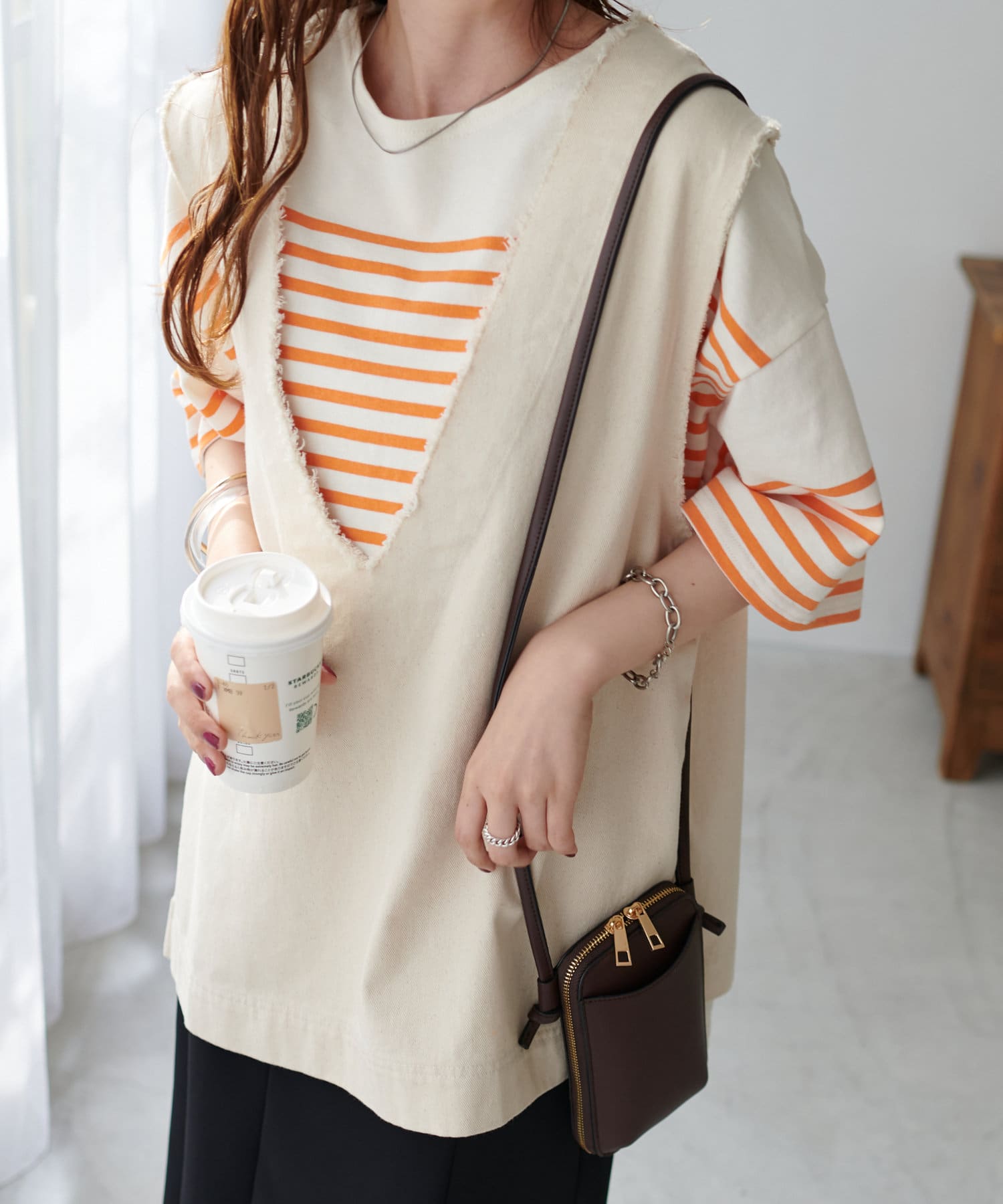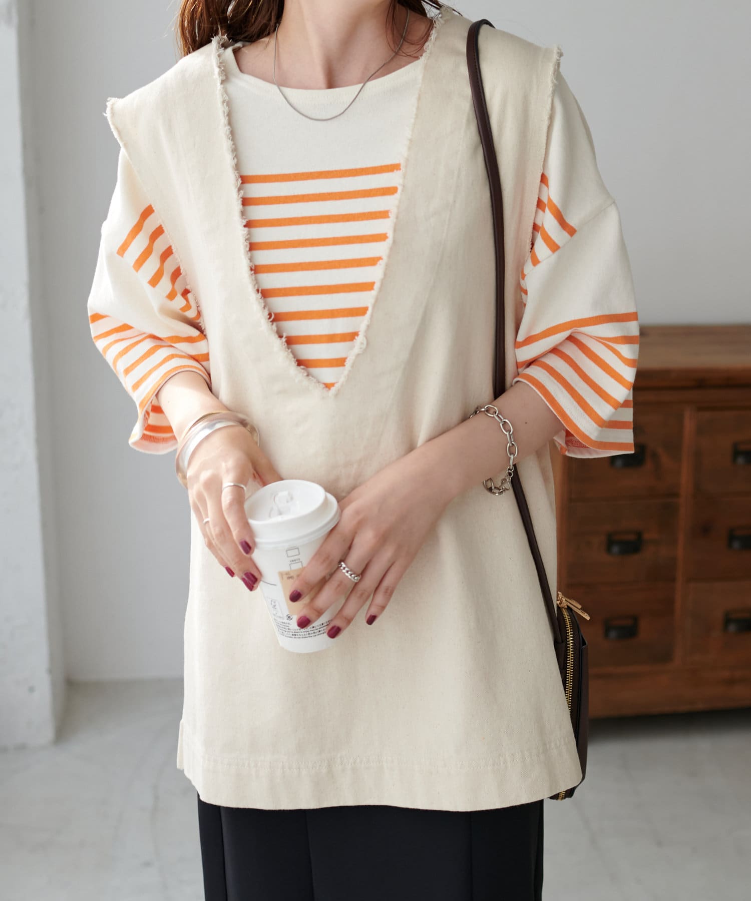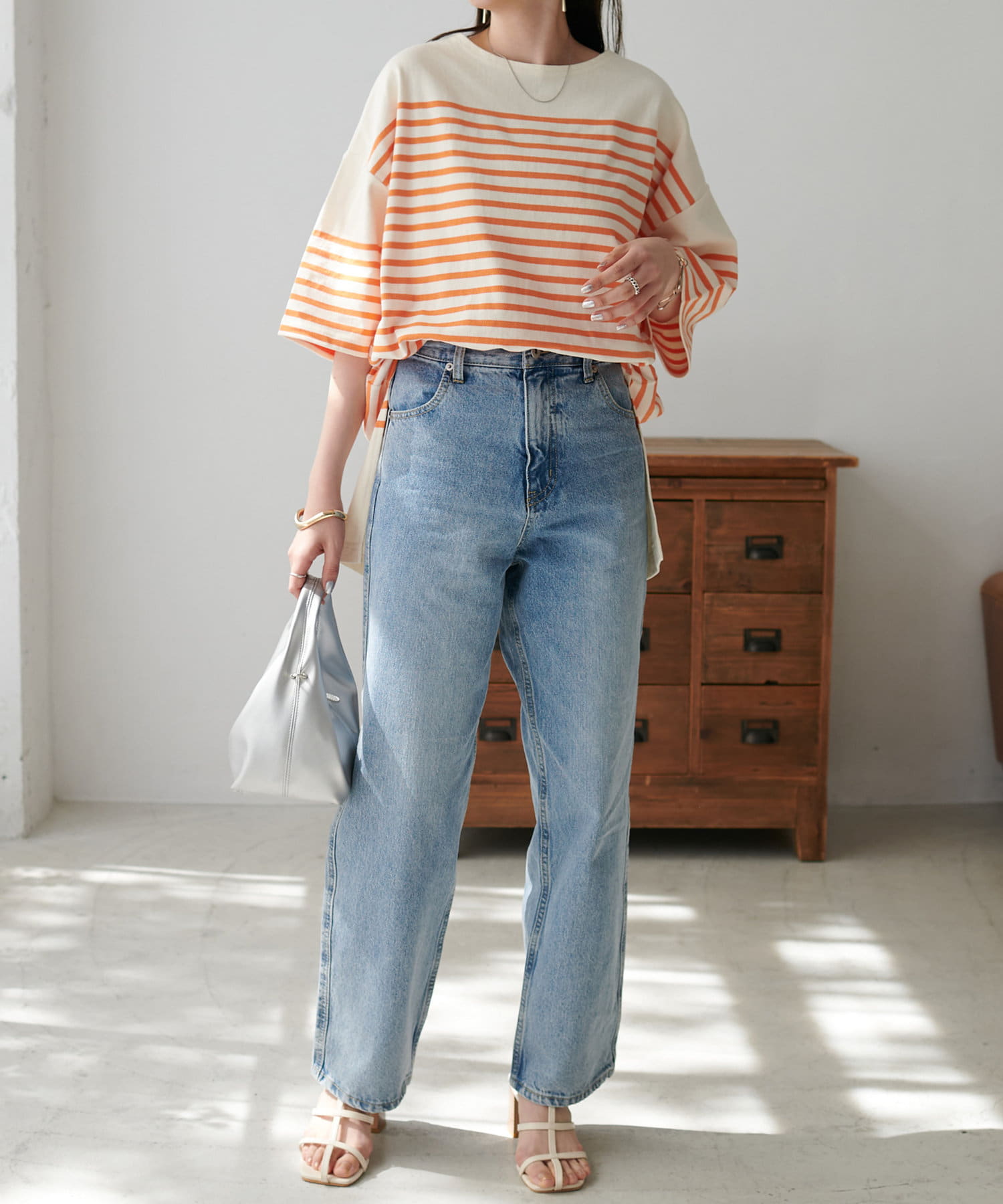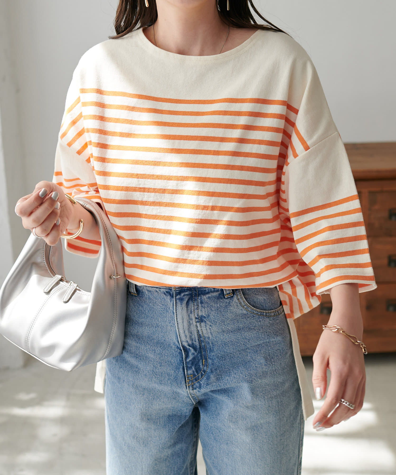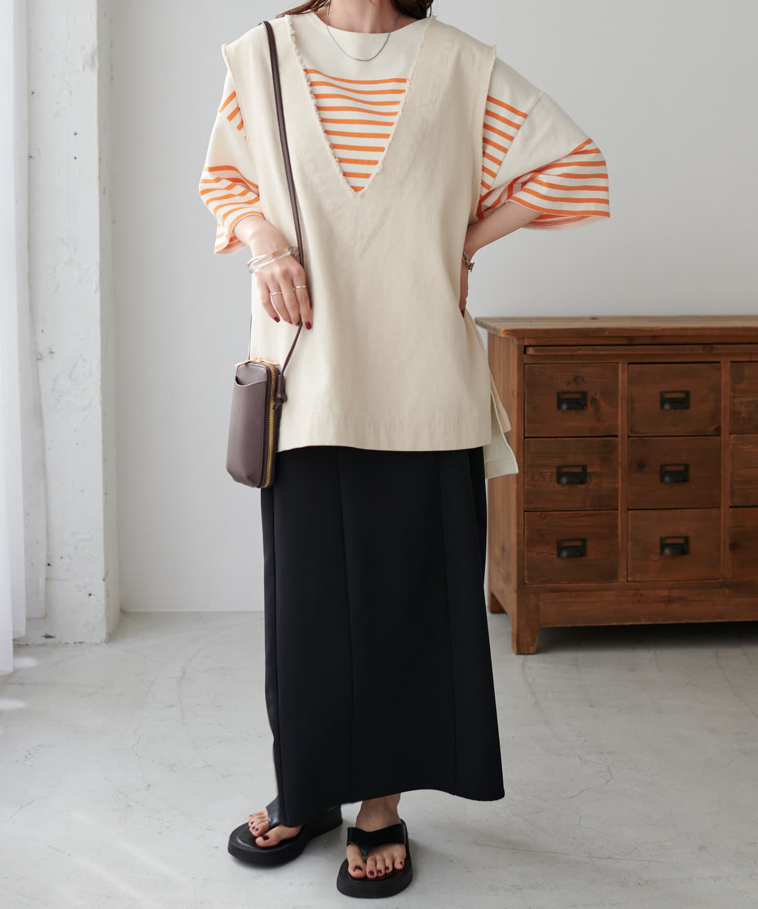 ベーシックなデニムはもちろん、女性らしいナロースカートとも好相性。前後差のある着丈で、トップスインでもアウトでも様になります。