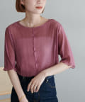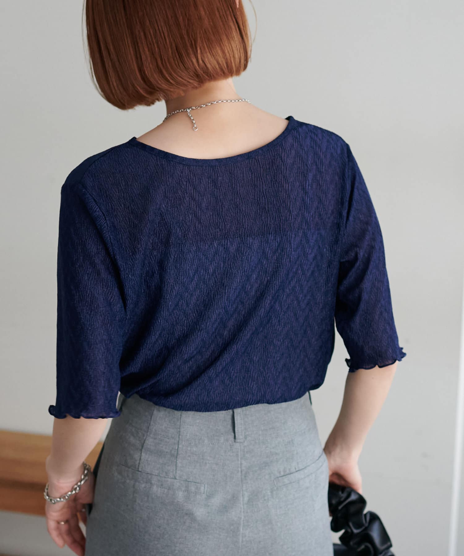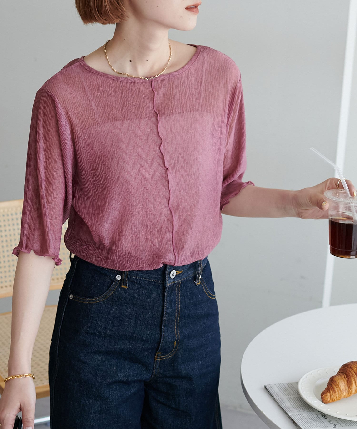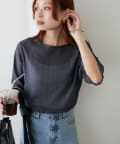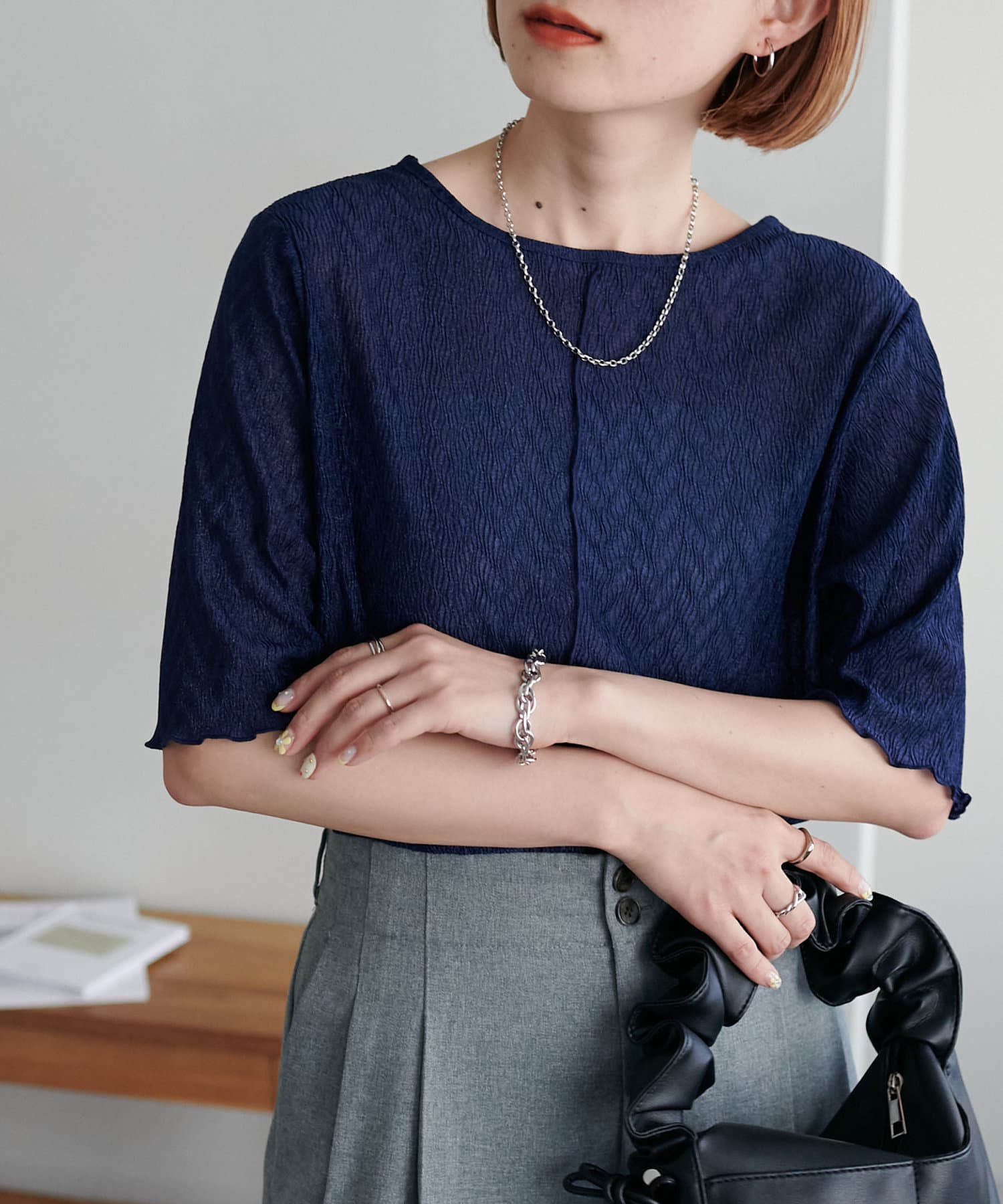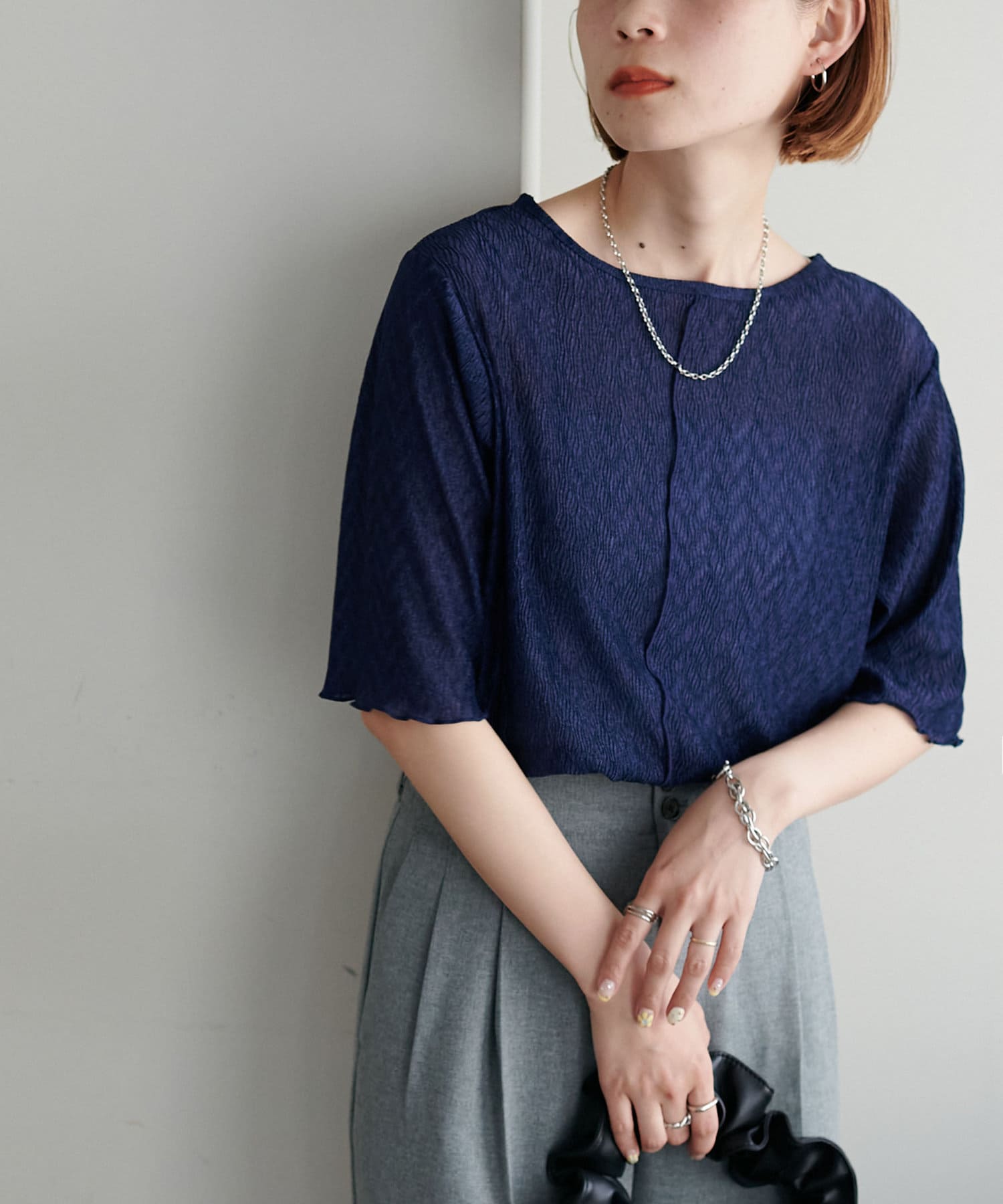 程よいラメ感とヨウリュウのような肌離れの良い生地が上品なシアーTシャツ。袖口と裾に施したプリーツがフェミニン感をプラス◎前後2WAY仕様で切り替え部分をフロントにしてもトレンド感のある着こなしに。シーズンにぴったりのヘルシー感高まる一枚です♪ベーシックなお色味に、ライトブルーの爽やかなカラーを加えた色展開も魅力の一つです。