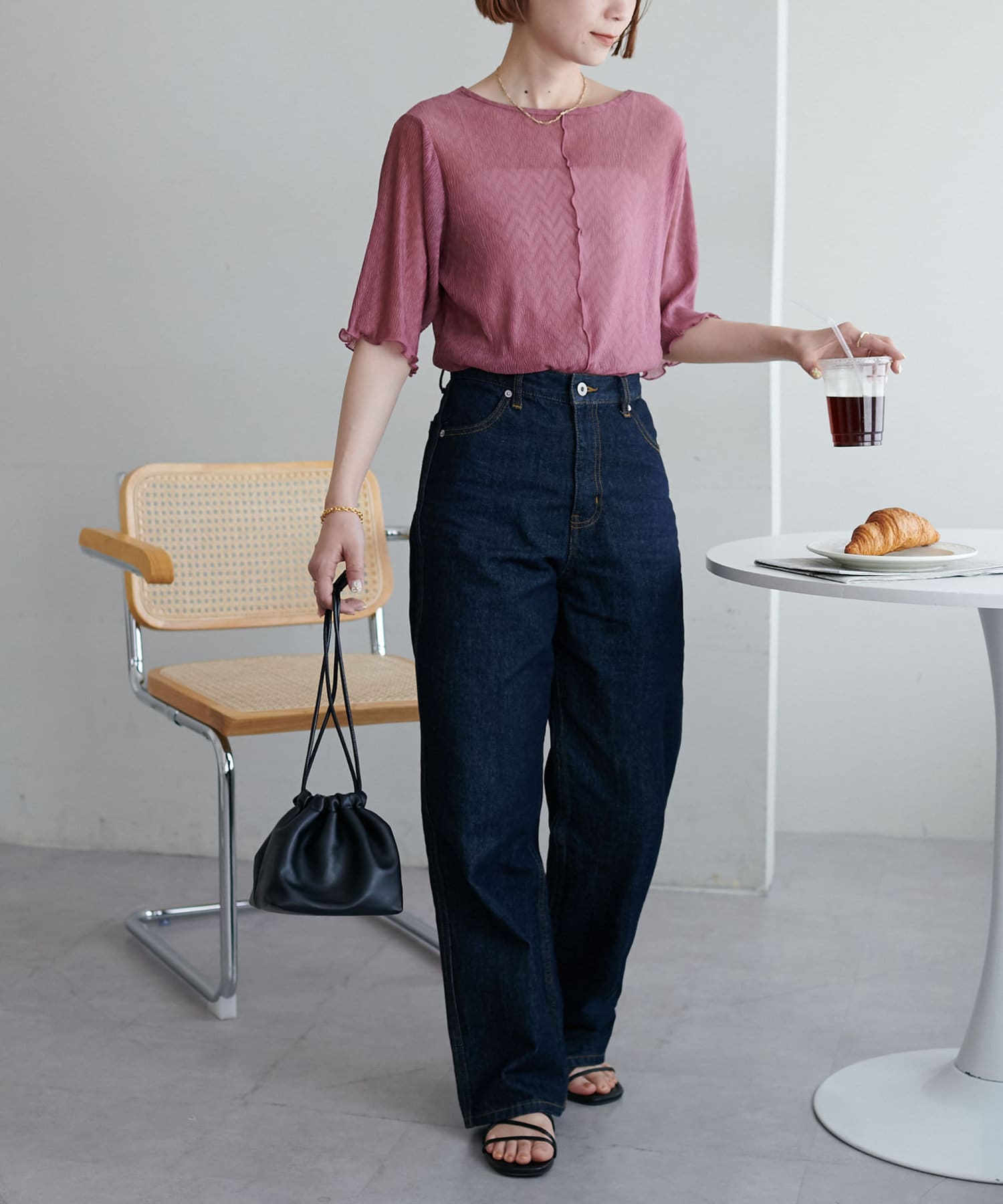 148cmスタッフ(Mサイズ着用): ヒップに軽くかかるくらいの丈で、インもアウトもキレイに決まります。透け感はありますが、プリーツがあることで体に張り付かず、涼しく着られました!