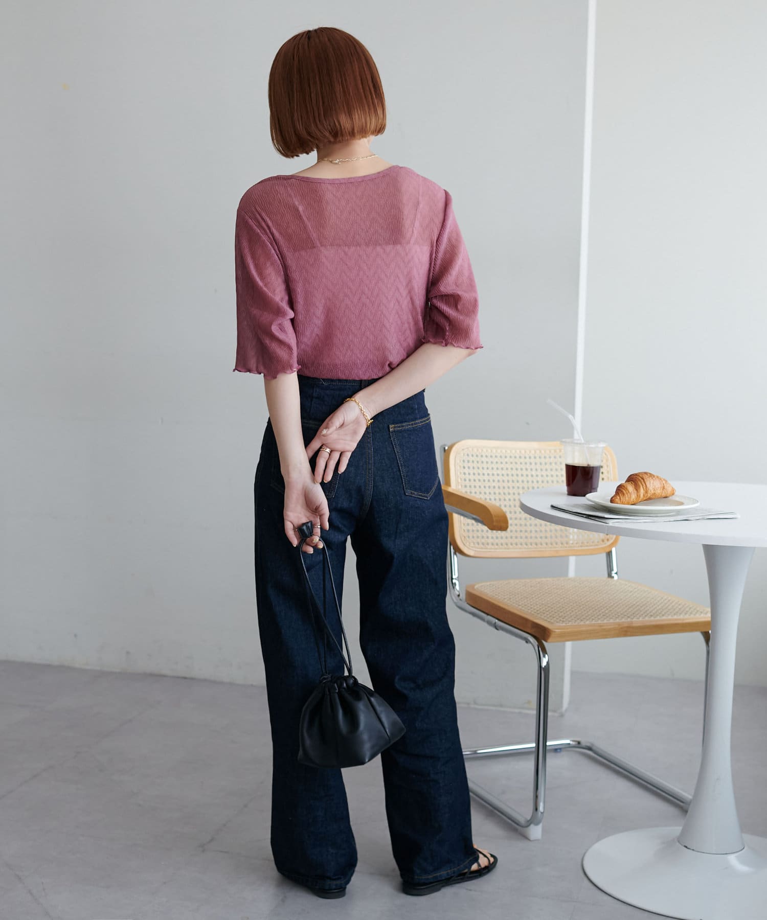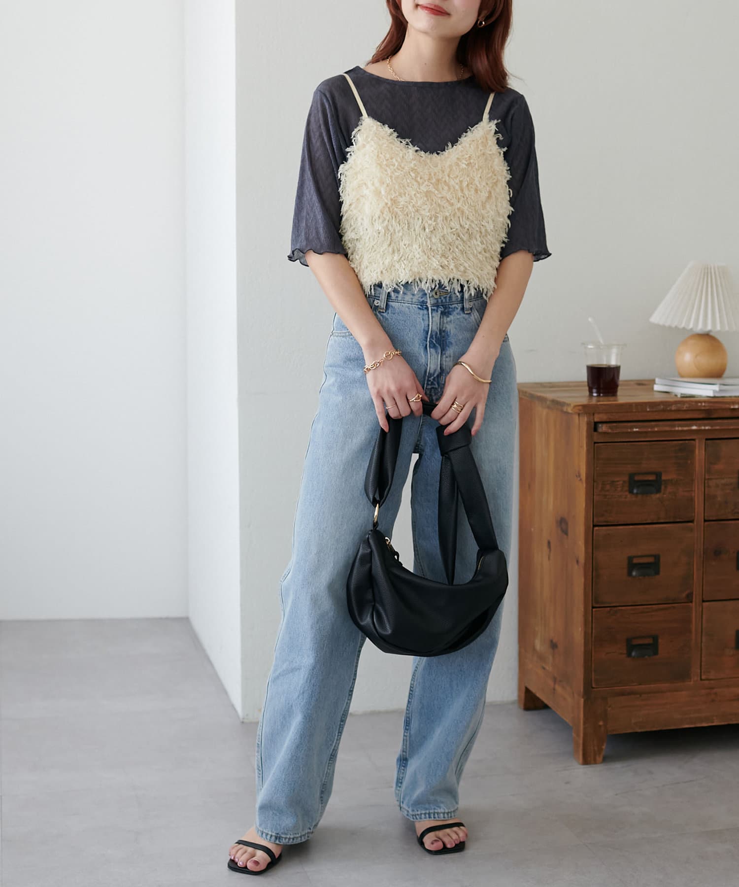 155cmスタッフ(Mサイズ着用):ラメ感も派手すぎず、顔まわりがパッと明るく見える印象。前後で雰囲気が変わるので、毎日のコーデに取り入れやすいです♪