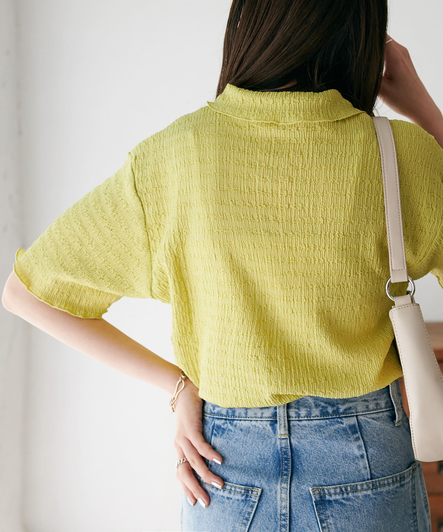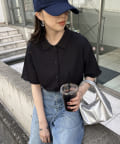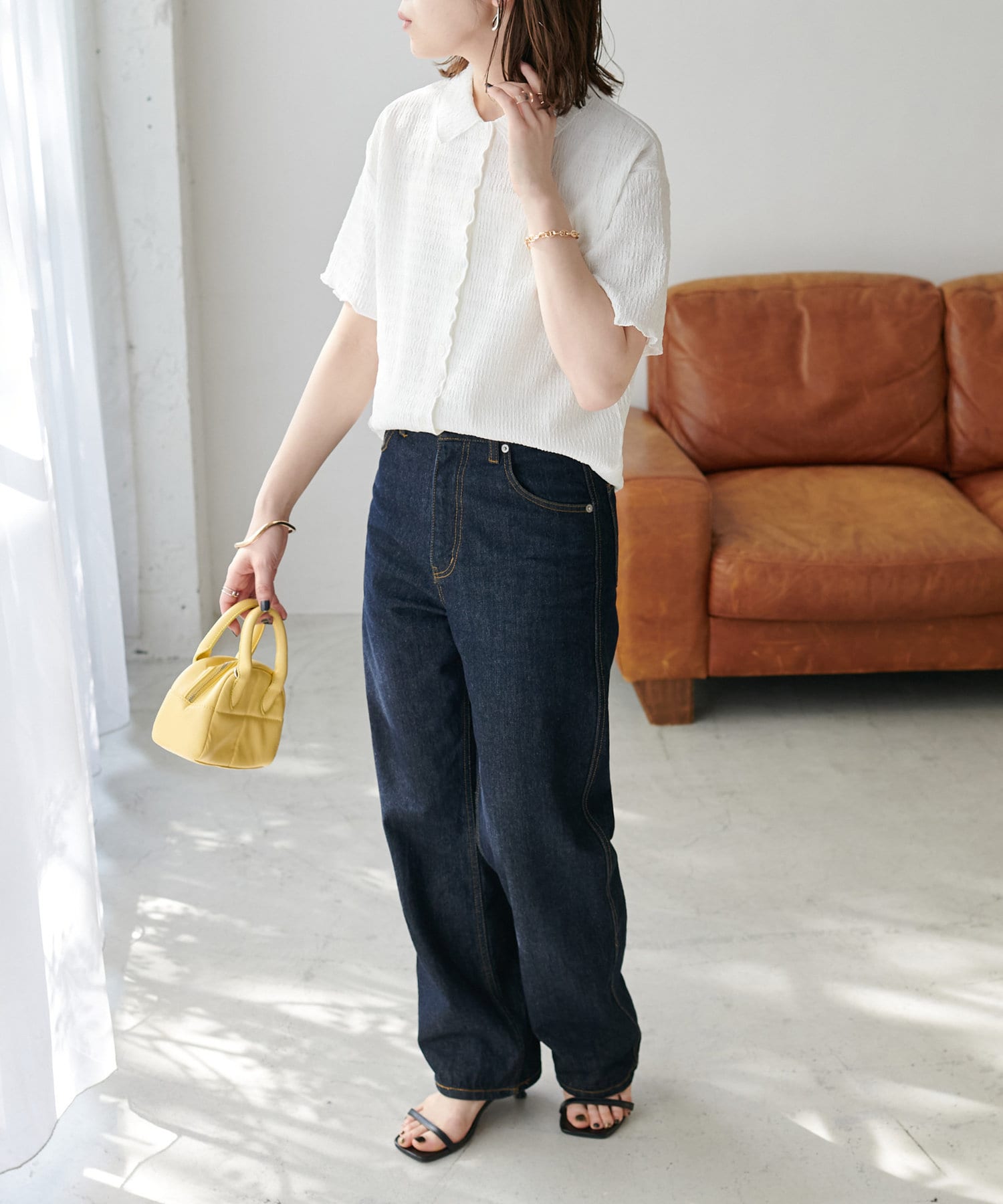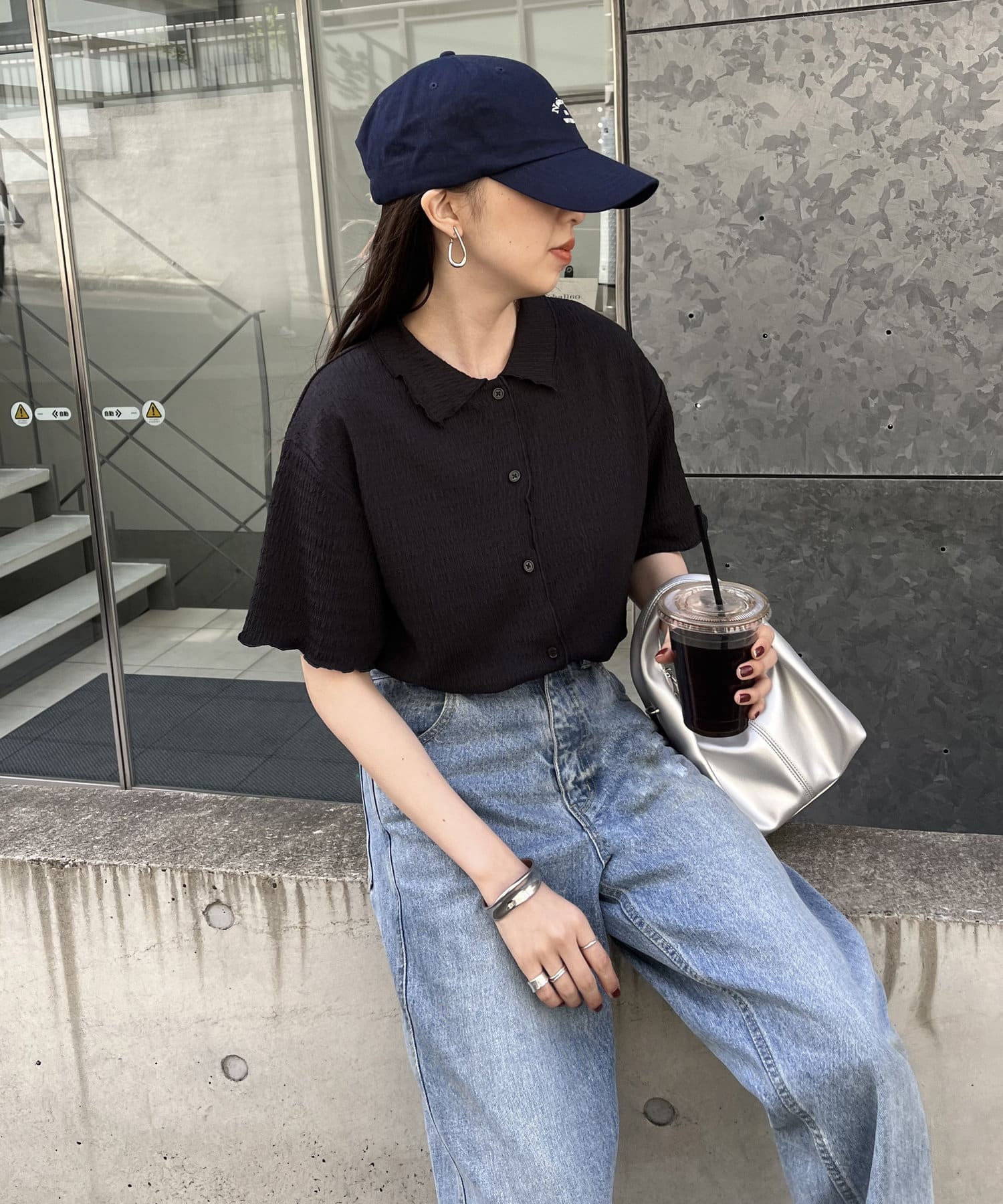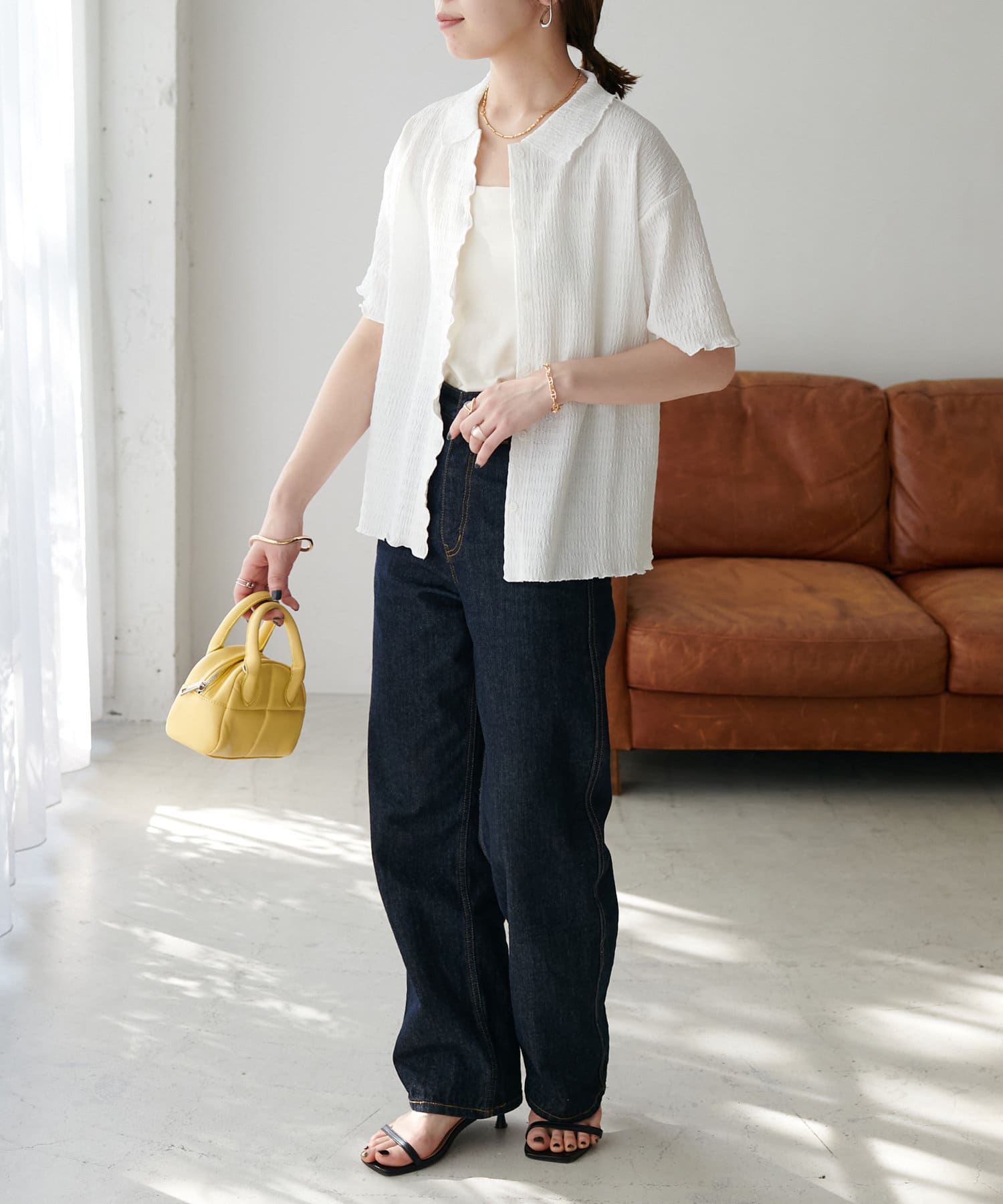 160cmスタッフ(Fサイズ着用):ジャーガード素材は見た目より軽く、真夏でもさらっと着られそうです♡コンパクトめの丈感なので、ハイウエストボトムとの相性も抜群でした♪
