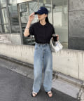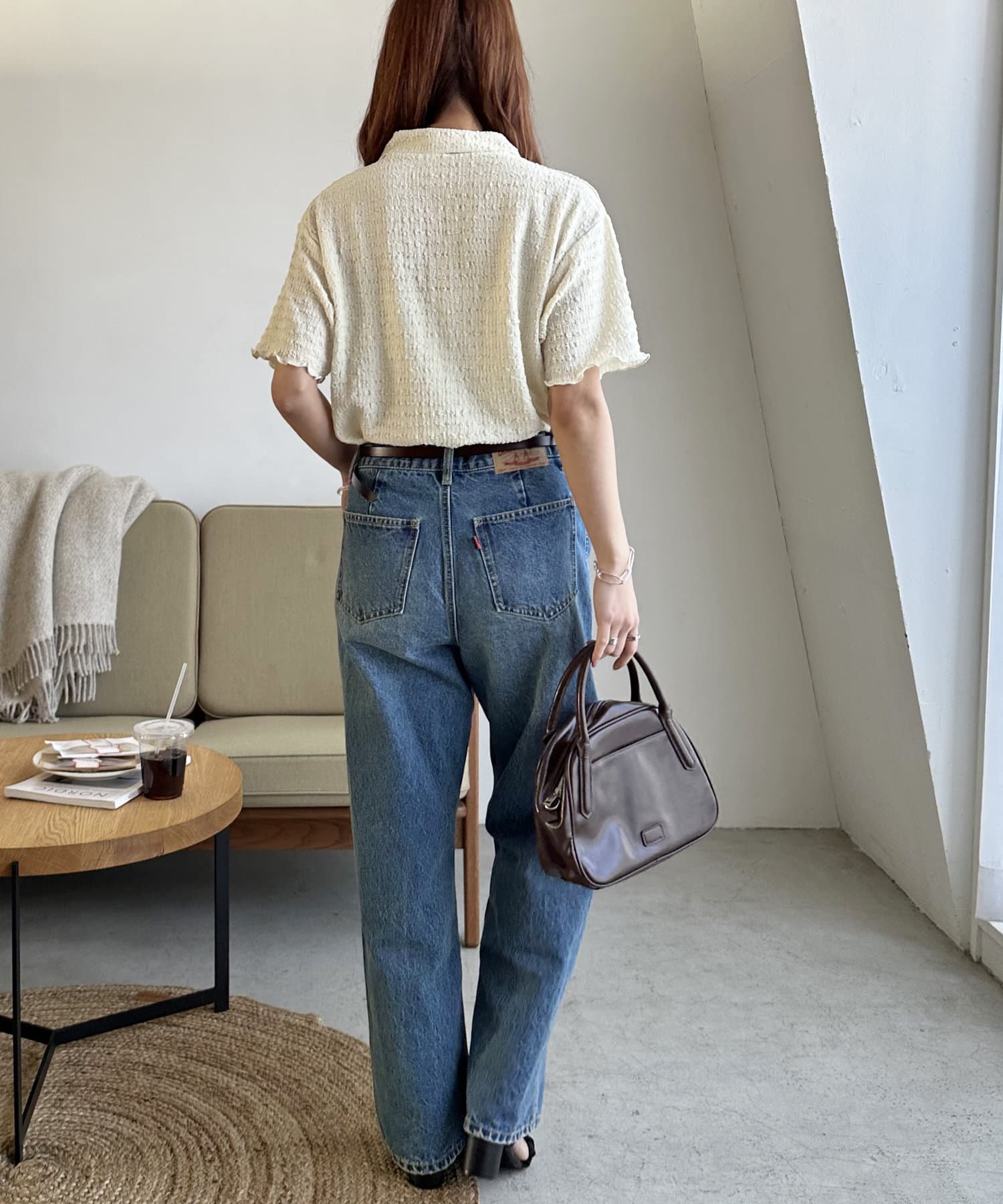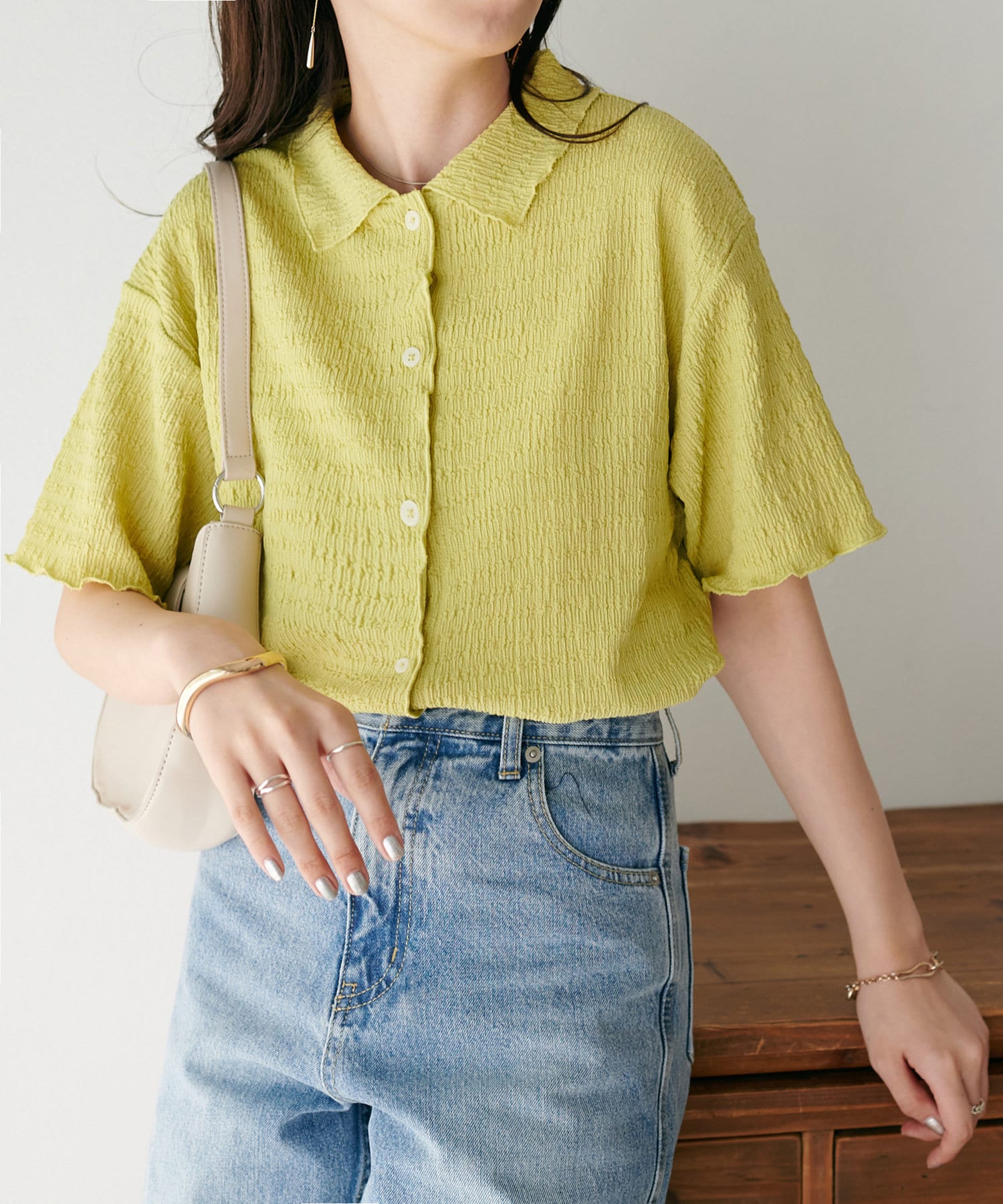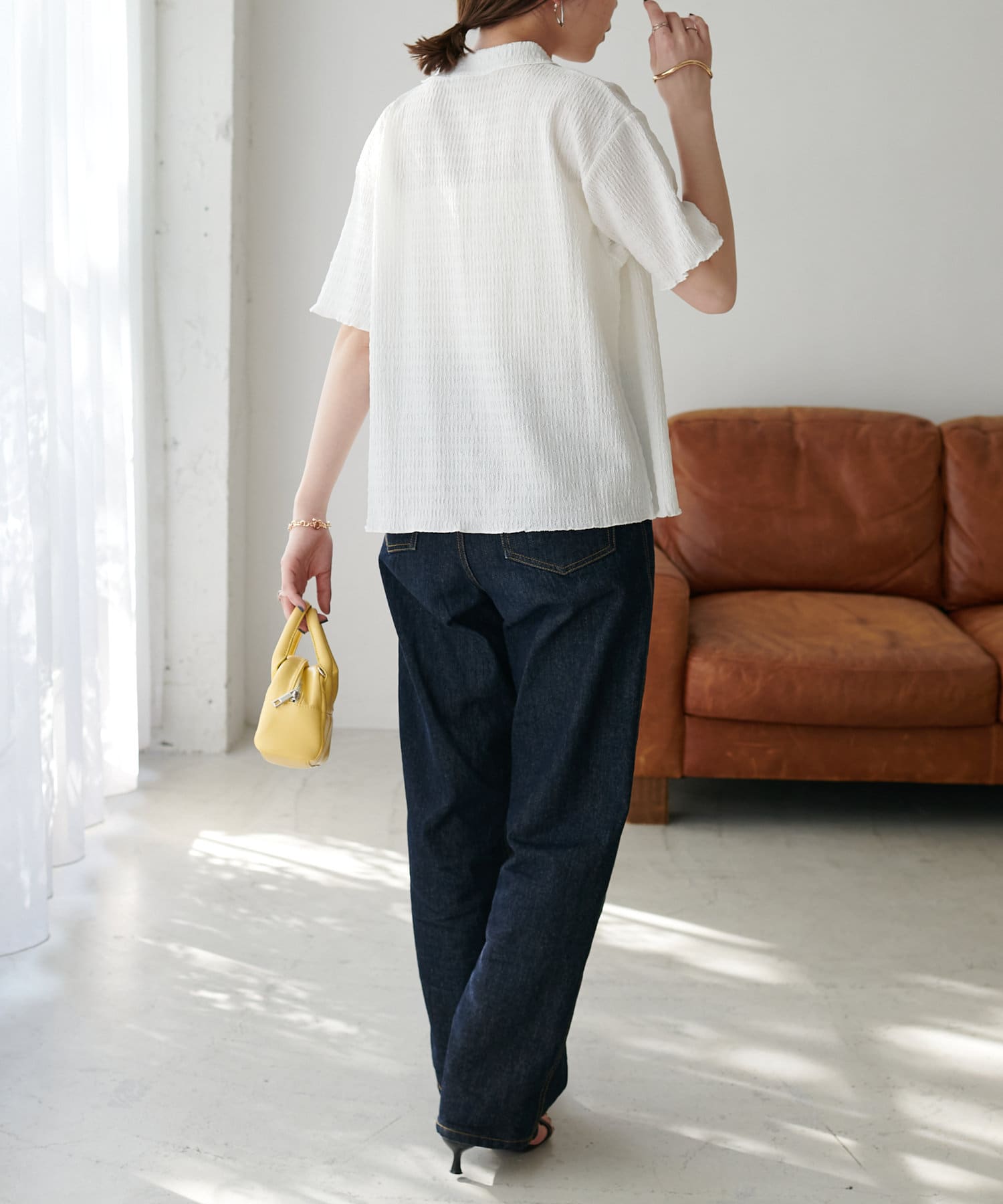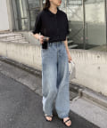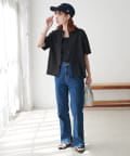 160cmスタッフ(Fサイズ着用):ジャーガード素材は見た目より軽く、真夏でもさらっと着られそうです♡コンパクトめの丈感なので、ハイウエストボトムとの相性も抜群でした♪