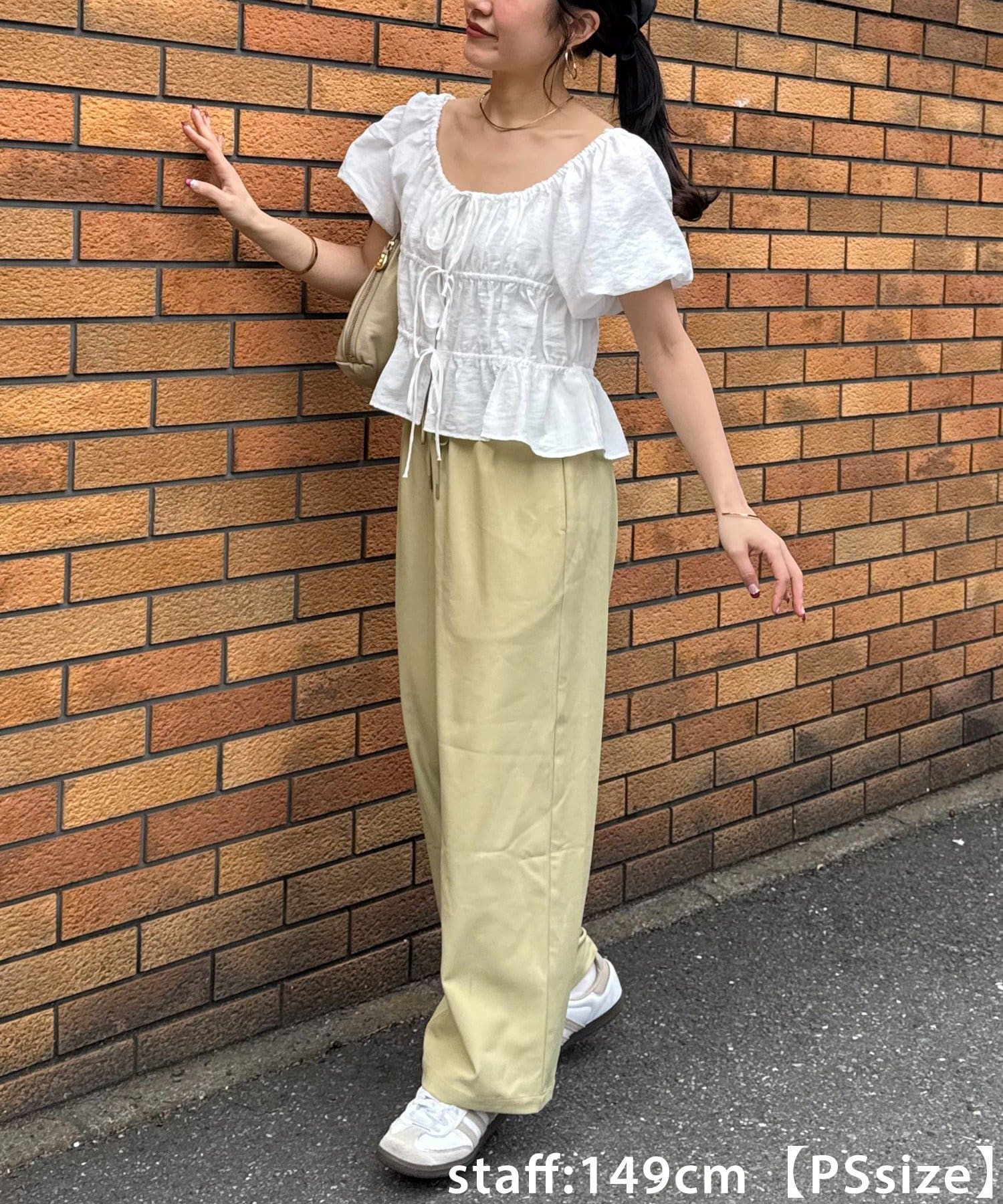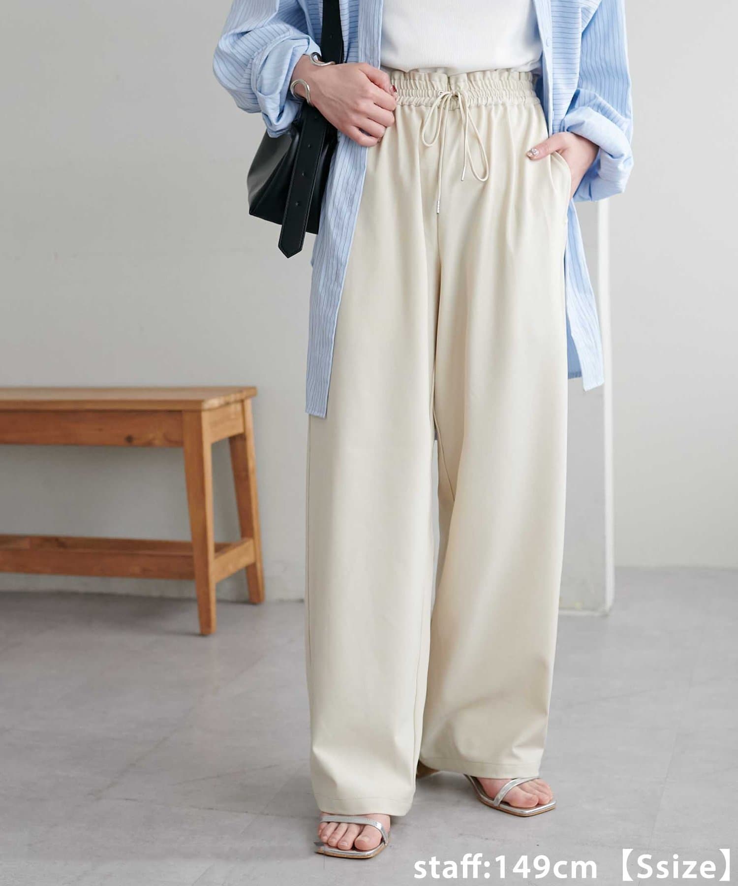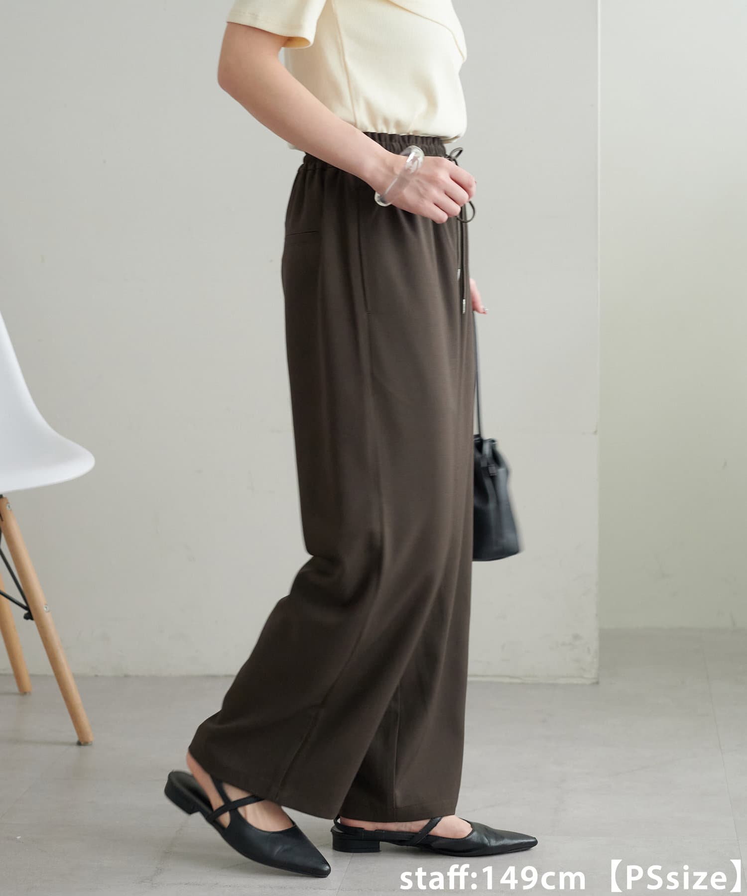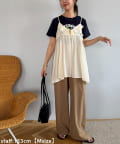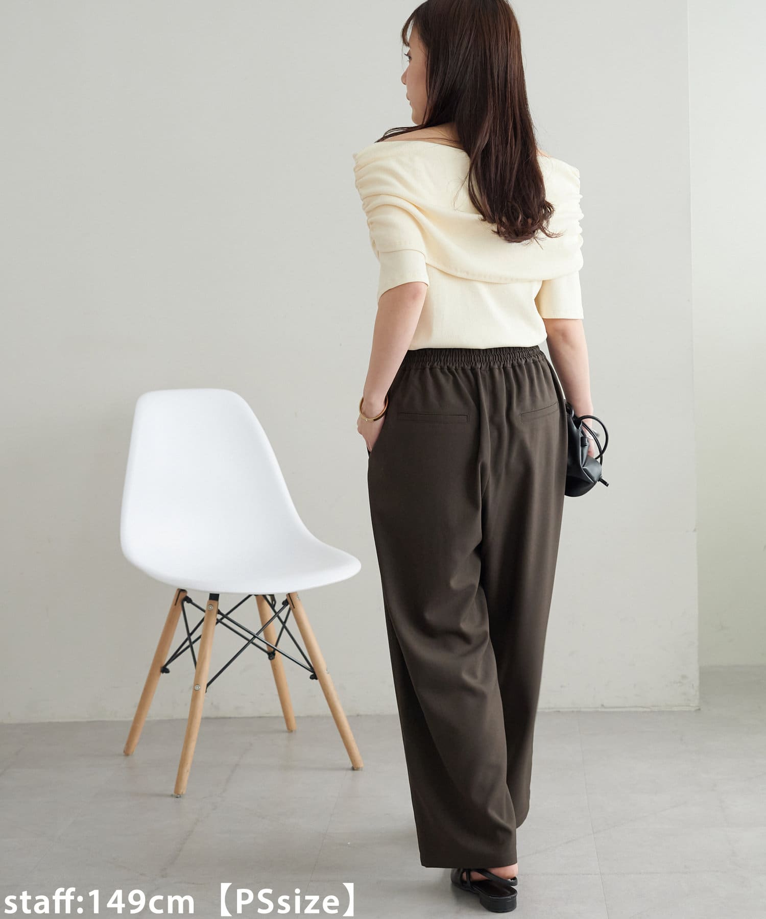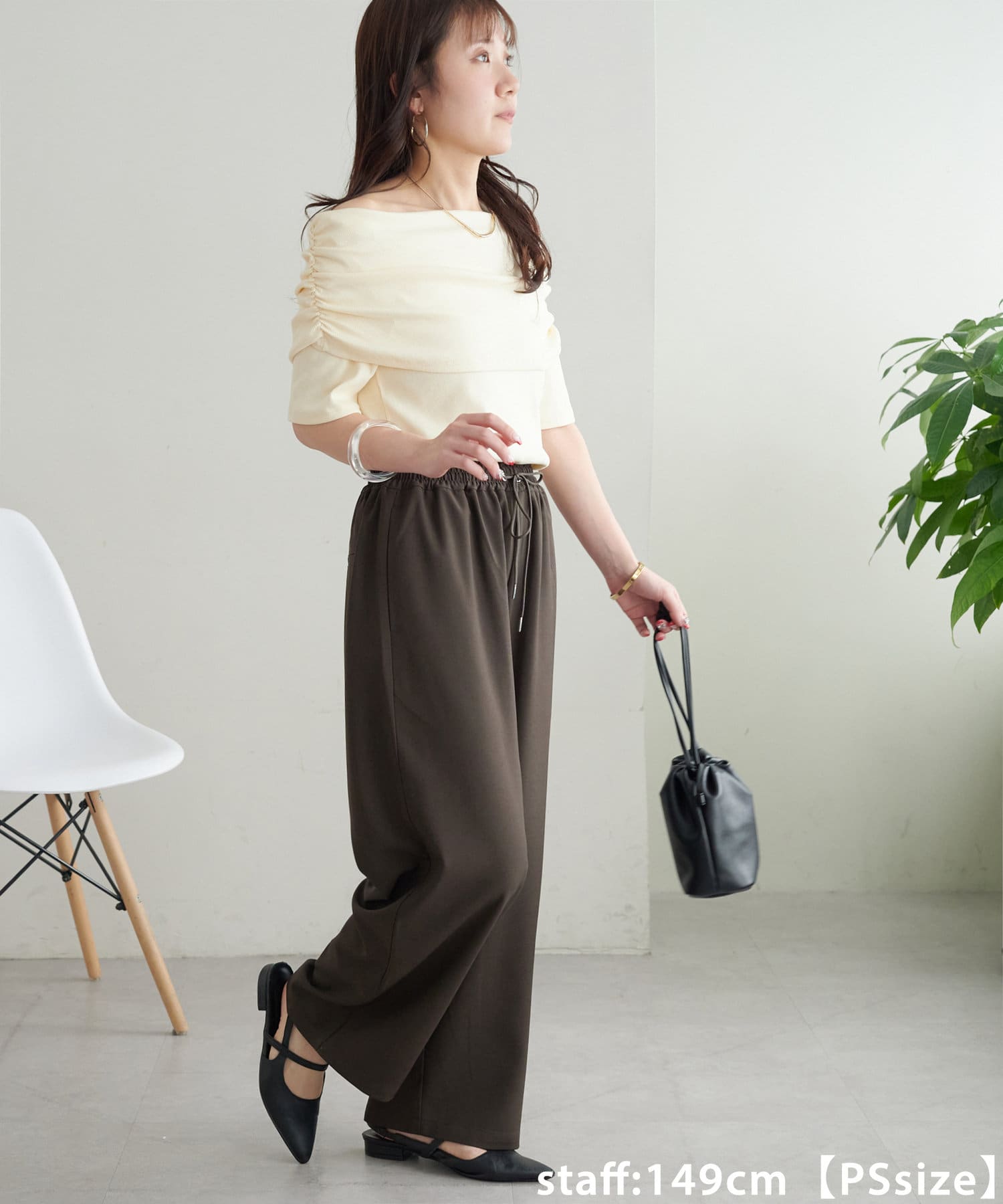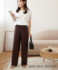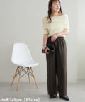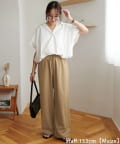 149cmスタッフ(Sサイズ着用):腰回りにギャザーが入っていることで、きれいな落ち感が出るのですっきりとした印象になります。