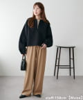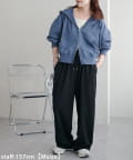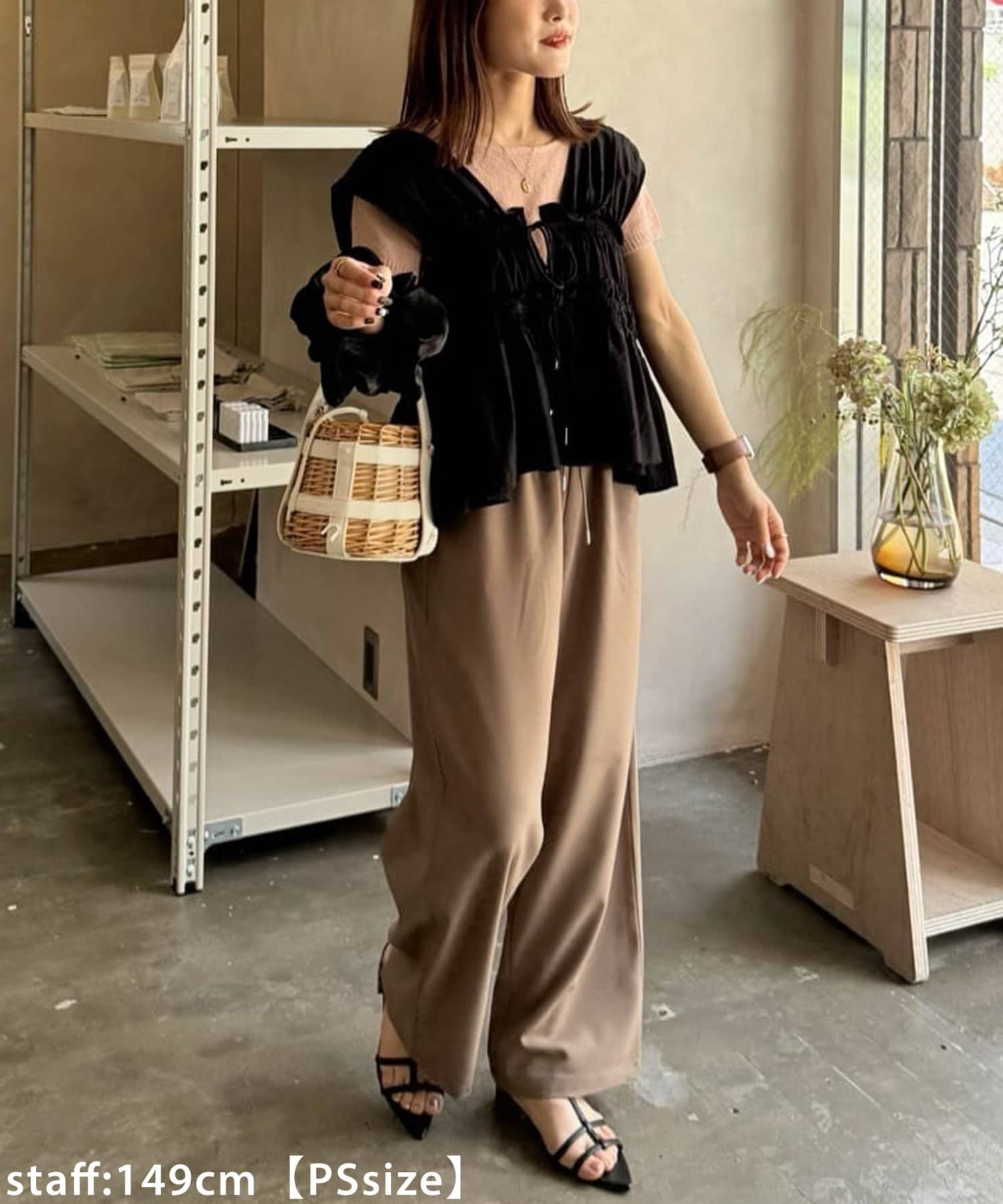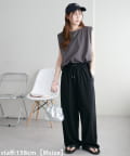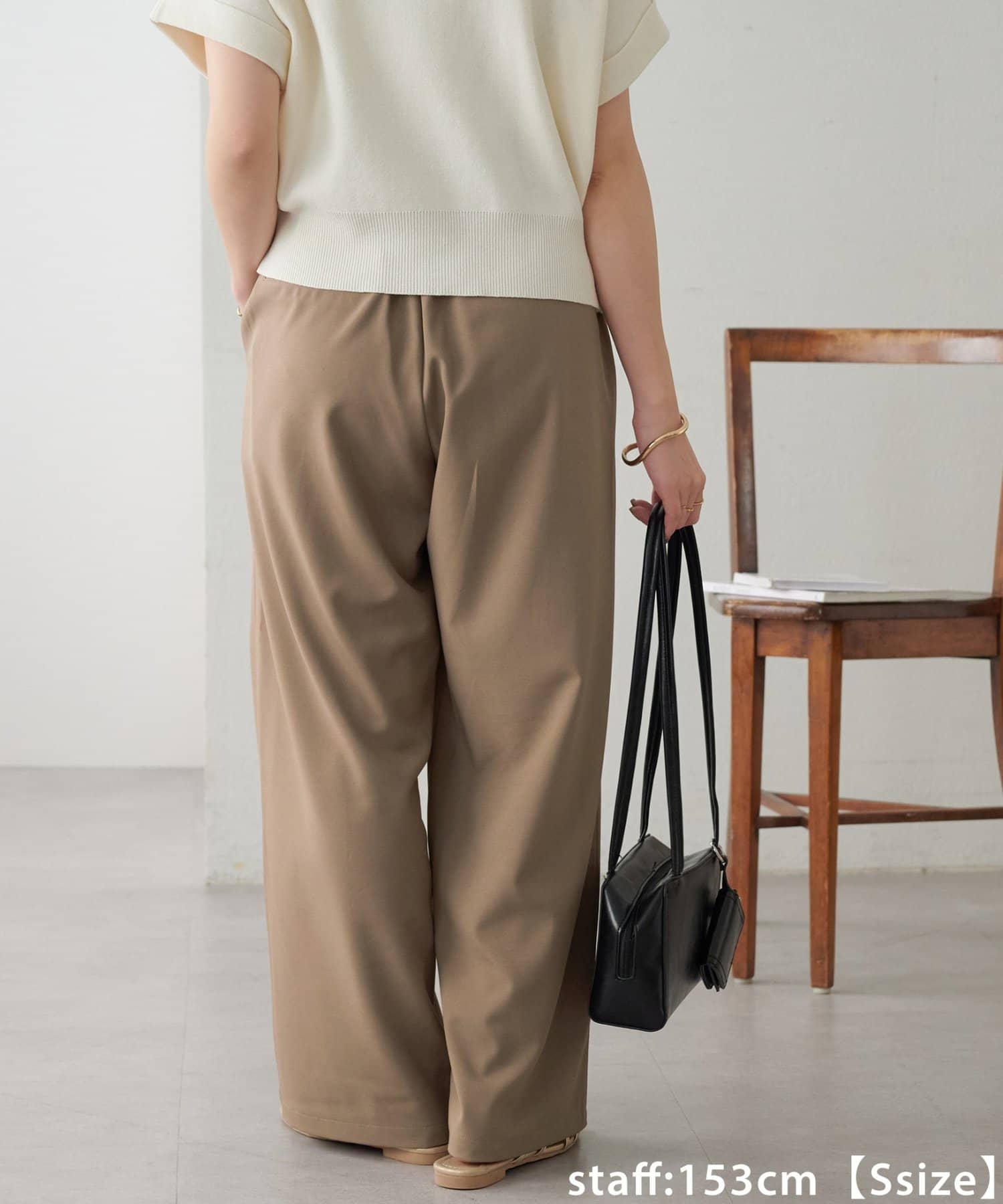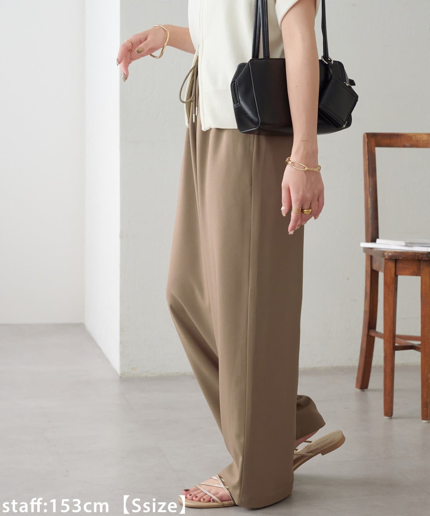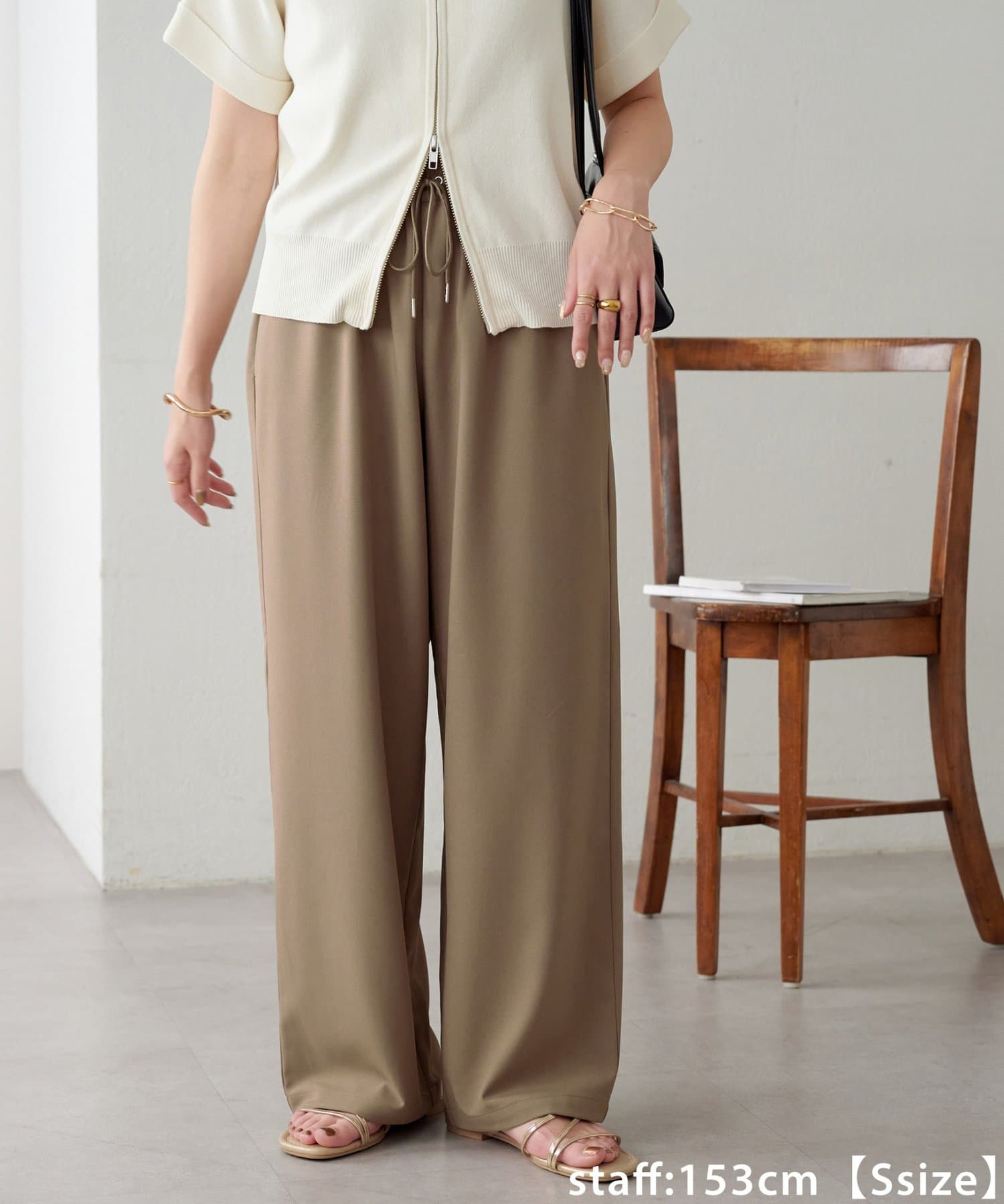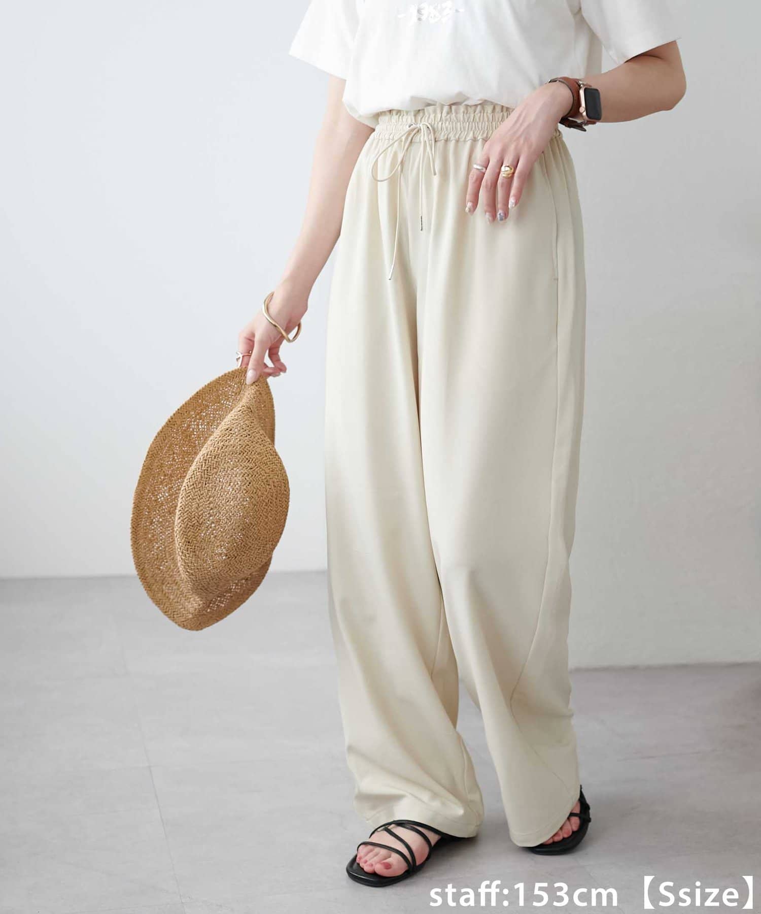 149cmスタッフ(Sサイズ着用):腰回りにギャザーが入っていることで、きれいな落ち感が出るのですっきりとした印象になります。