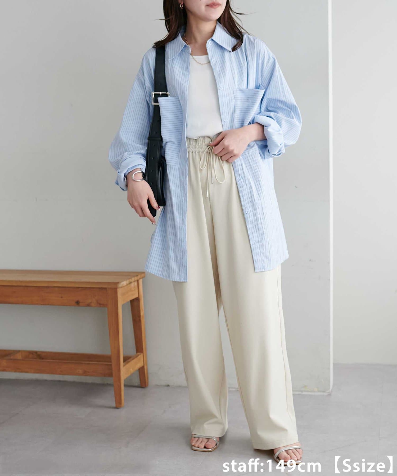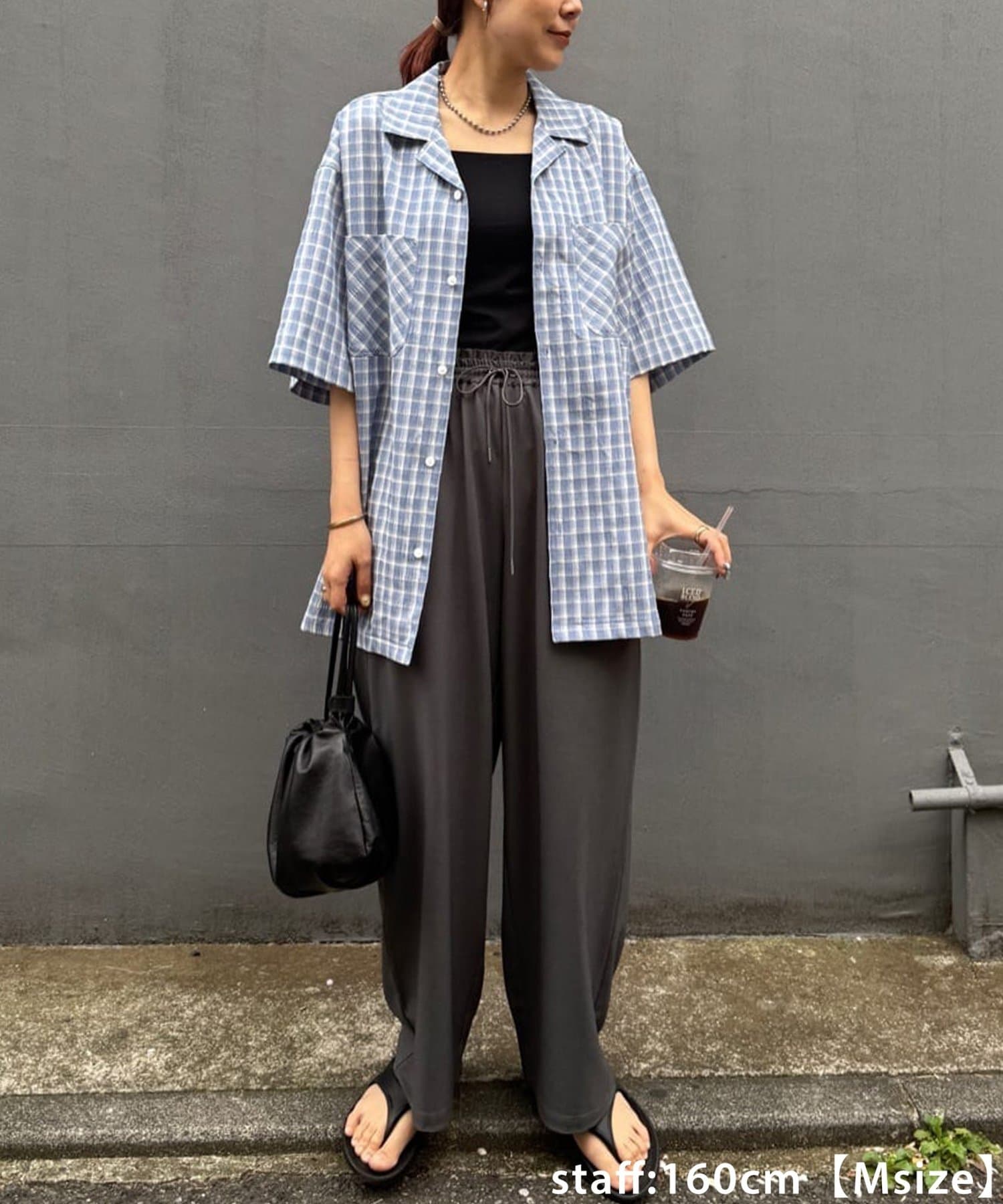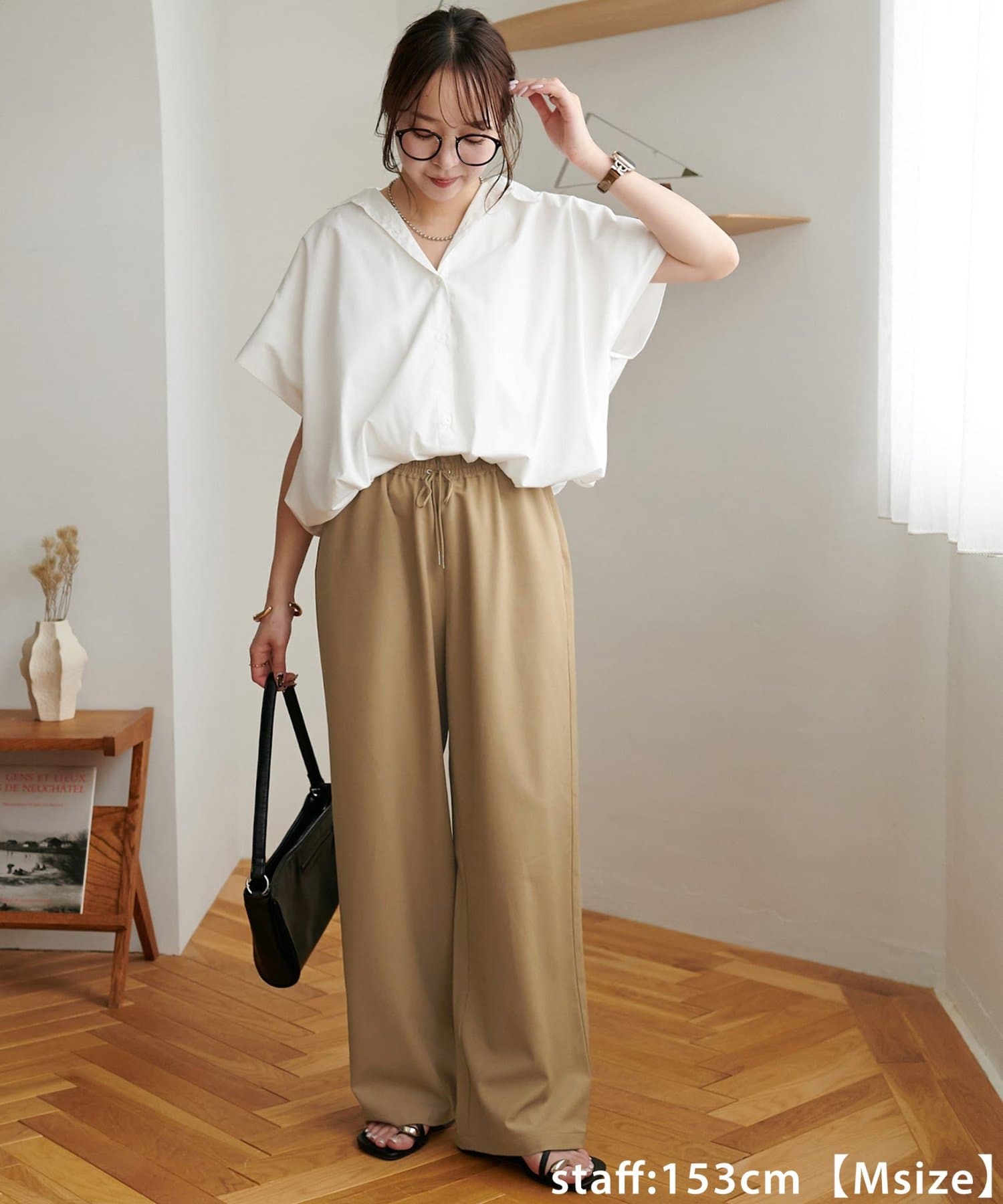 159cmスタッフ(Mサイズ着用):ストンと落ちる生地感がスタイル良く見せてくれて、生地感はサラッとしているので秋口まで着れますよ◎