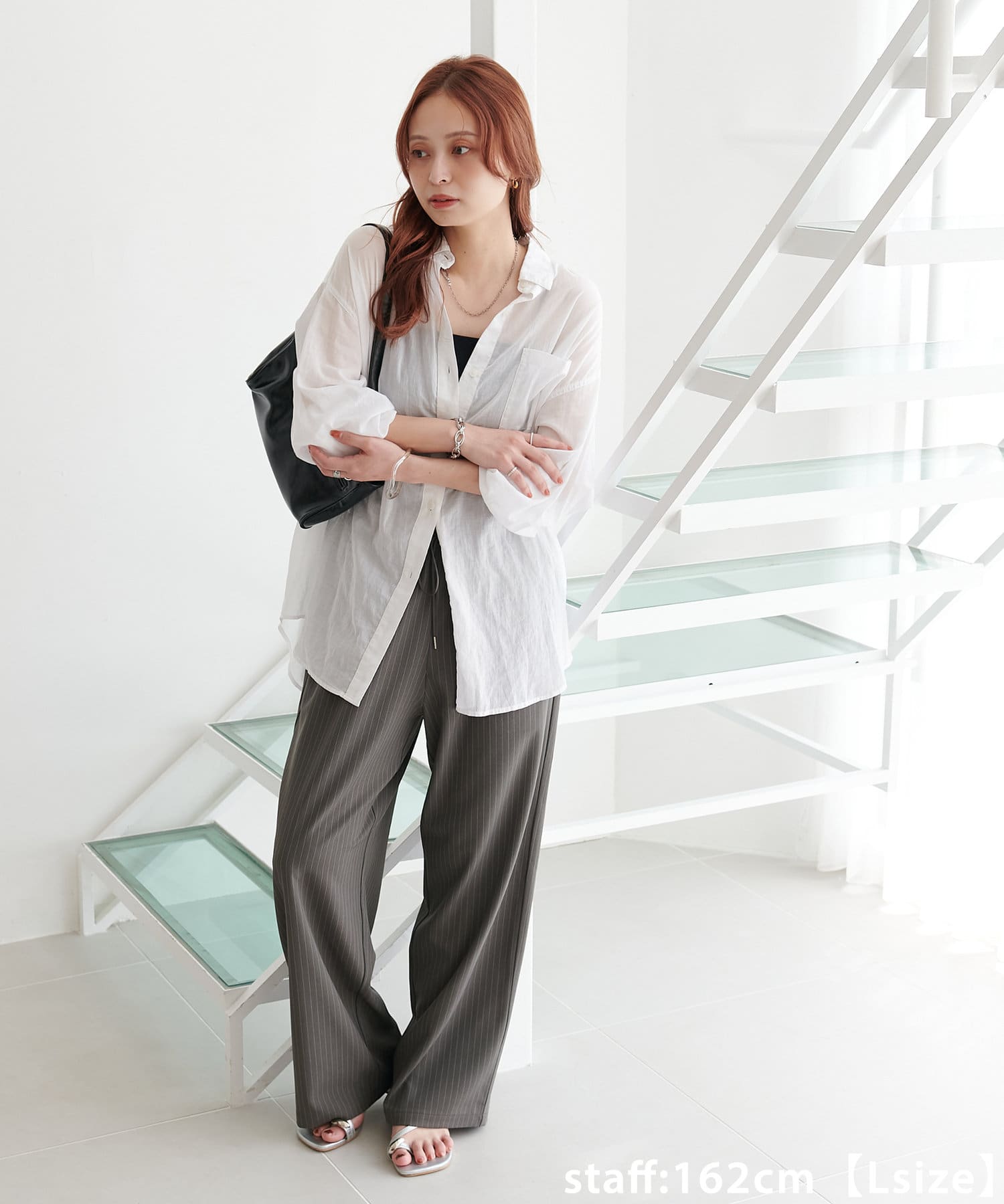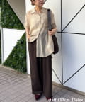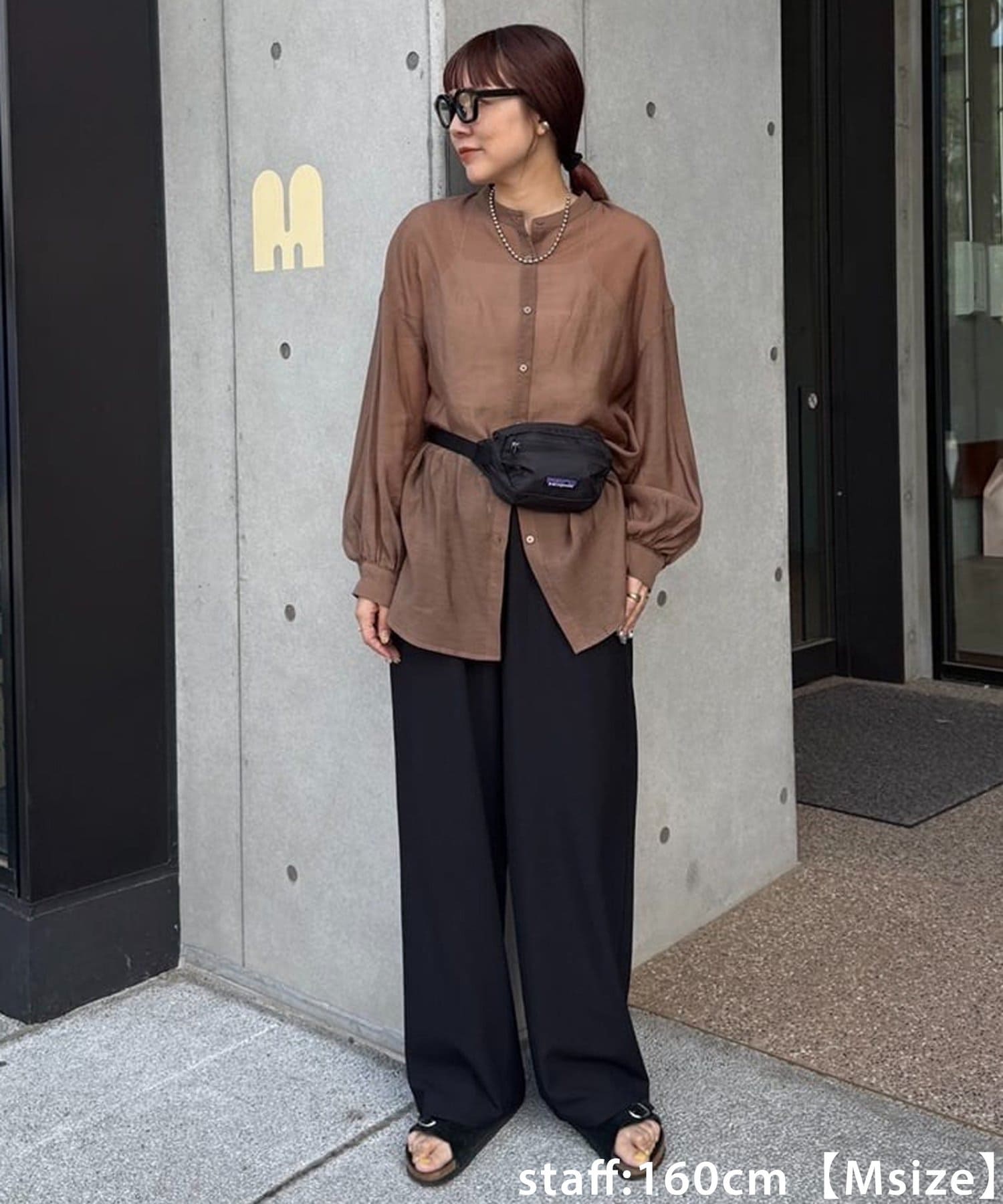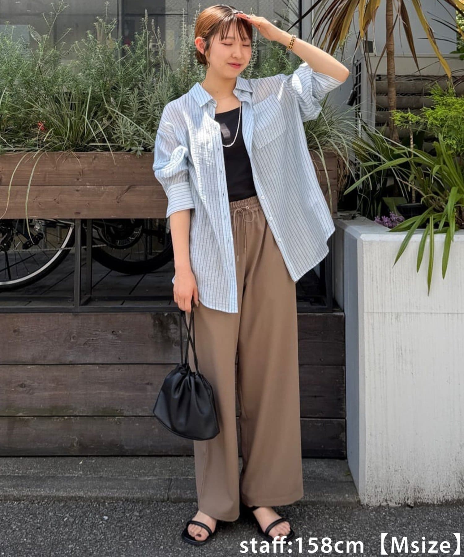 159cmスタッフ(Mサイズ着用):ストンと落ちる生地感がスタイル良く見せてくれて、生地感はサラッとしているので秋口まで着れますよ◎