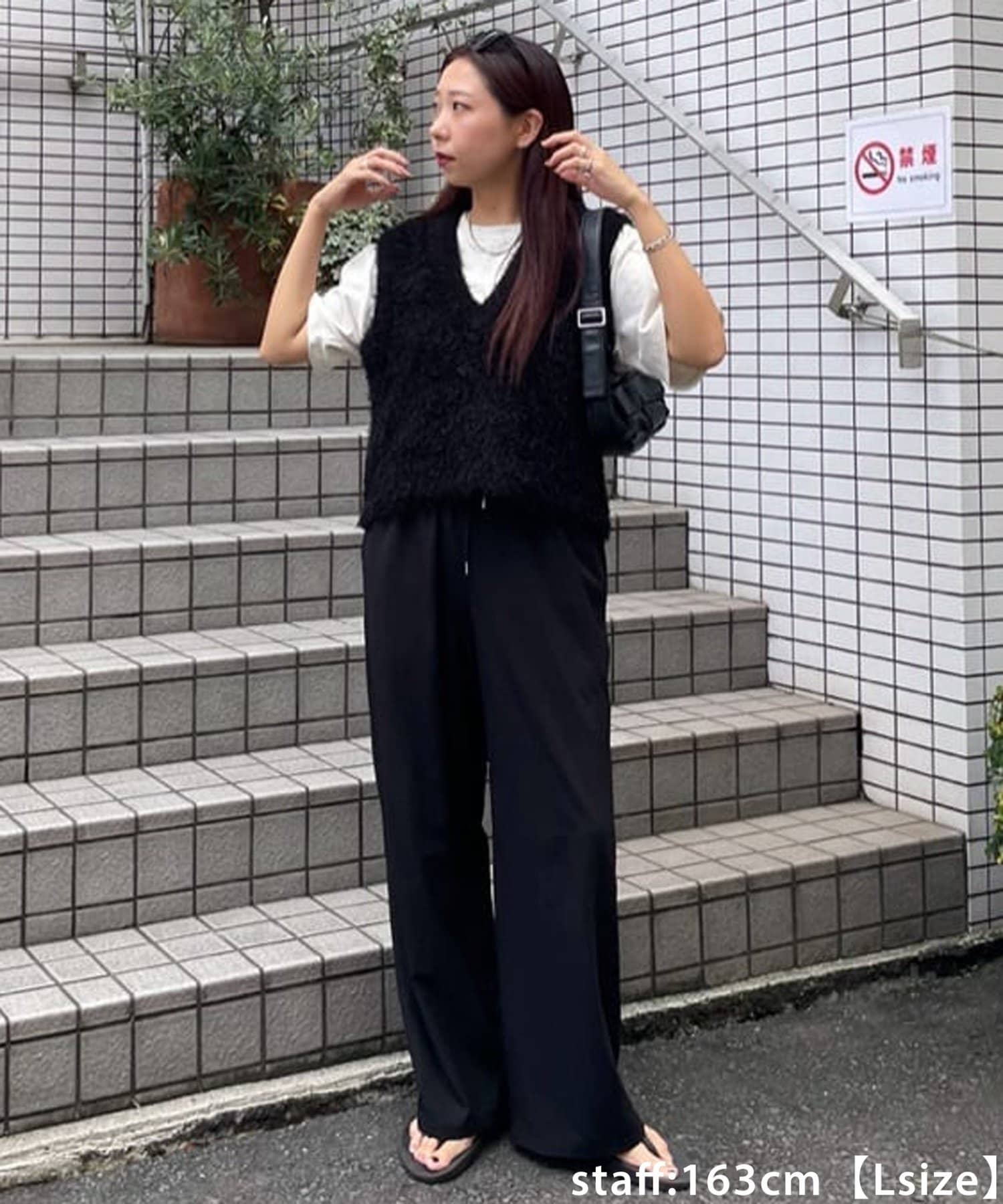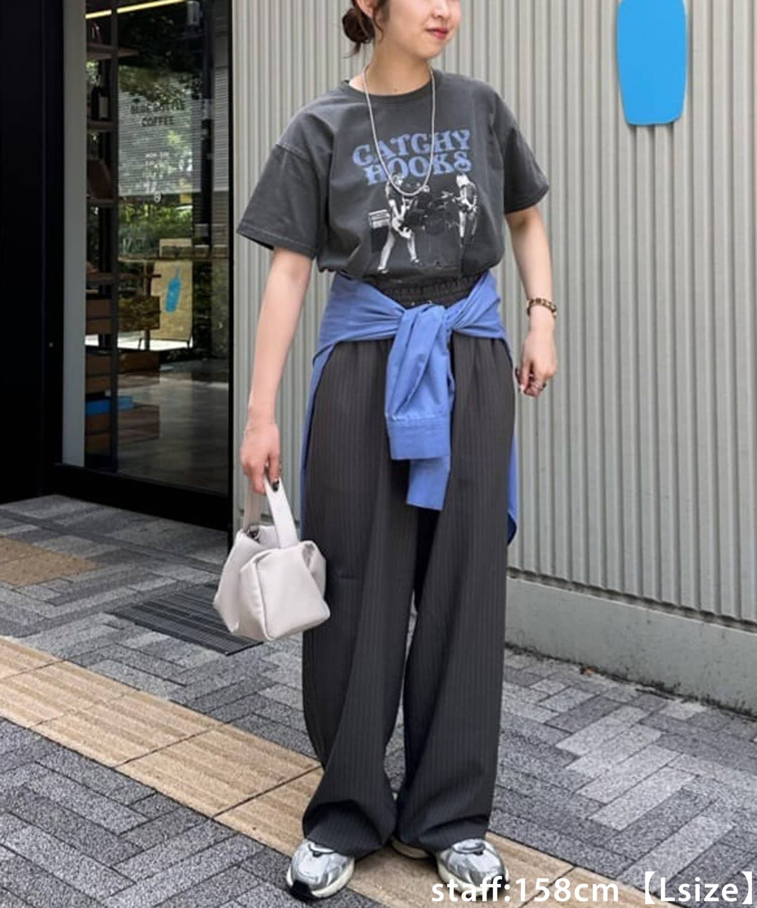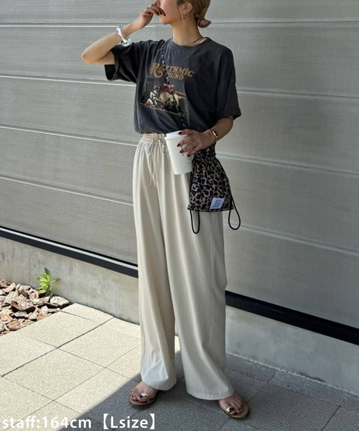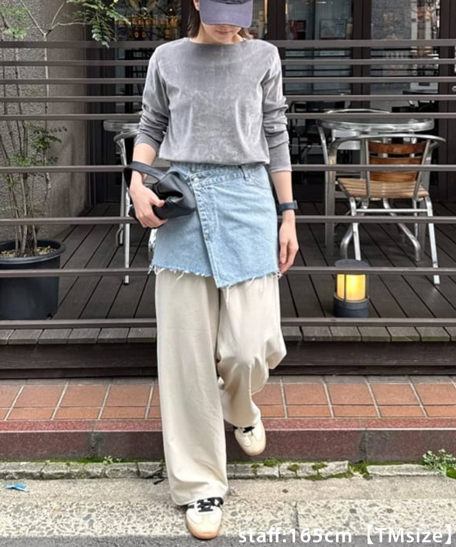 167cmスタッフ(Lサイズ着用):骨ストでお尻と太ももが大きいのですが、ゆるっとしたサイズ感なのでお尻や太ももを上手くカモフラージュしてくれてトップスも選ばずに着こなせました。