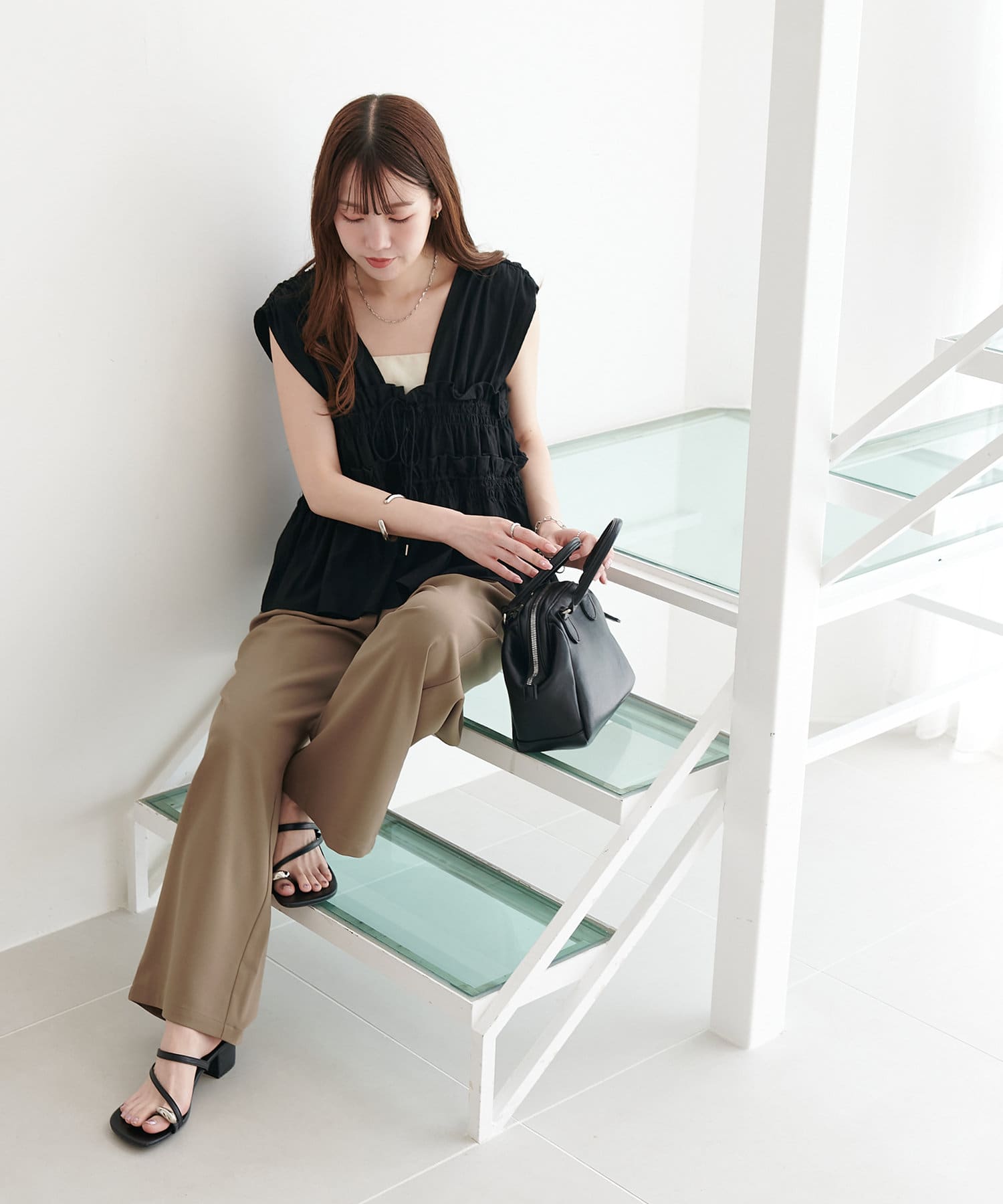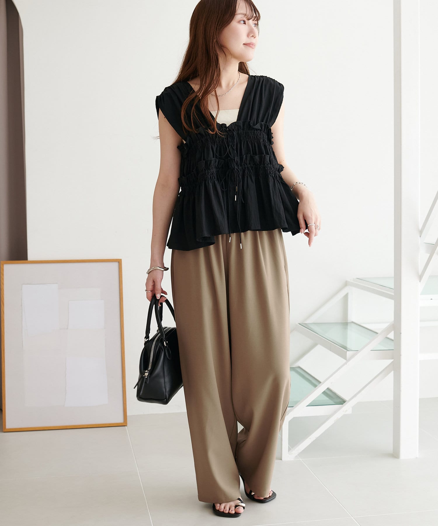 フロントに施したギャザーがマイナス3キロ見えの秘訣で、すとんと落ちるきれいなシルエットを演出してくれます。
