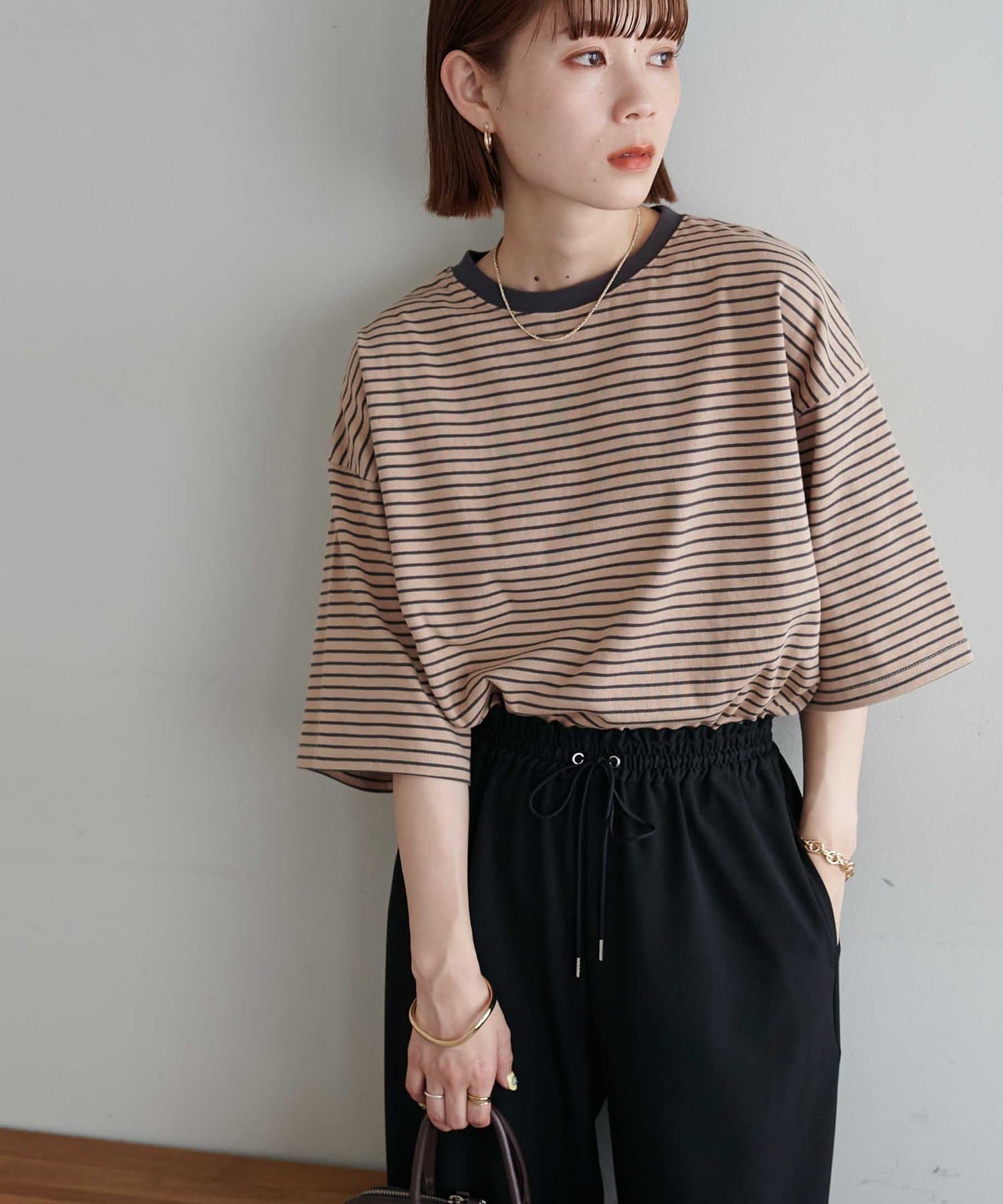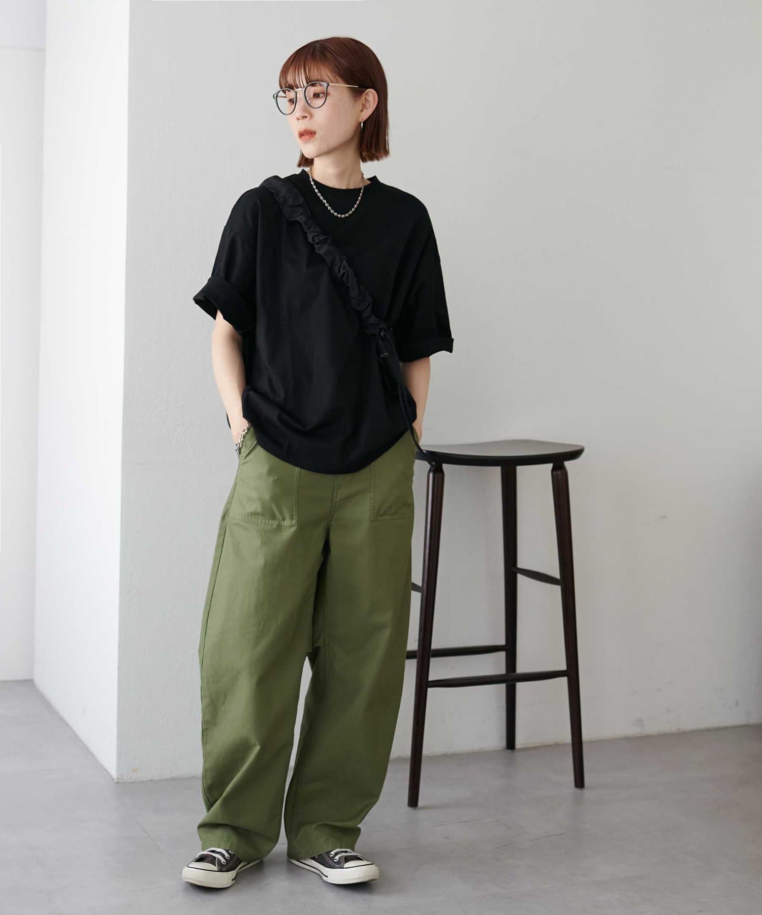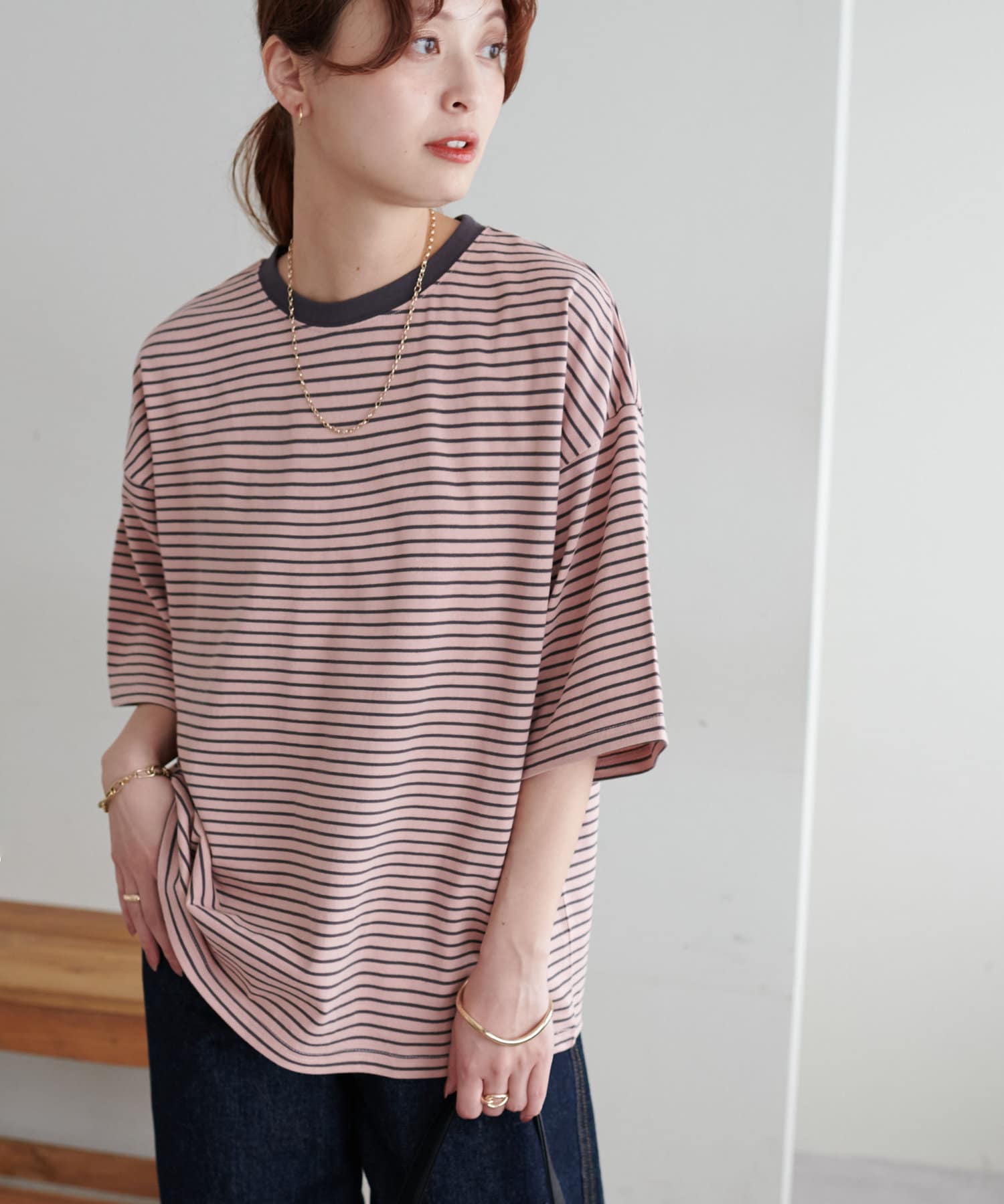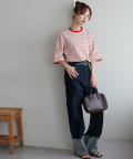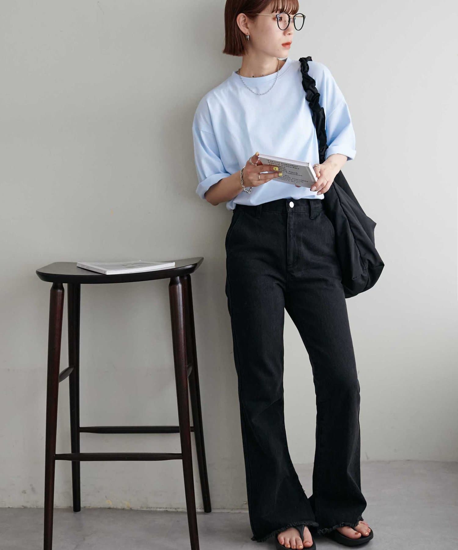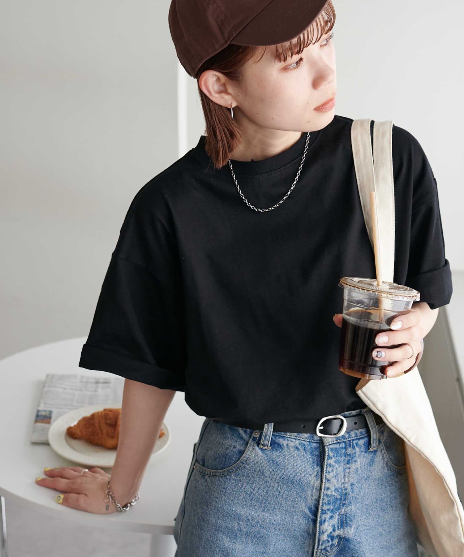 ・155cmスタッフ(Mサイズ着用):ゆとりのあるTシャツで着るだけでこなれ感を演出できます♪シンプルなので小物次第でコーデの雰囲気を変えられます◎
