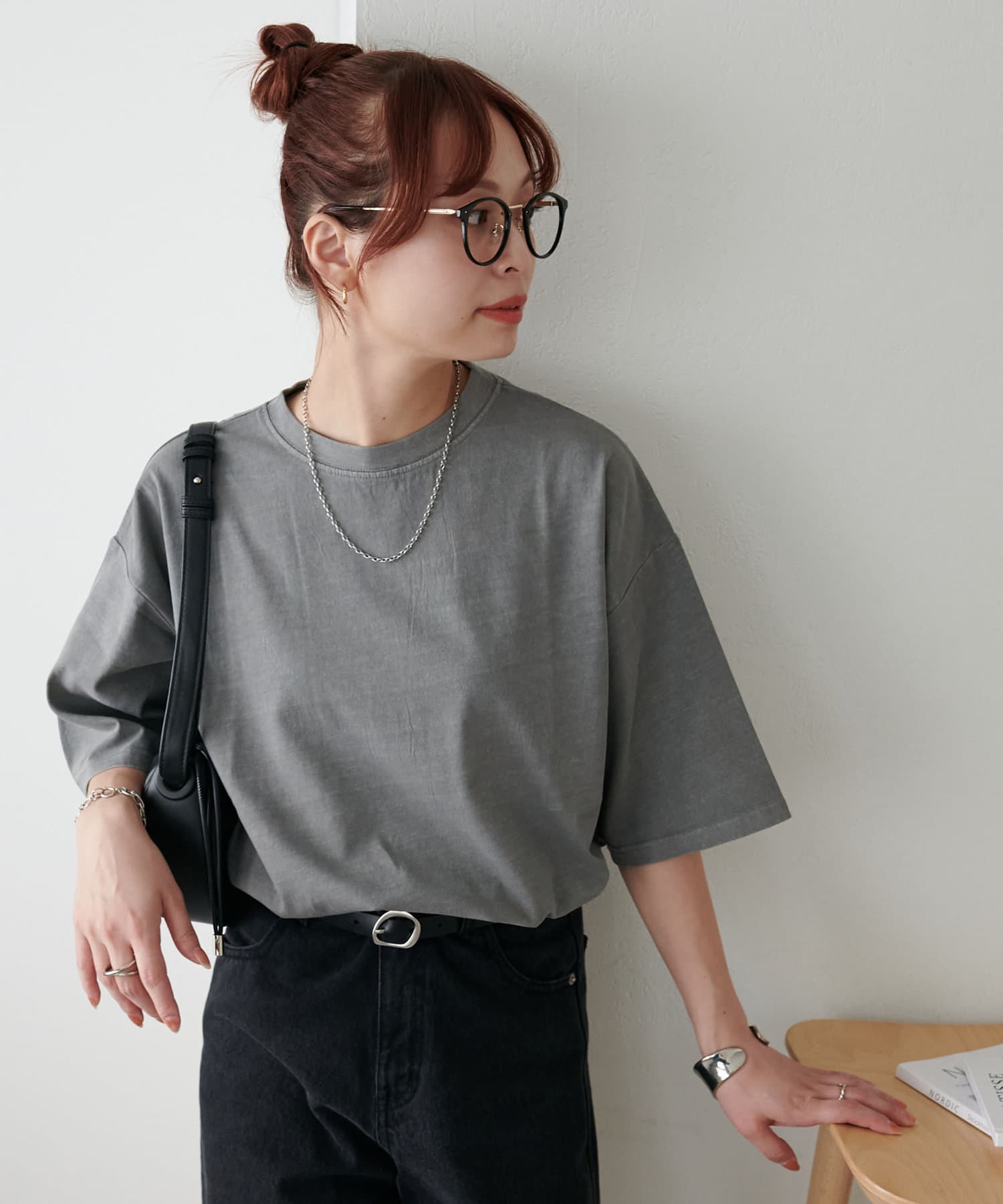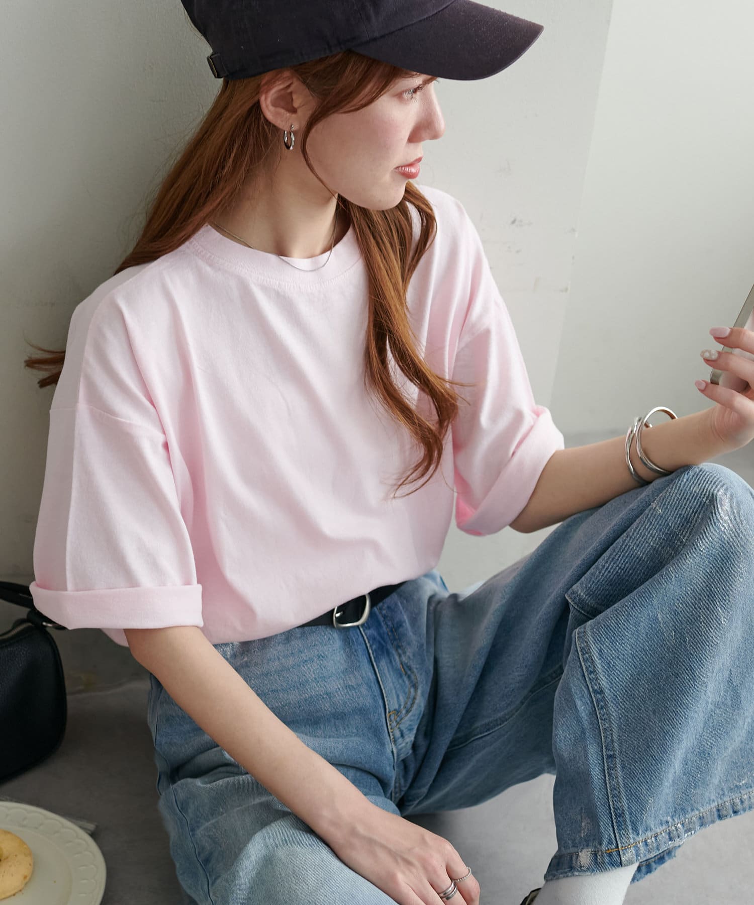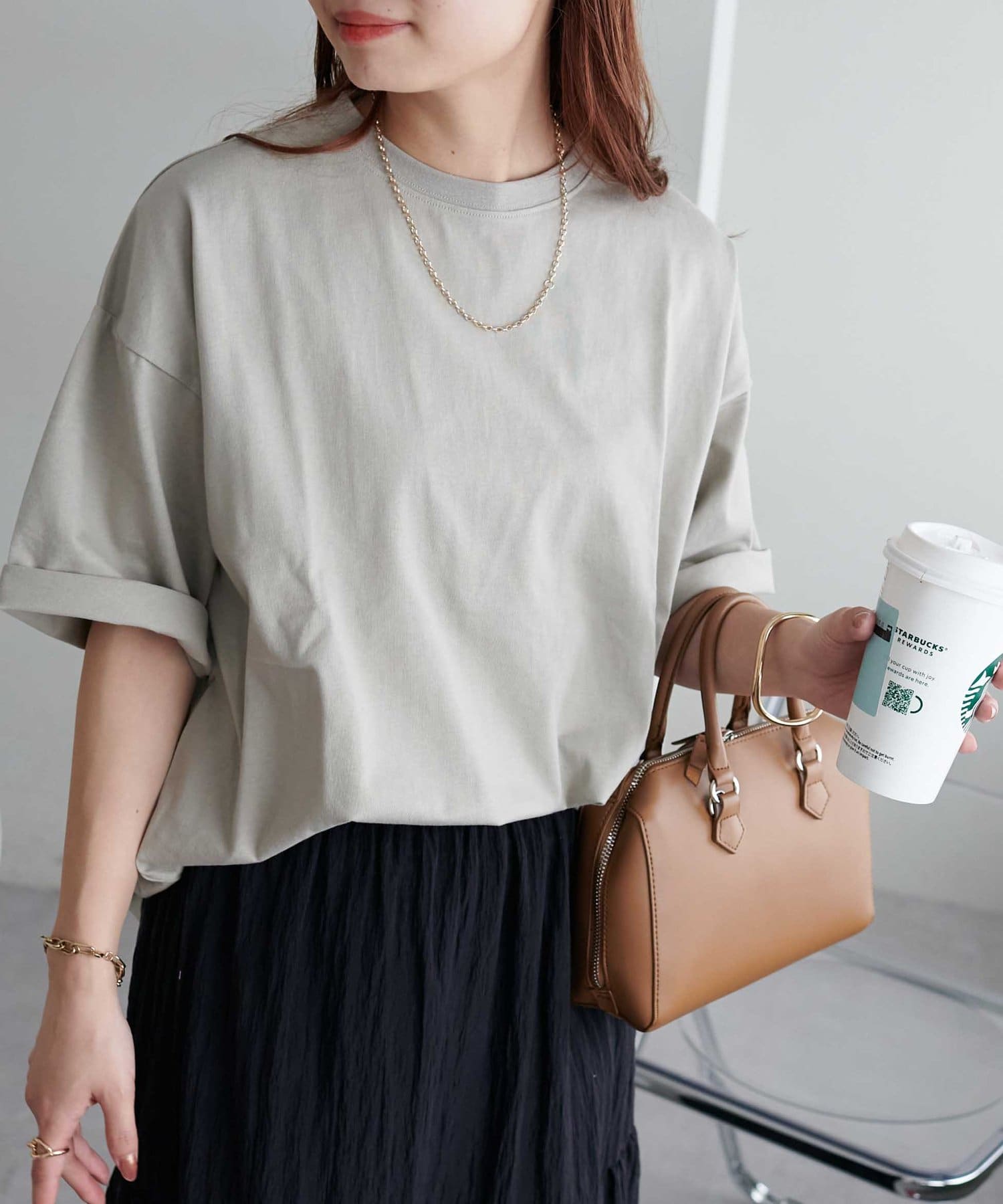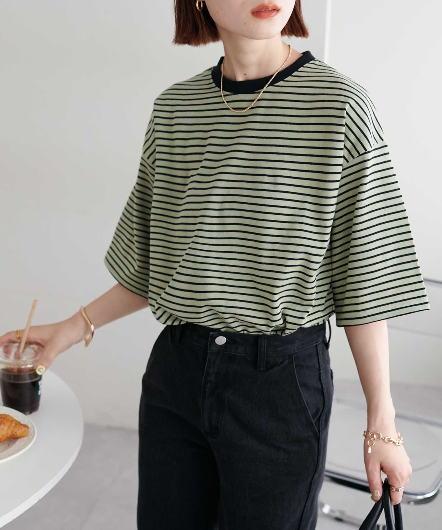 ・155cmスタッフ(Mサイズ着用):ゆとりのあるTシャツで着るだけでこなれ感を演出できます♪シンプルなので小物次第でコーデの雰囲気を変えられます◎