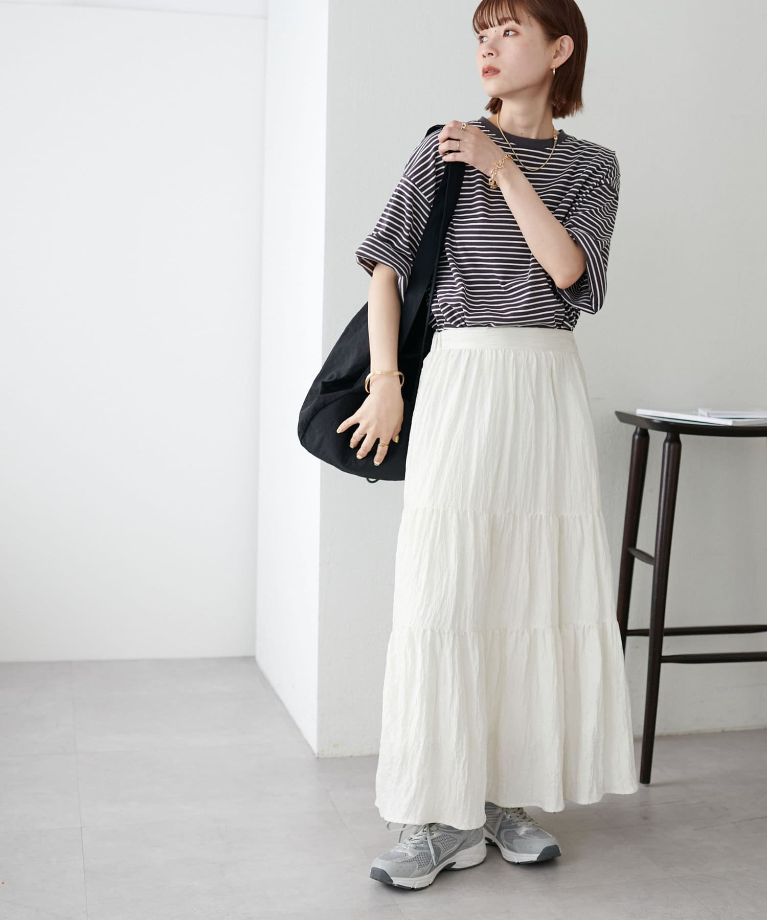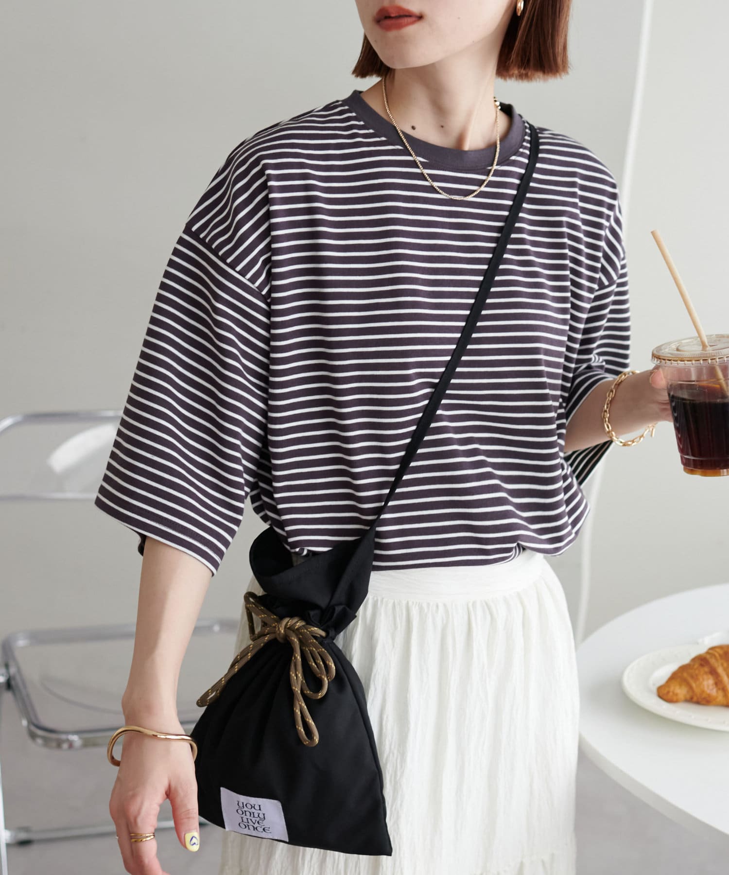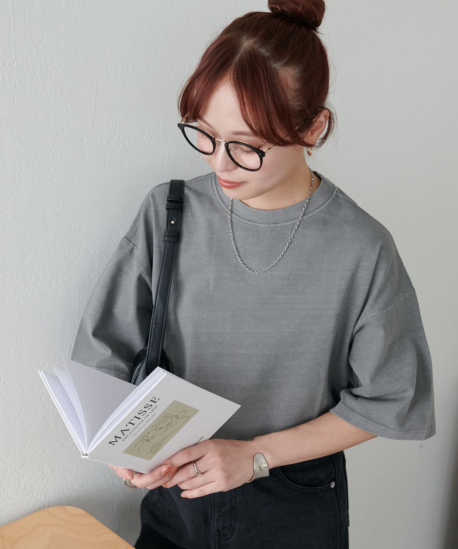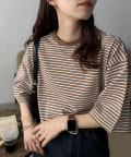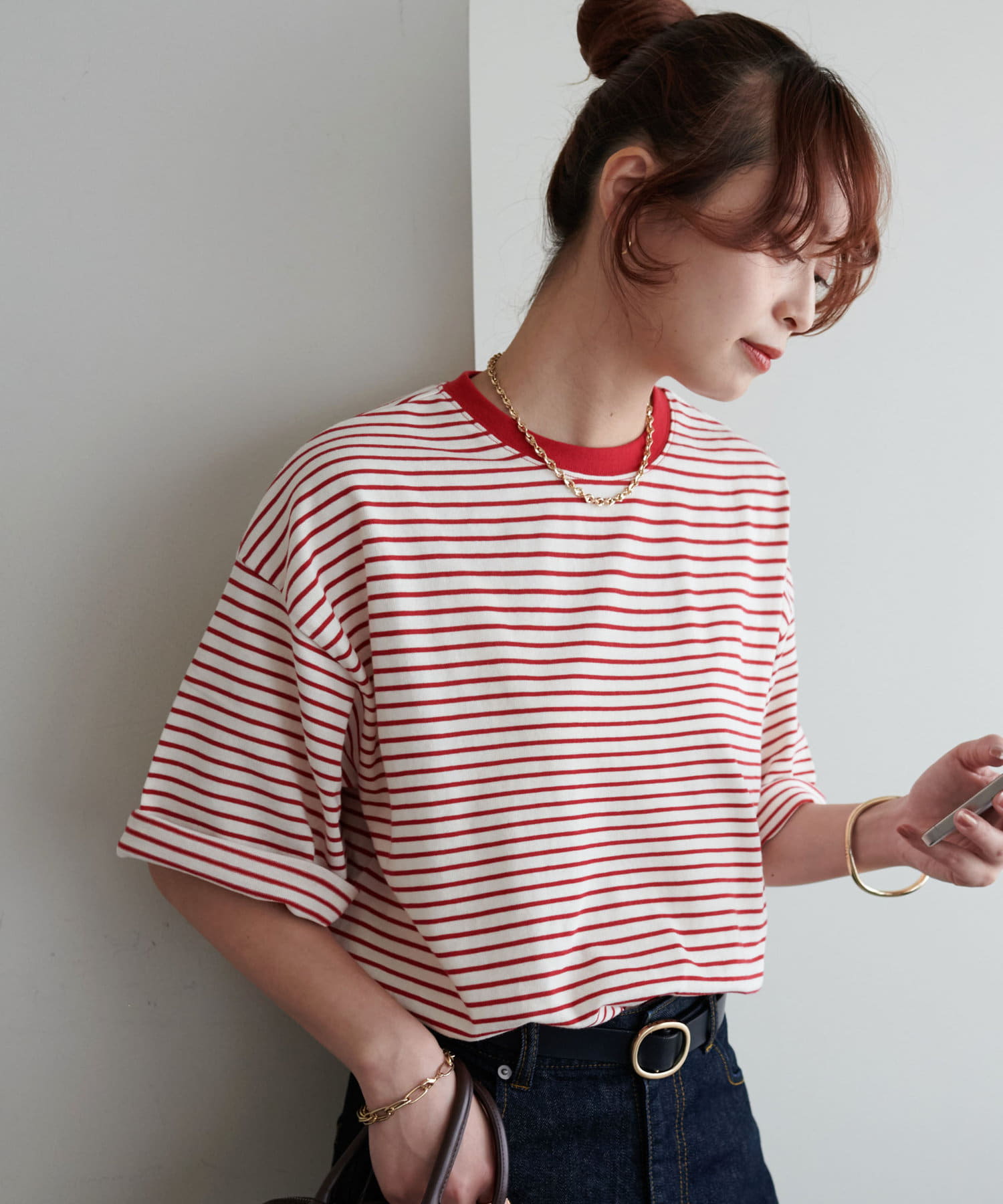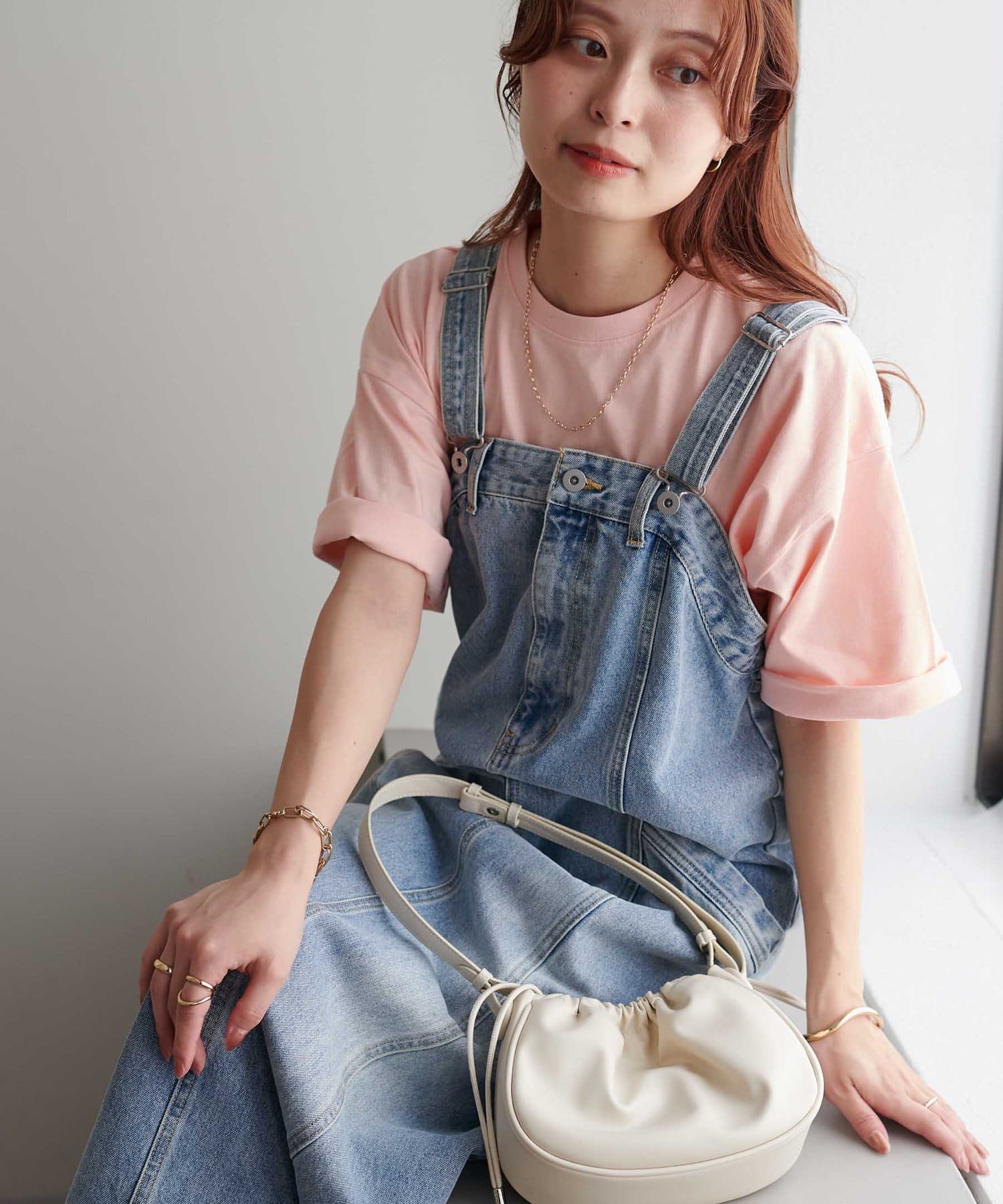 ・155cmスタッフ(Mサイズ着用):ゆとりのあるTシャツで着るだけでこなれ感を演出できます♪シンプルなので小物次第でコーデの雰囲気を変えられます◎