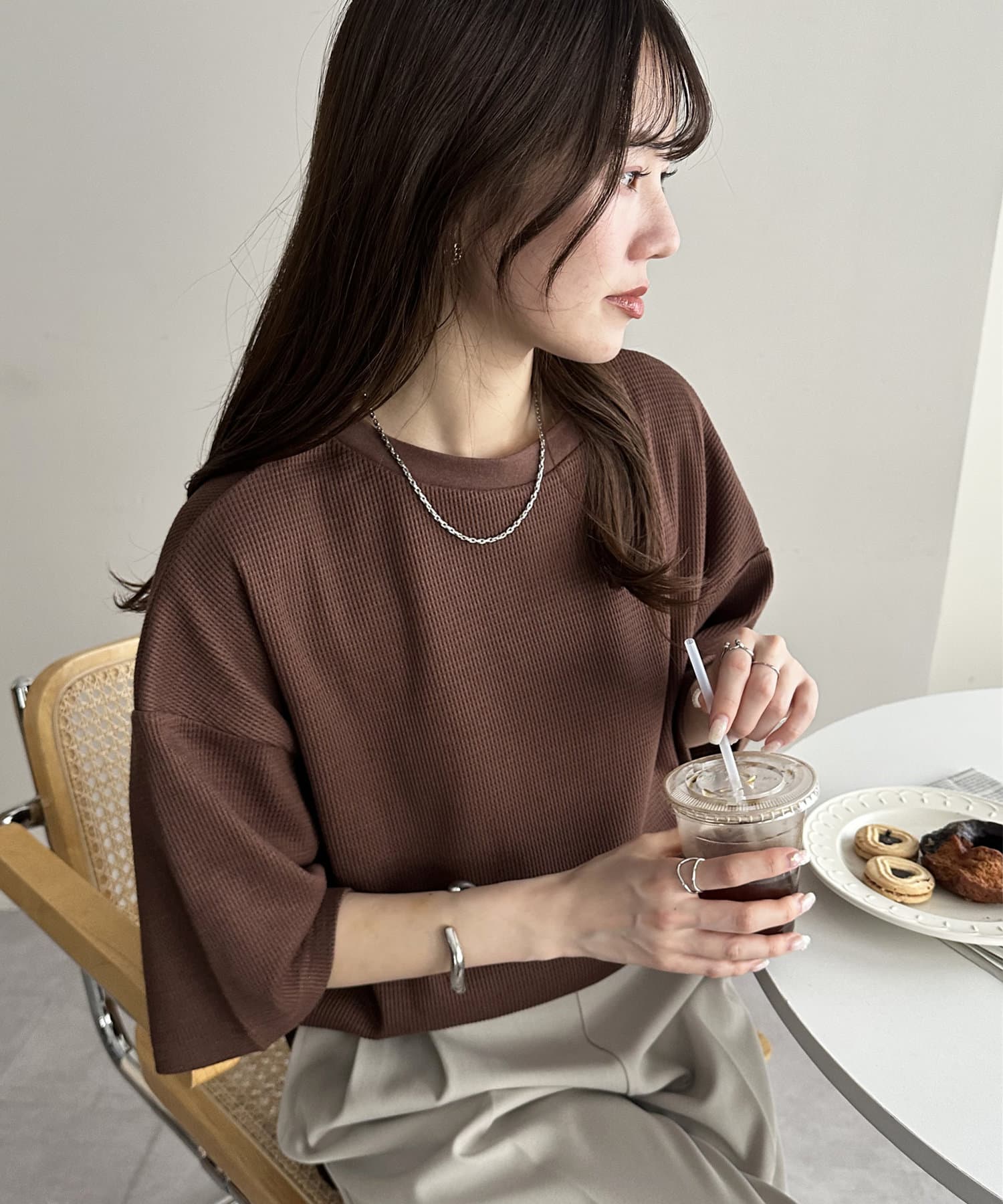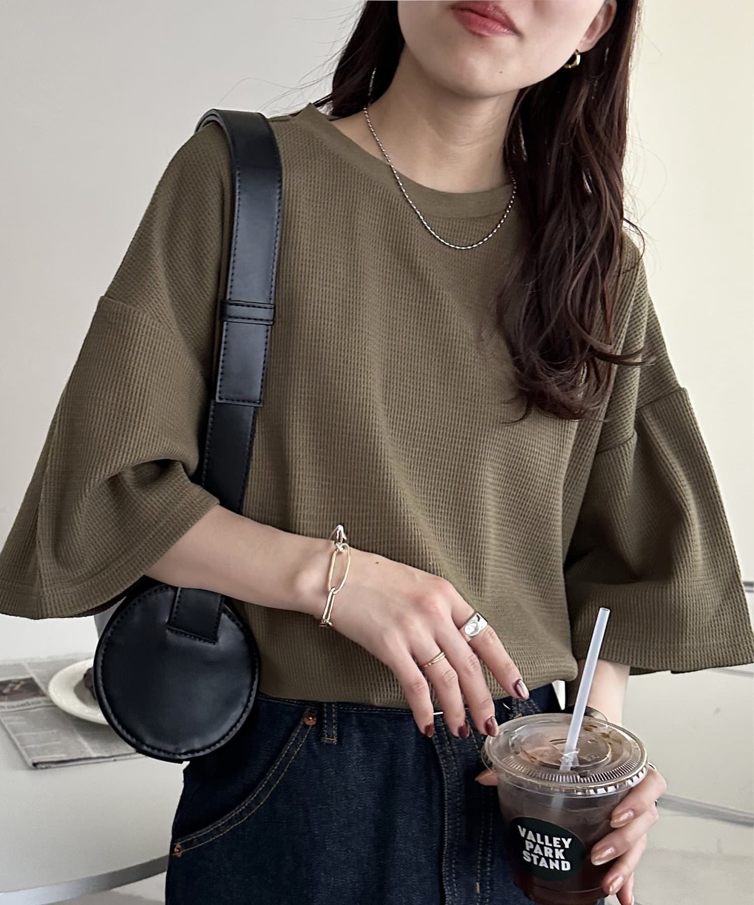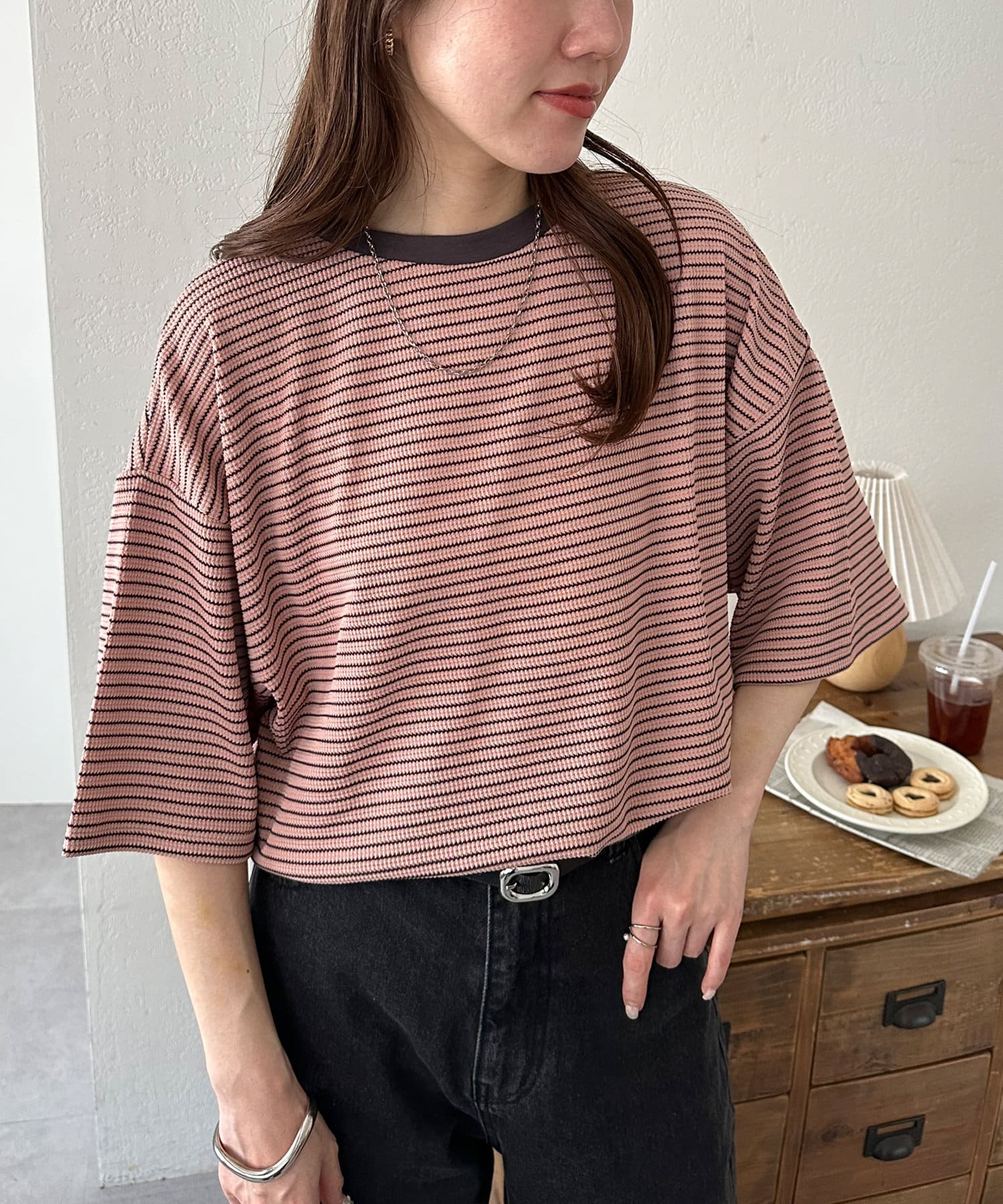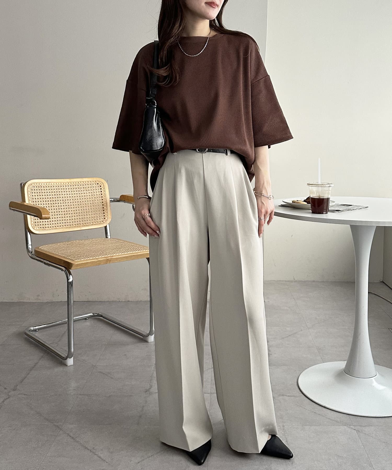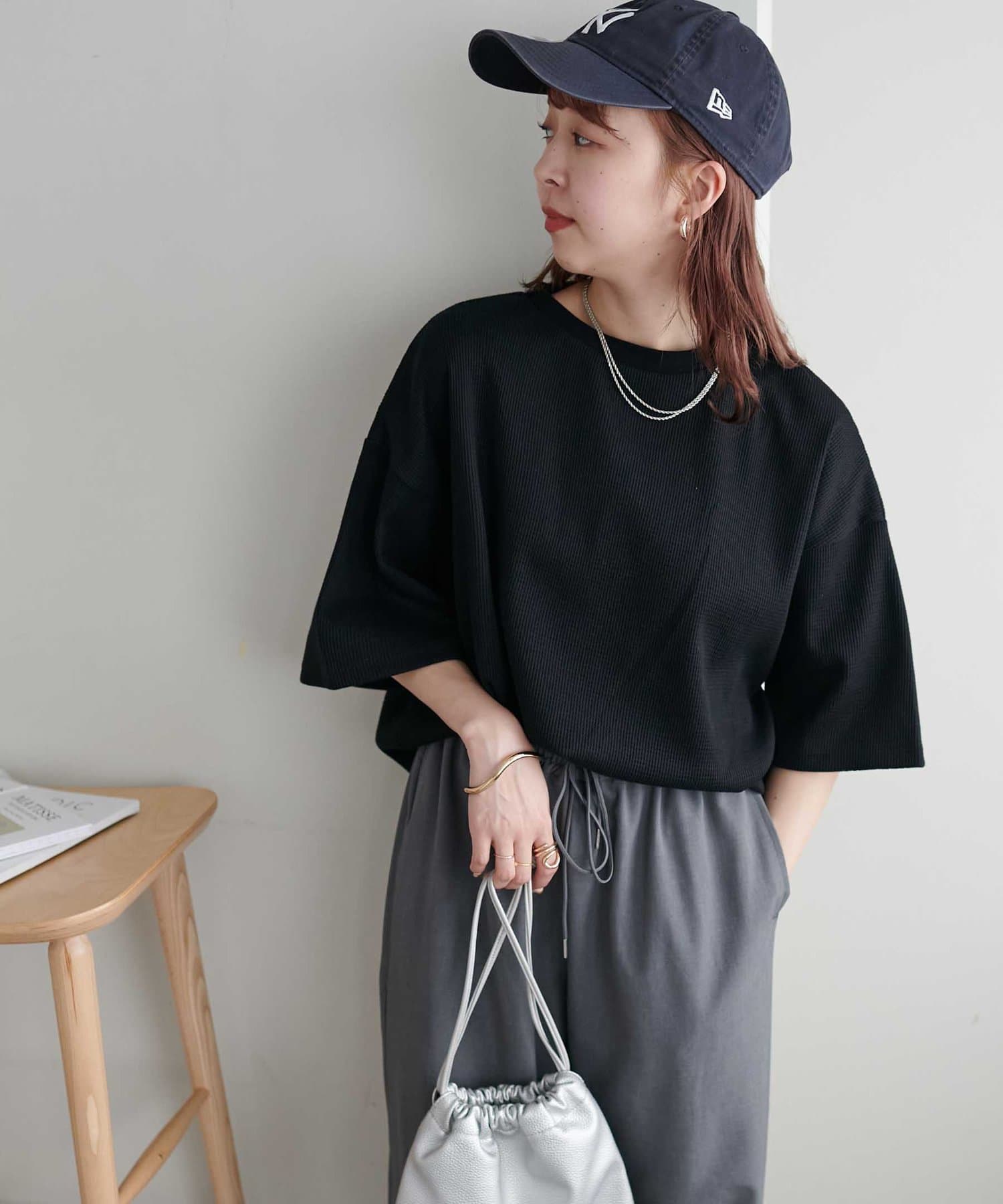 162cmスタッフ(Mサイズ着用):ワッフルの素材が可愛らしい!シンプルなので、小物合わせで様々な雰囲気に変えられるのも魅力的♡