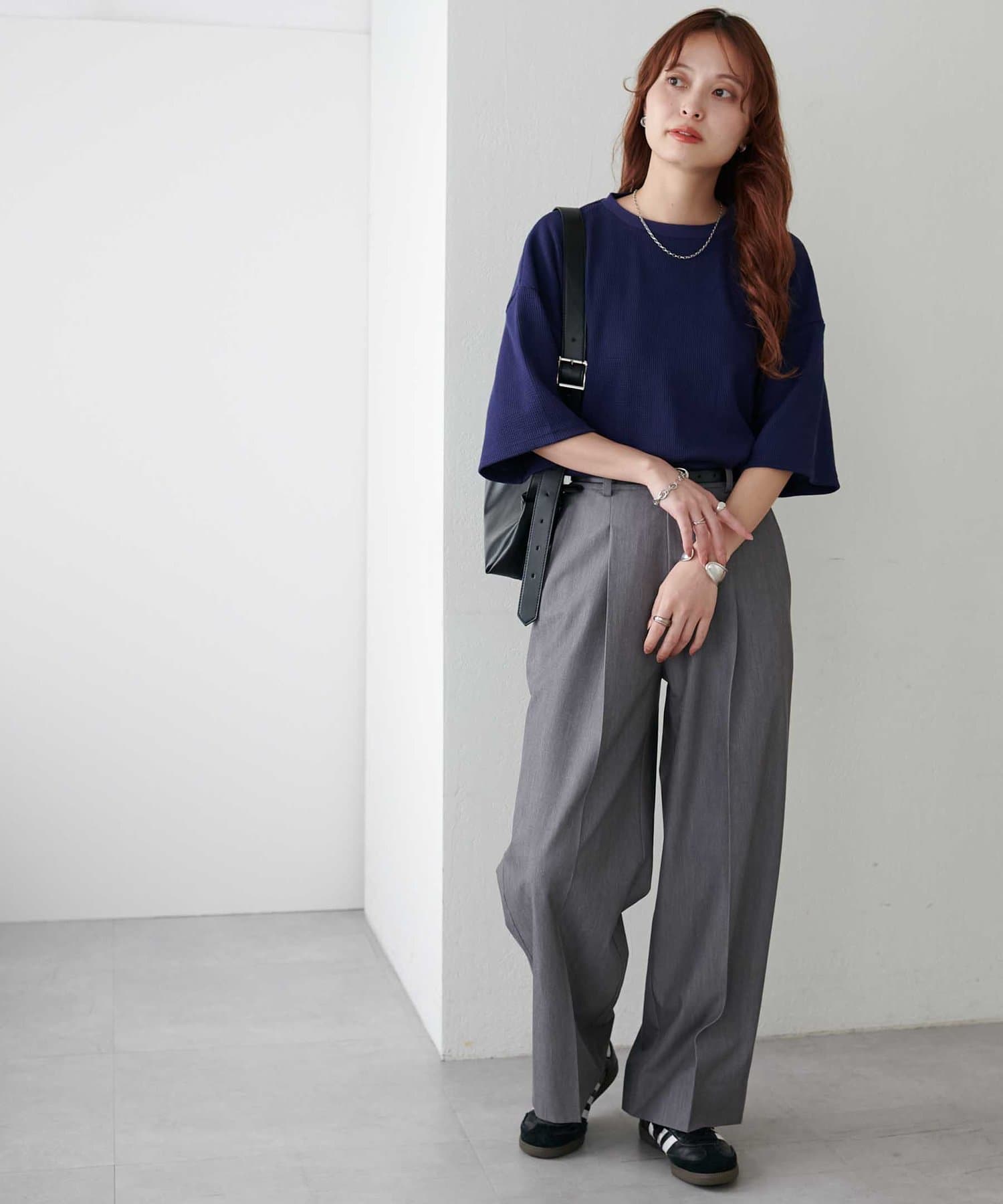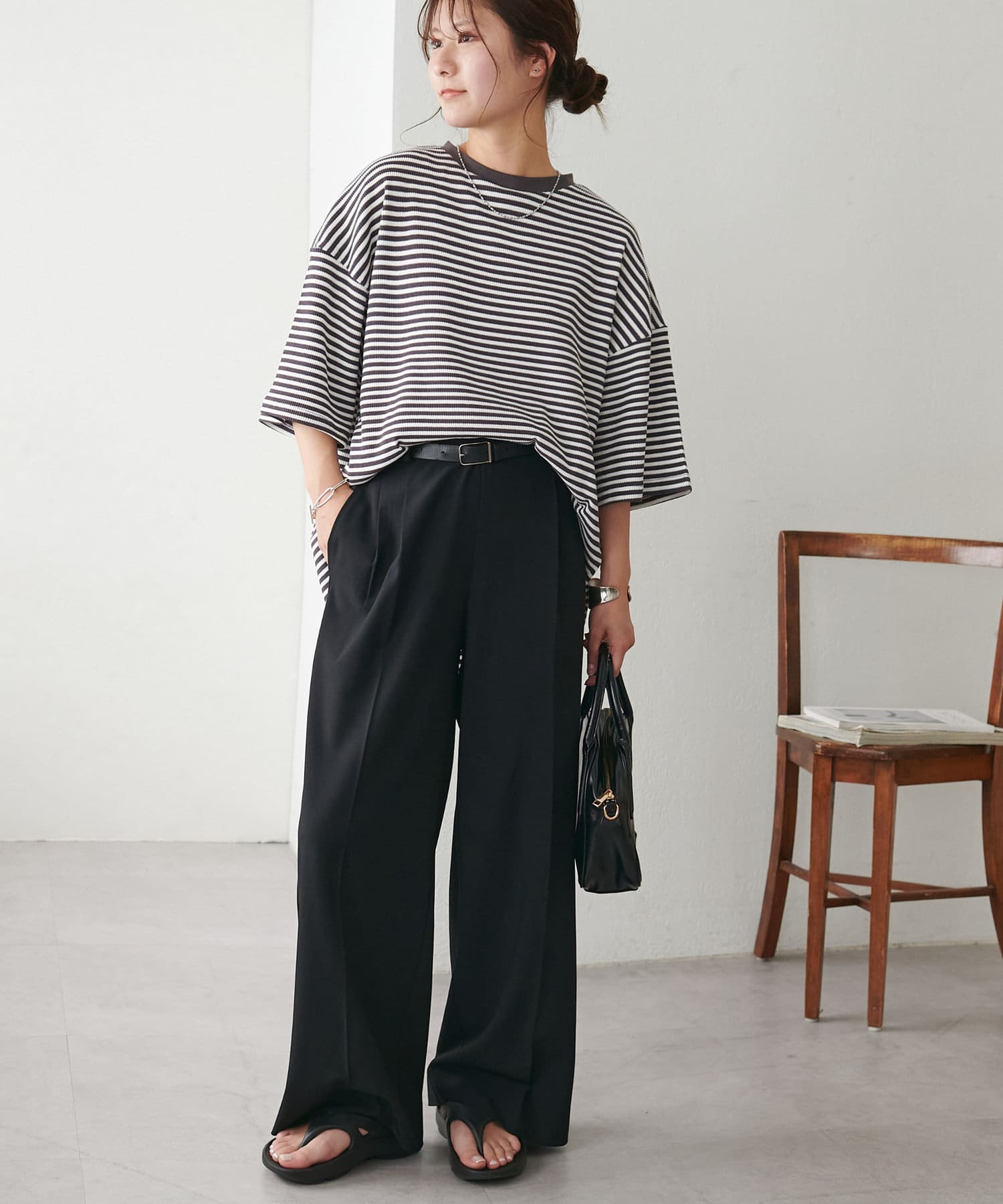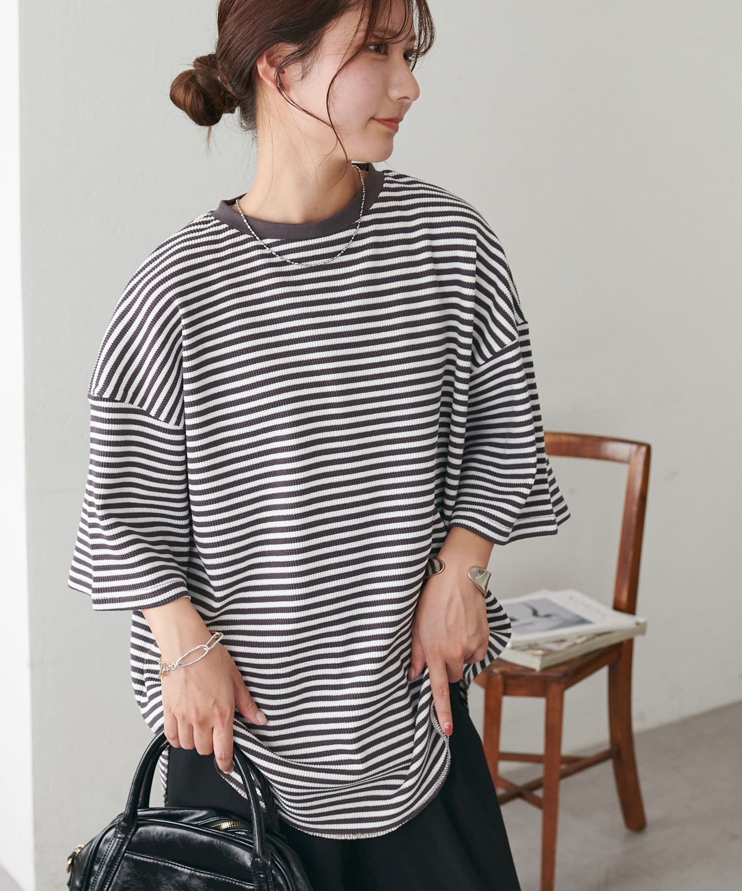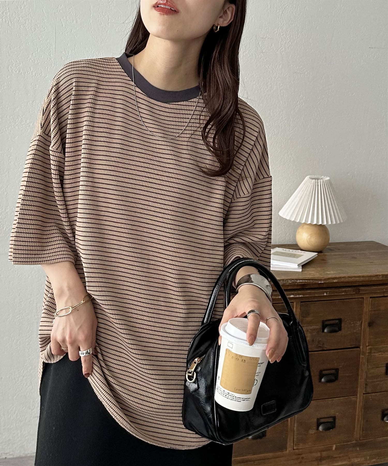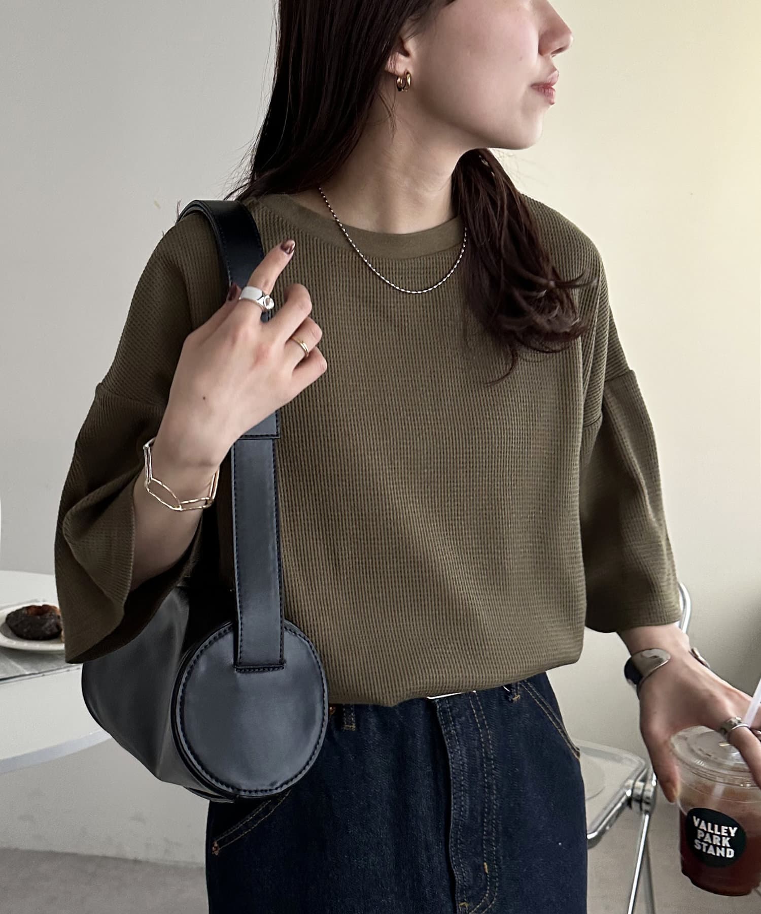 162cmスタッフ(Mサイズ着用):ワッフルの素材が可愛らしい!シンプルなので、小物合わせで様々な雰囲気に変えられるのも魅力的♡