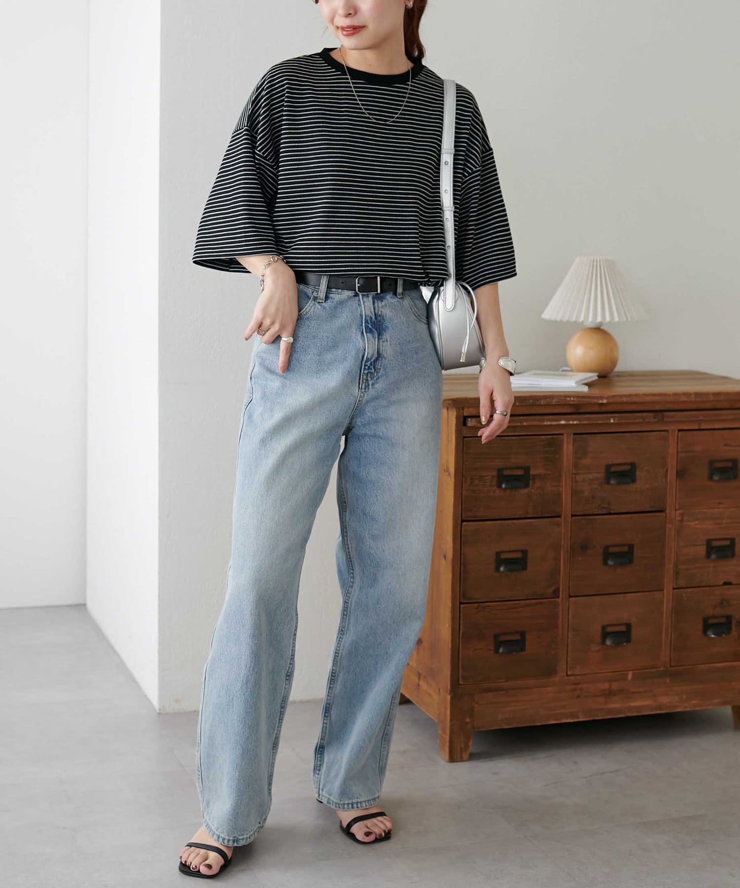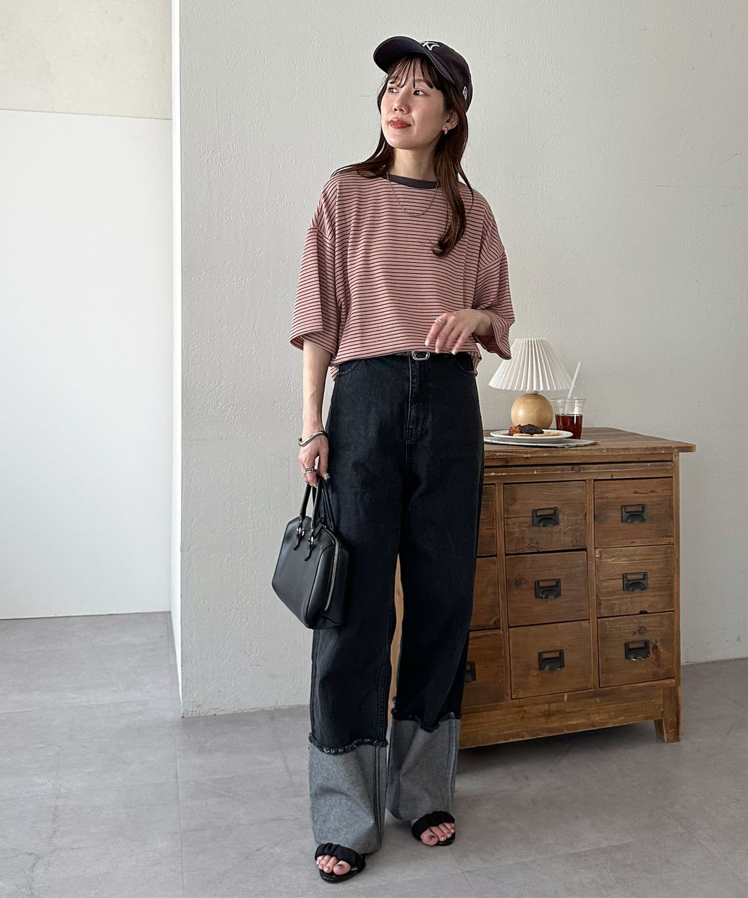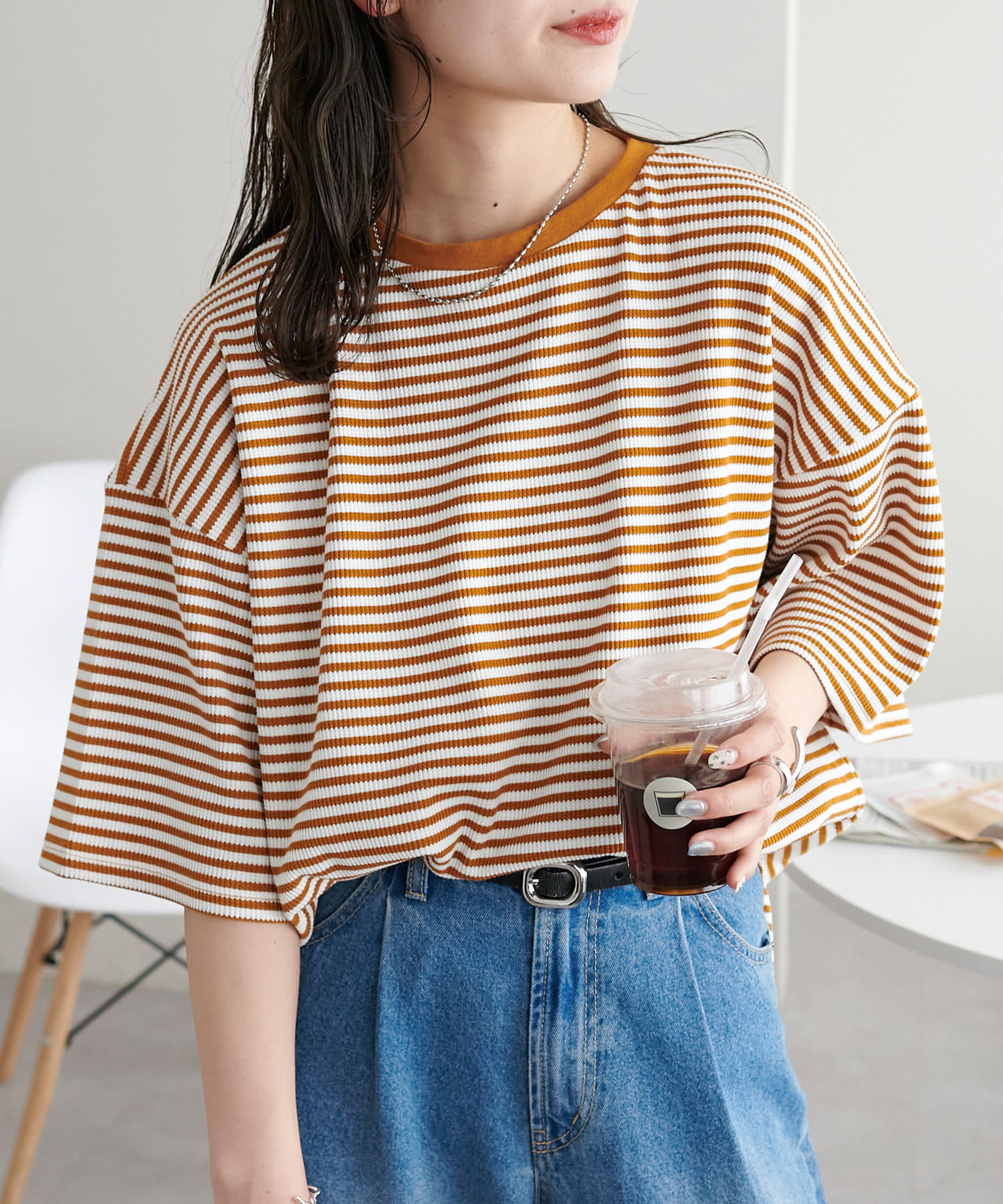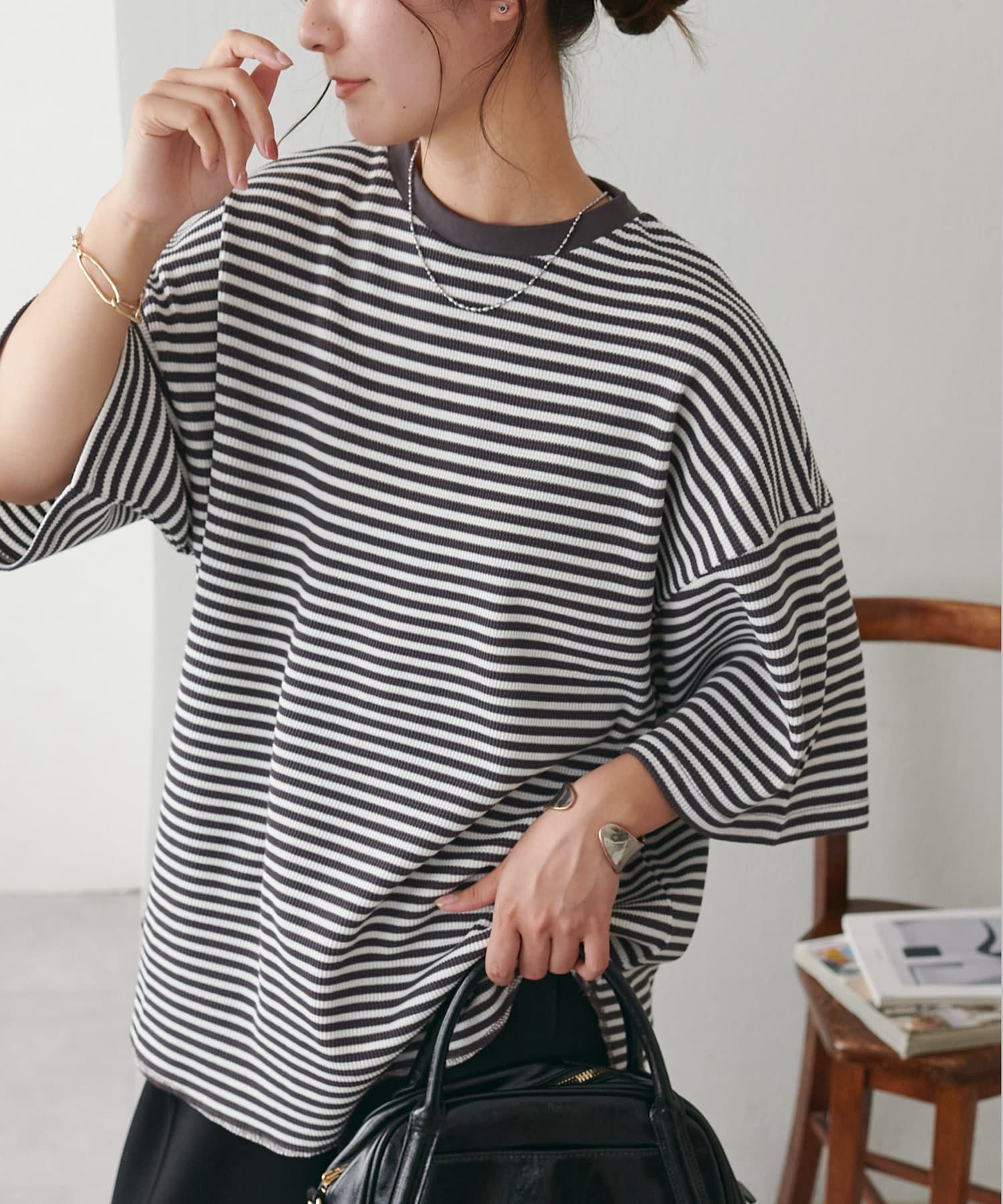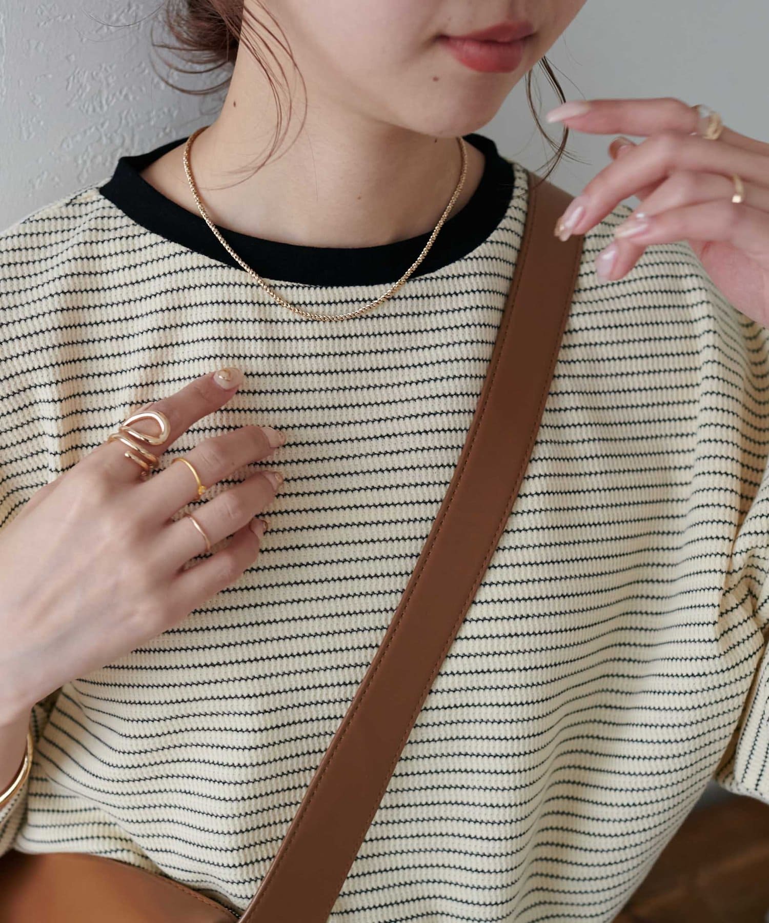 162cmスタッフ(Mサイズ着用):ワッフルの素材が可愛らしい!シンプルなので、小物合わせで様々な雰囲気に変えられるのも魅力的♡