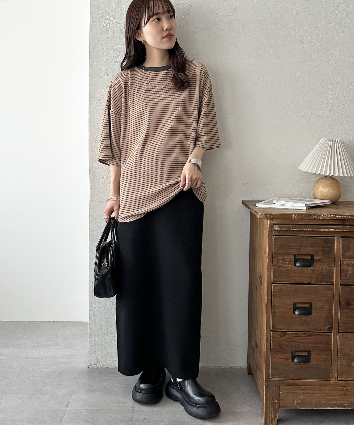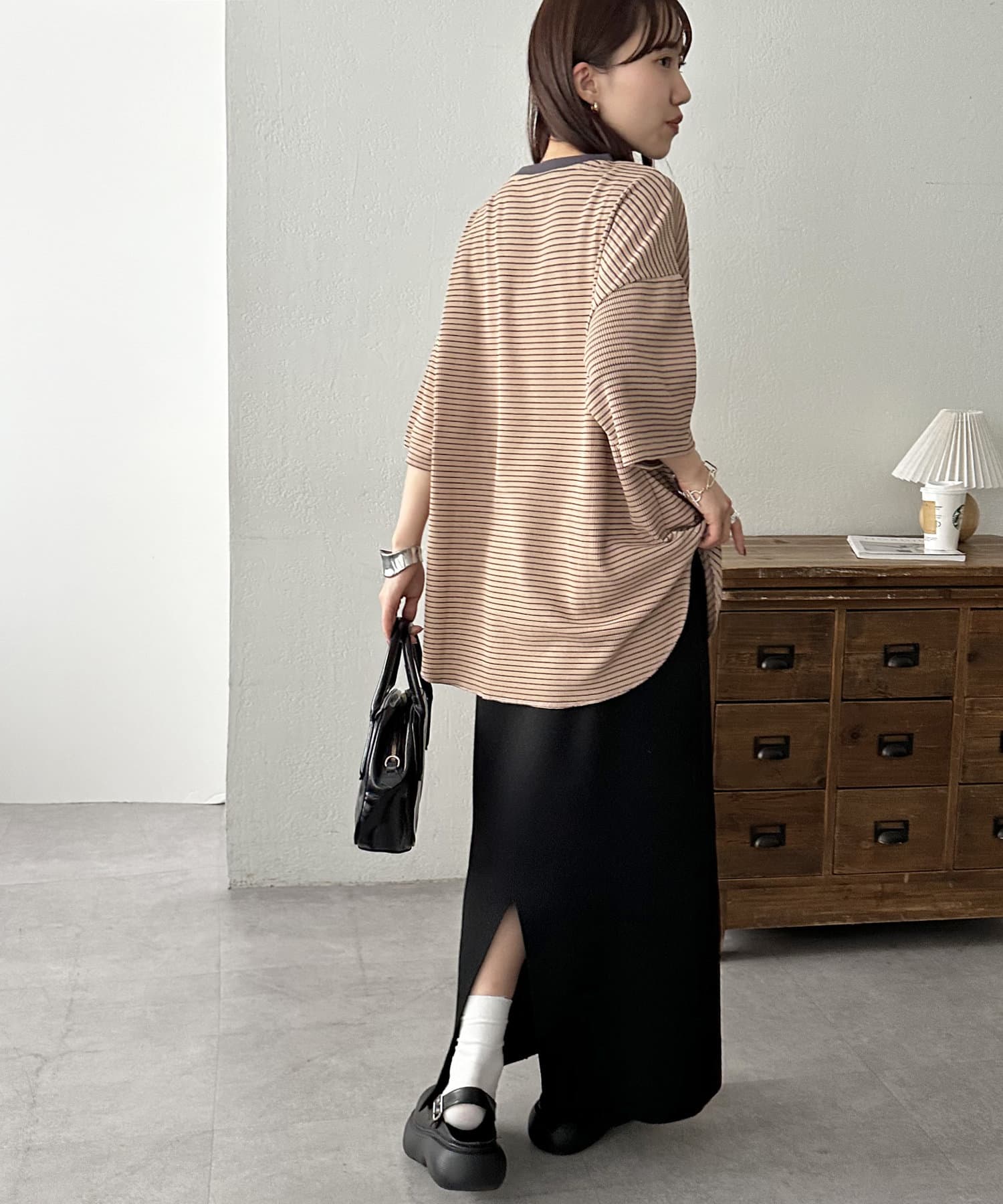 アウトスタイルでスカートと合わせてゆるっと着るのがおすすめです♪