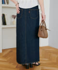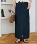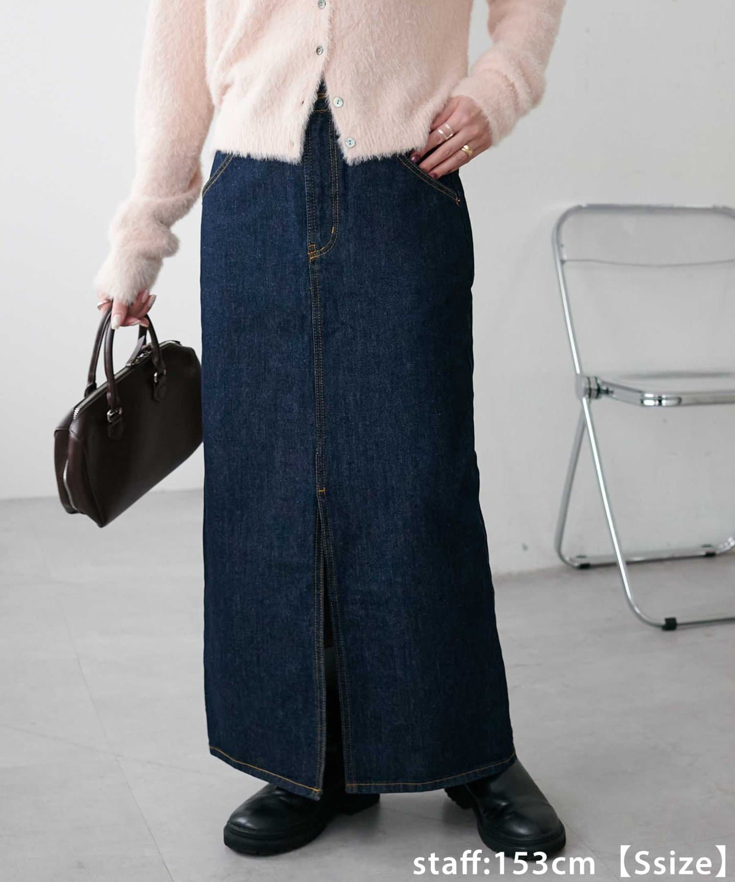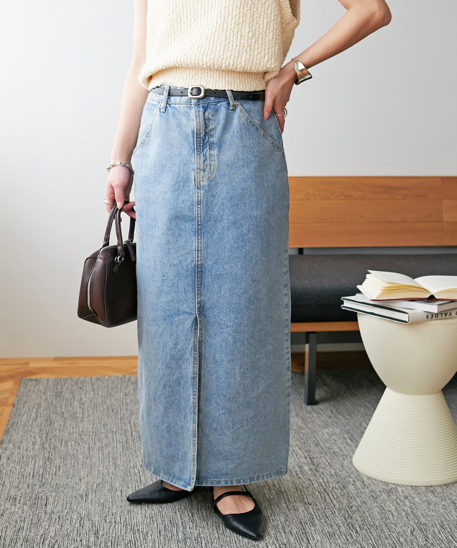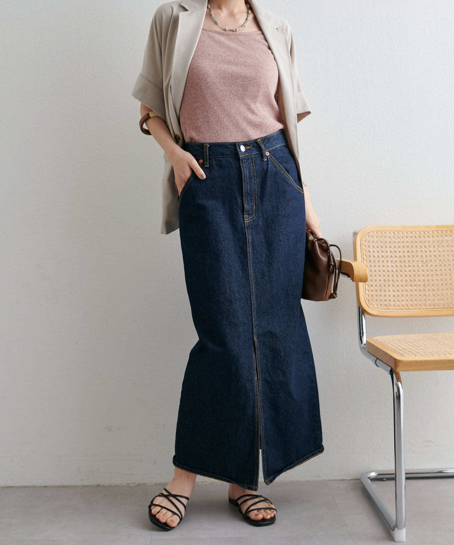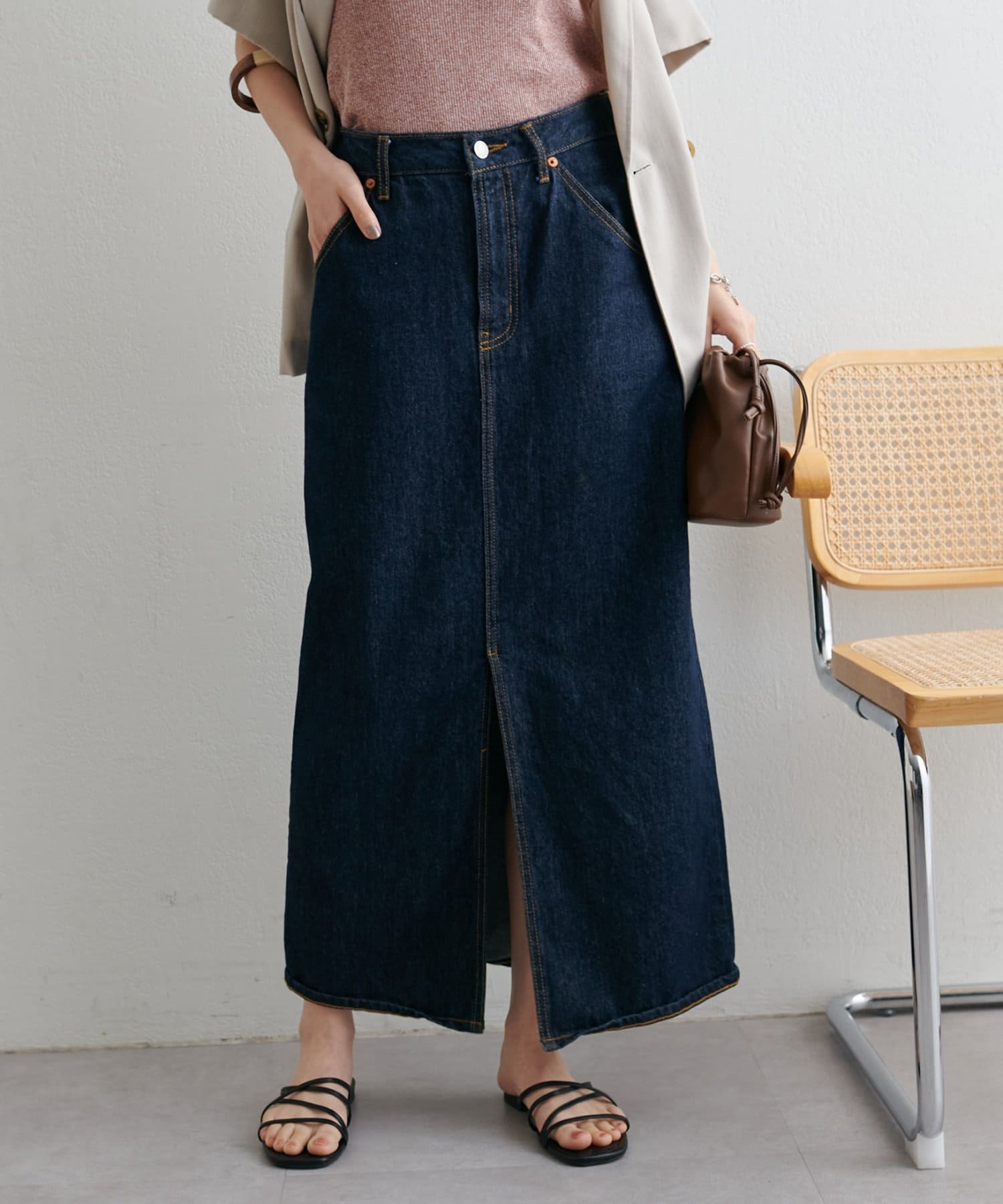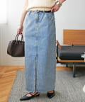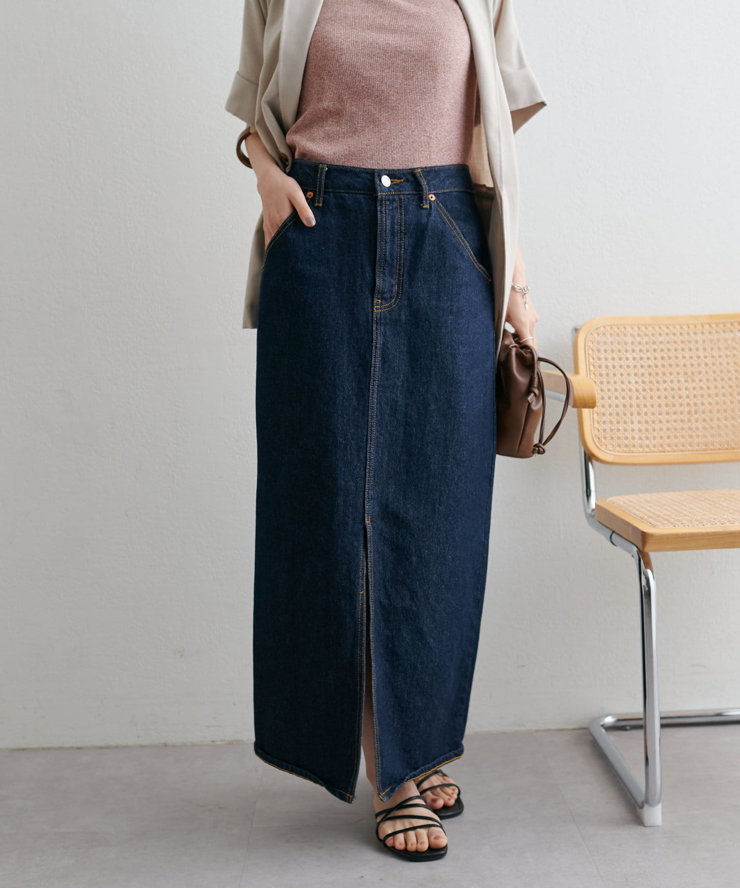華奢見えする美シルエットのデニムナロースカート。ベーシックなデザインで様々なトップスと合わせやすく、着回しのできるアイテムです。前スリットも入っているので歩きやすさも抜群!