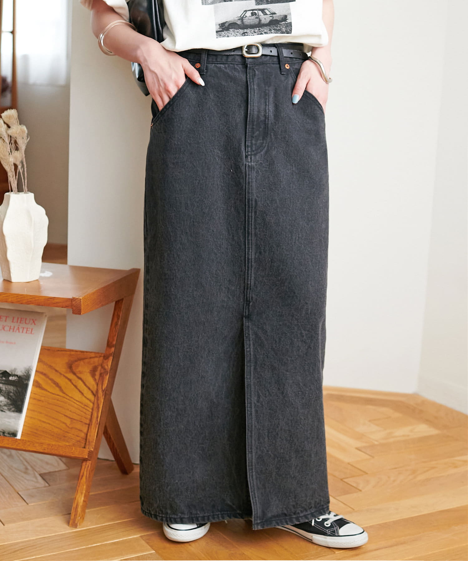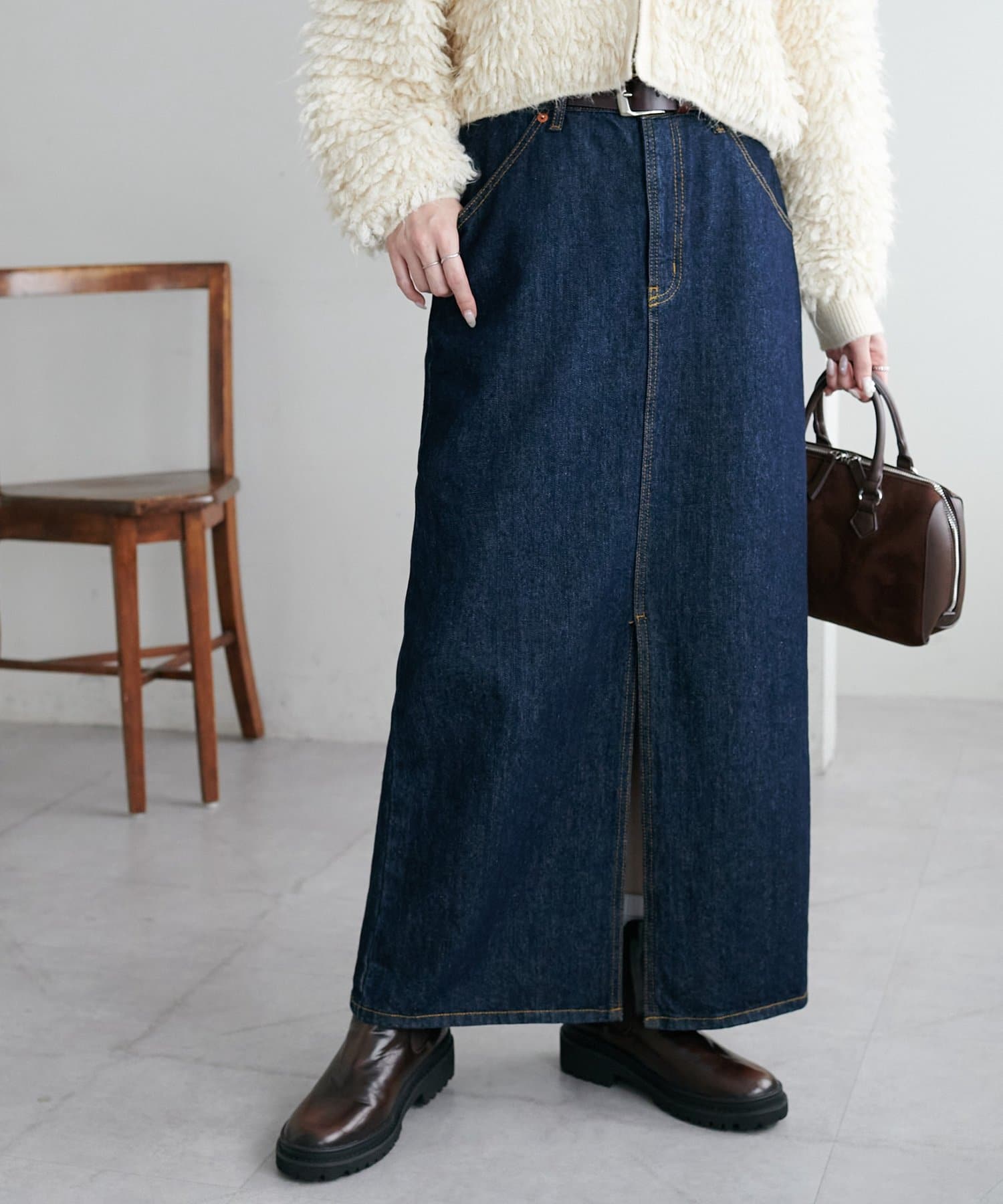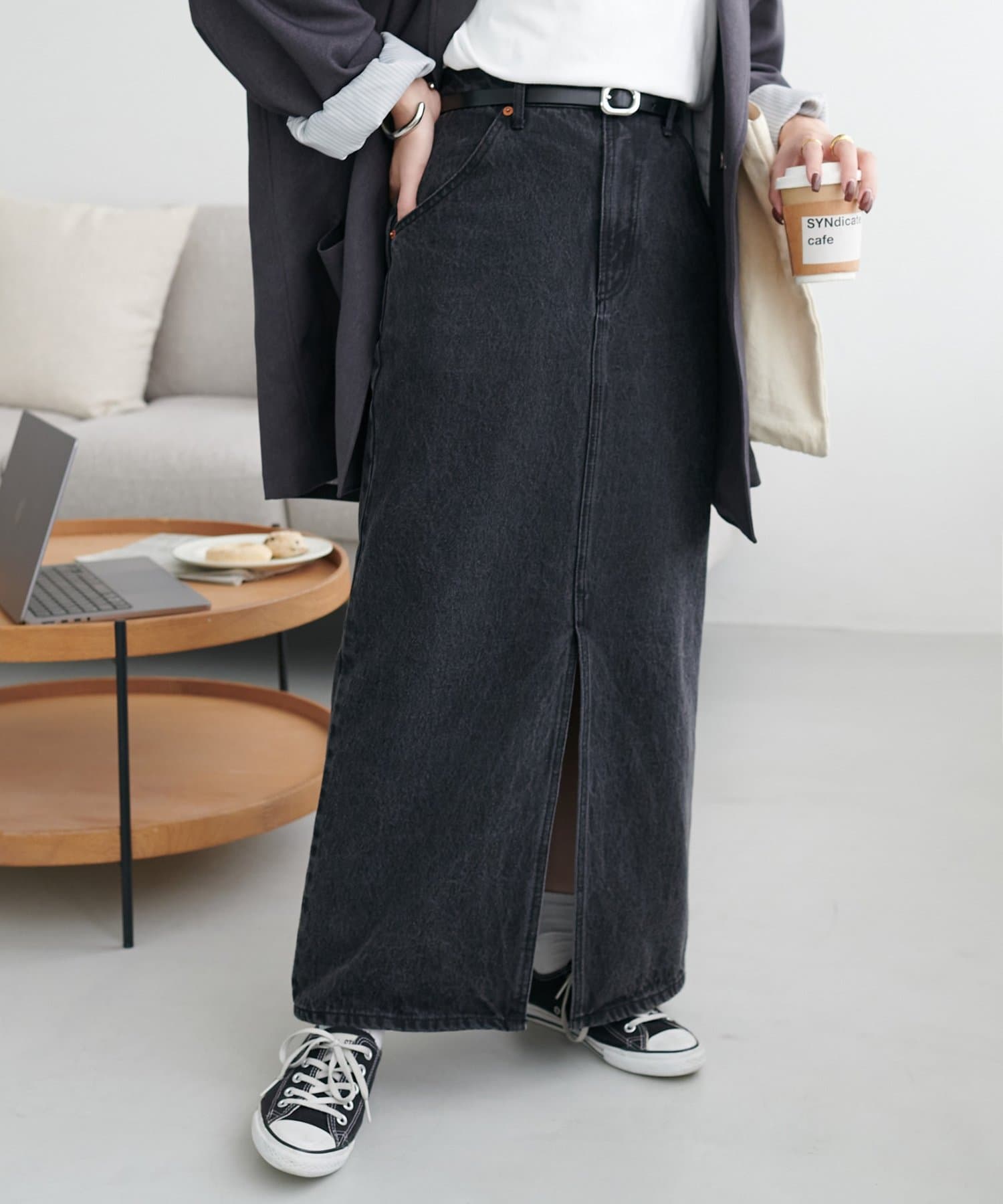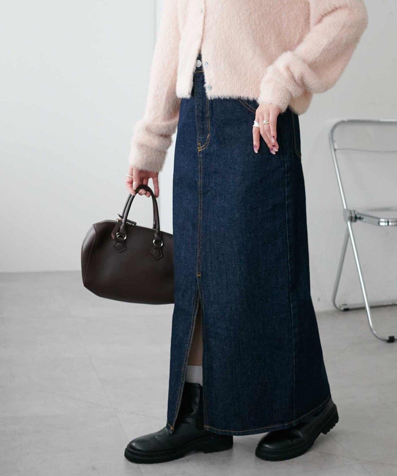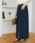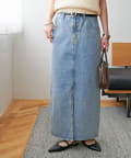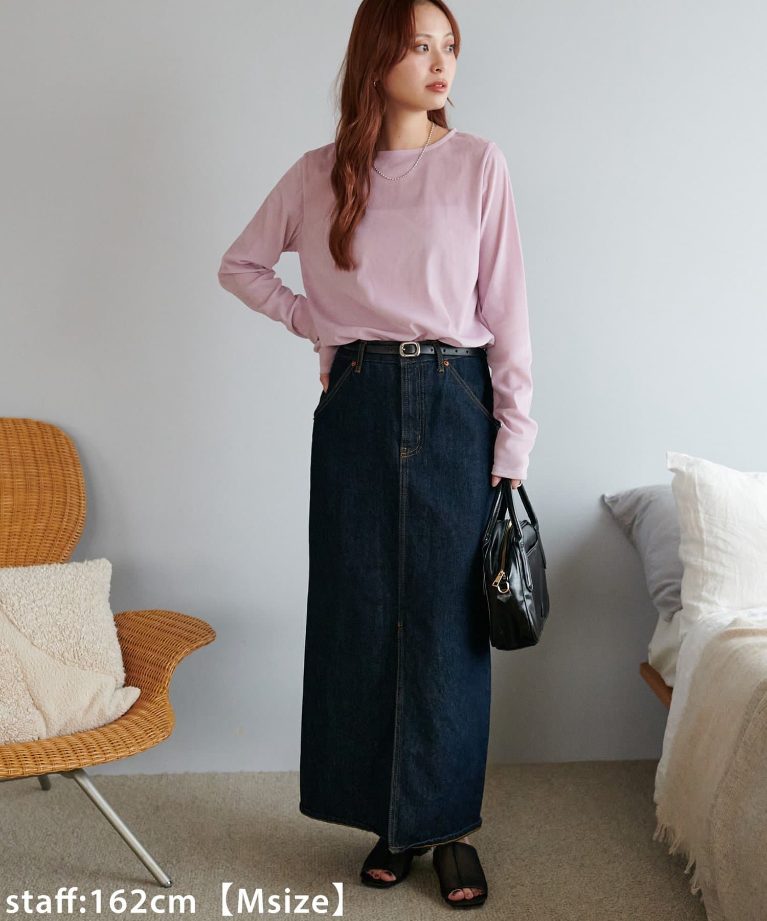 華奢見えする美シルエットのデニムナロースカート。ベーシックなデザインで様々なトップスと合わせやすく、着回しのできるアイテムです。前スリットも入っているので歩きやすさも抜群!