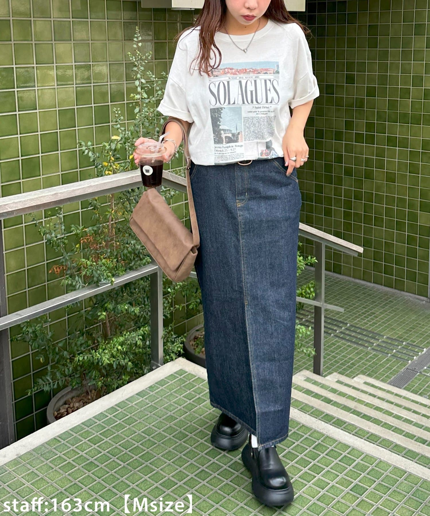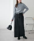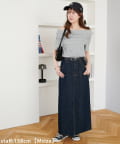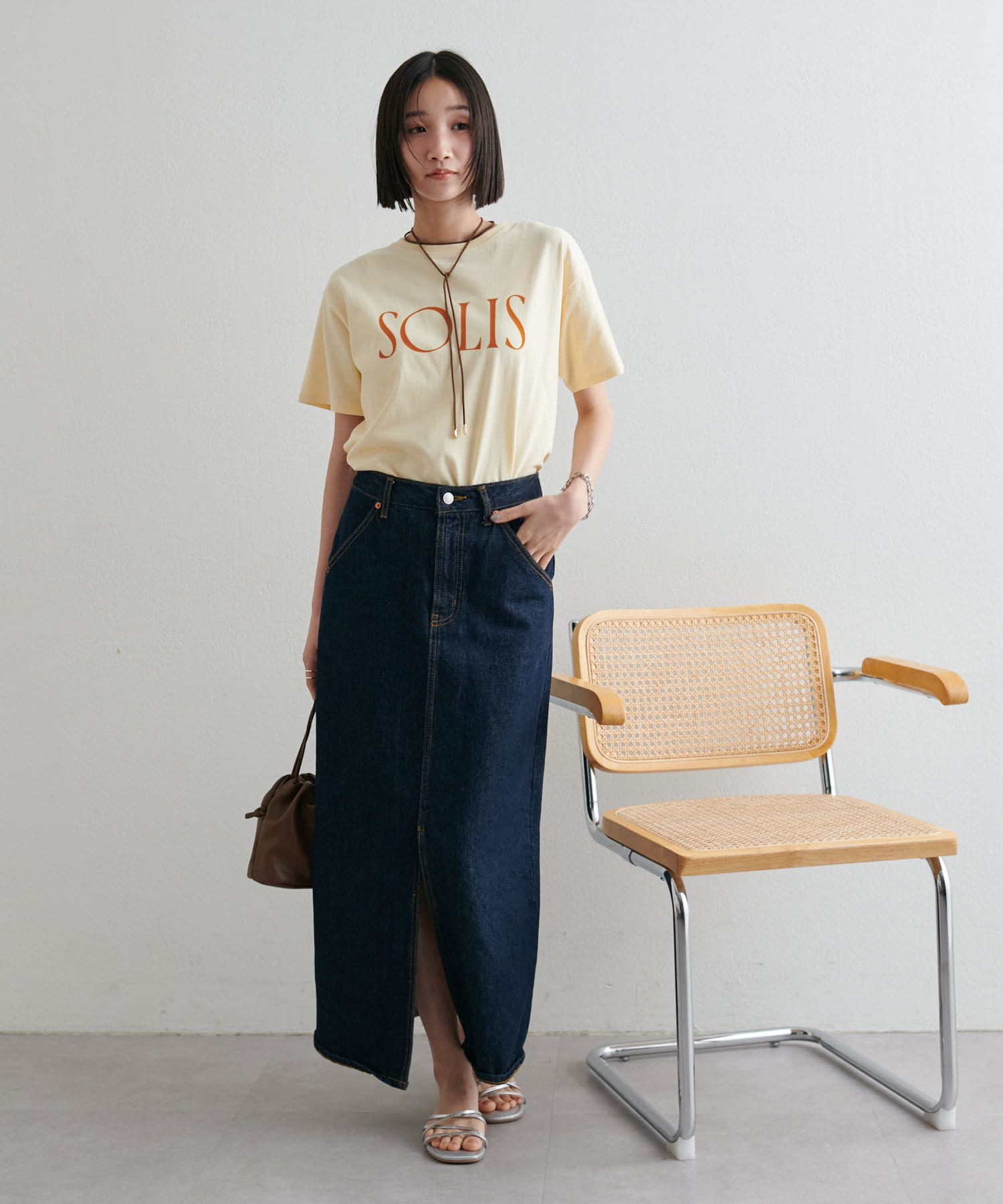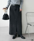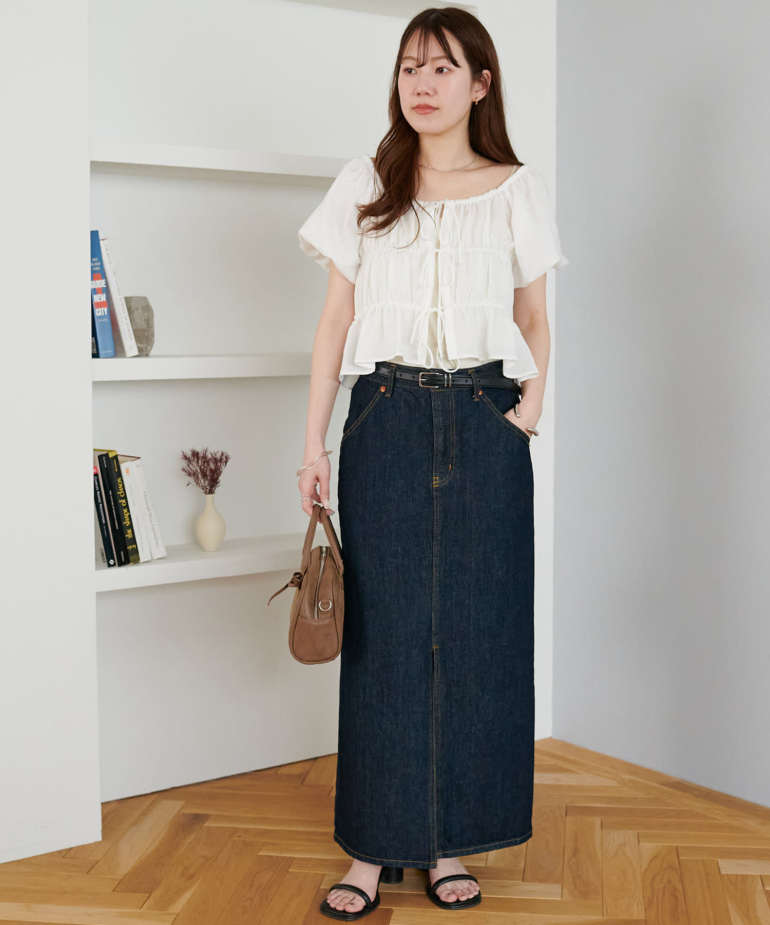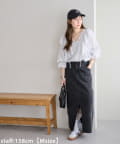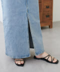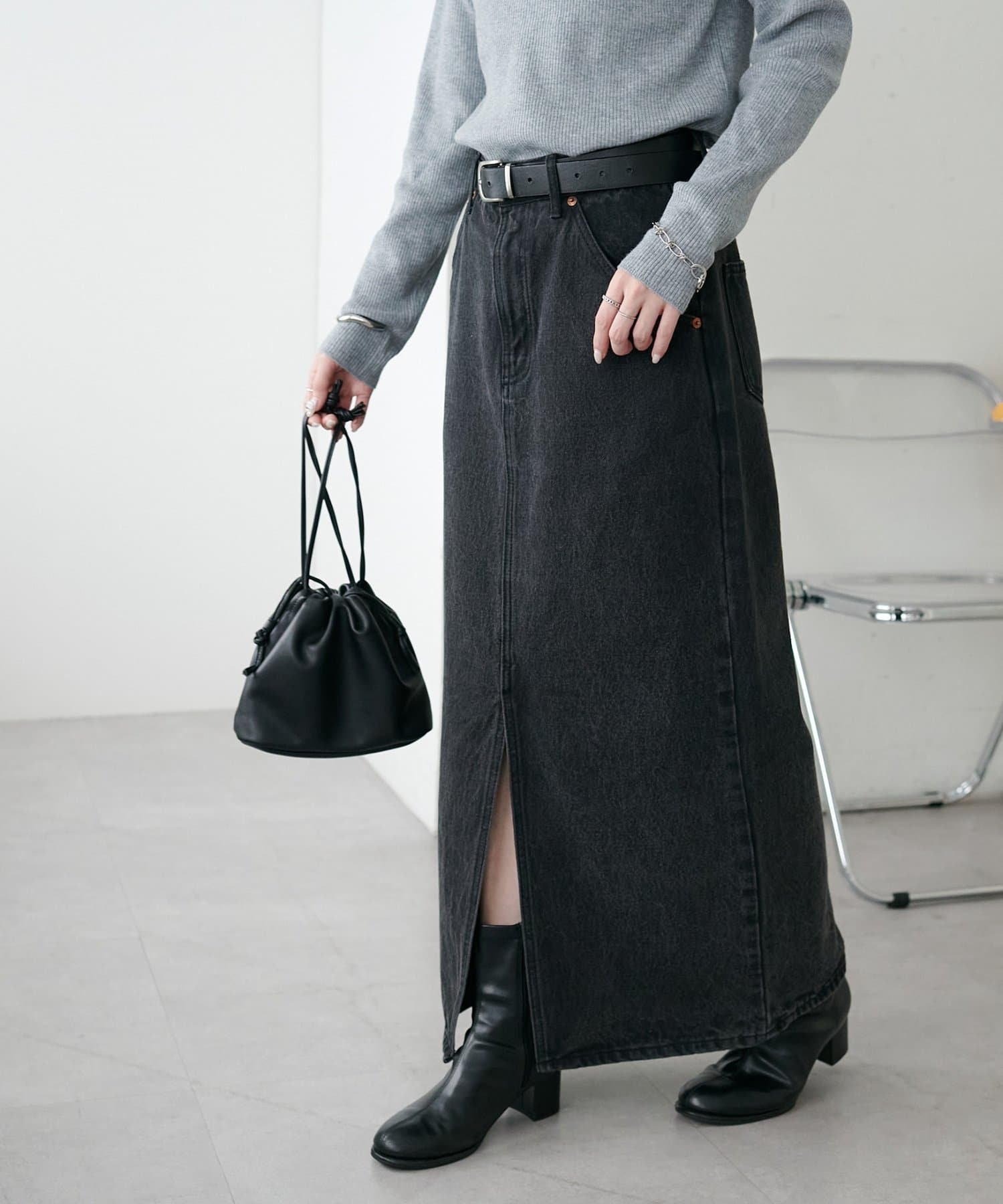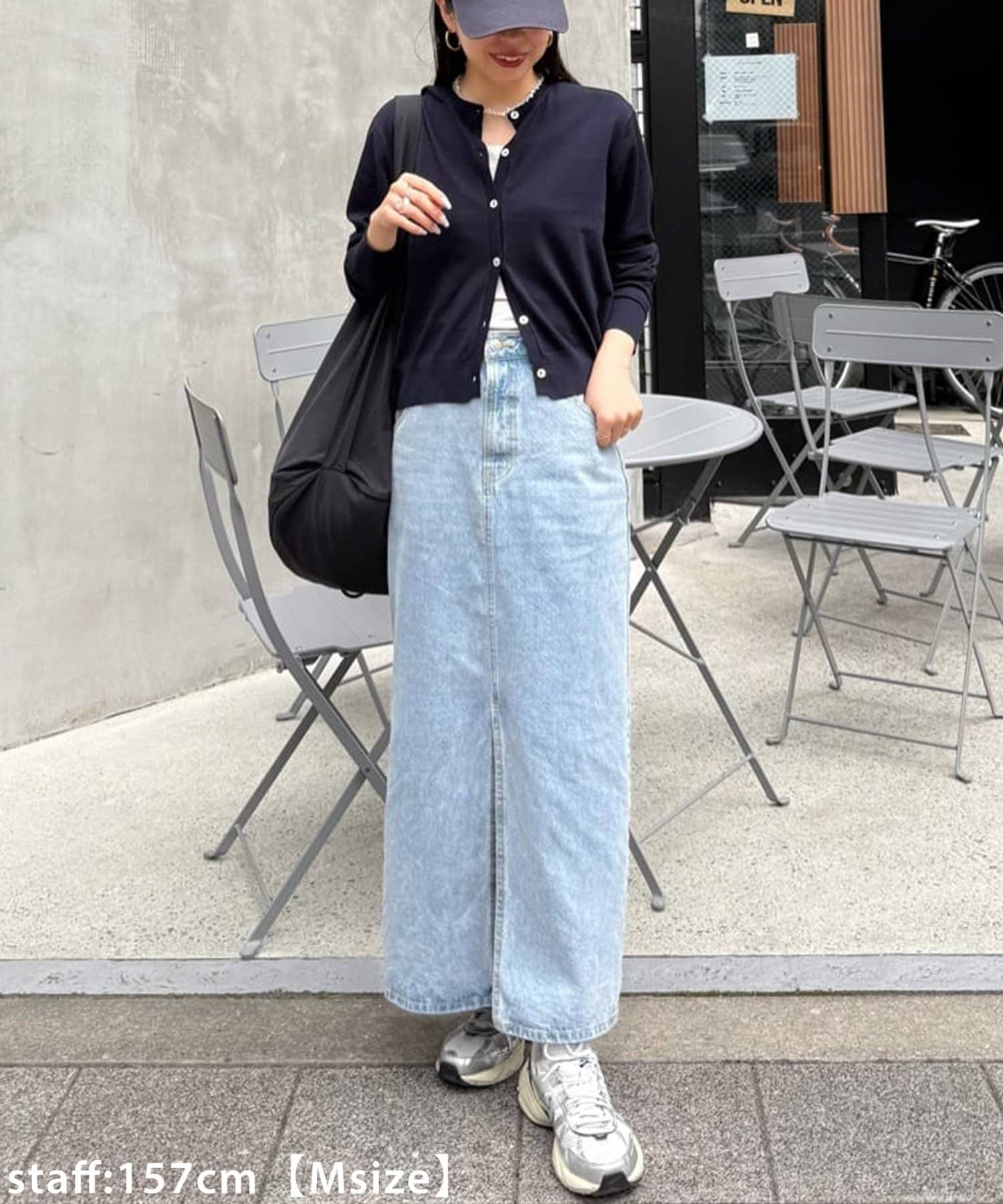 華奢見えする美シルエットのデニムナロースカート。ベーシックなデザインで様々なトップスと合わせやすく、着回しのできるアイテムです。前スリットも入っているので歩きやすさも抜群!