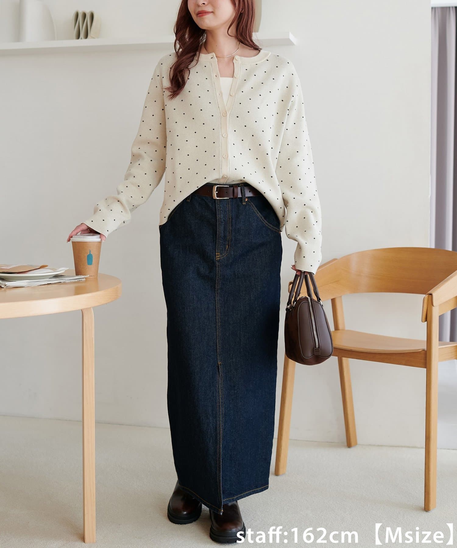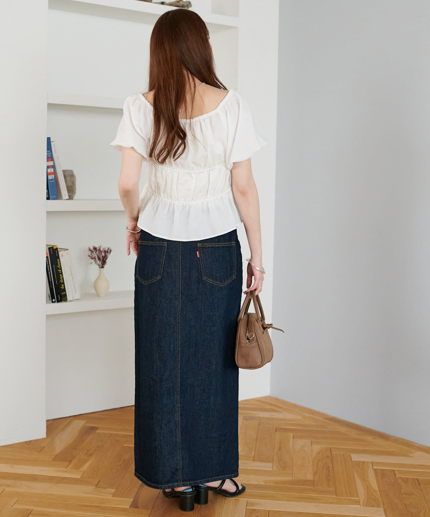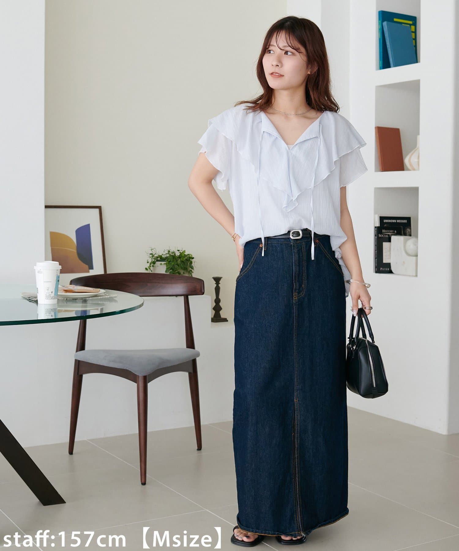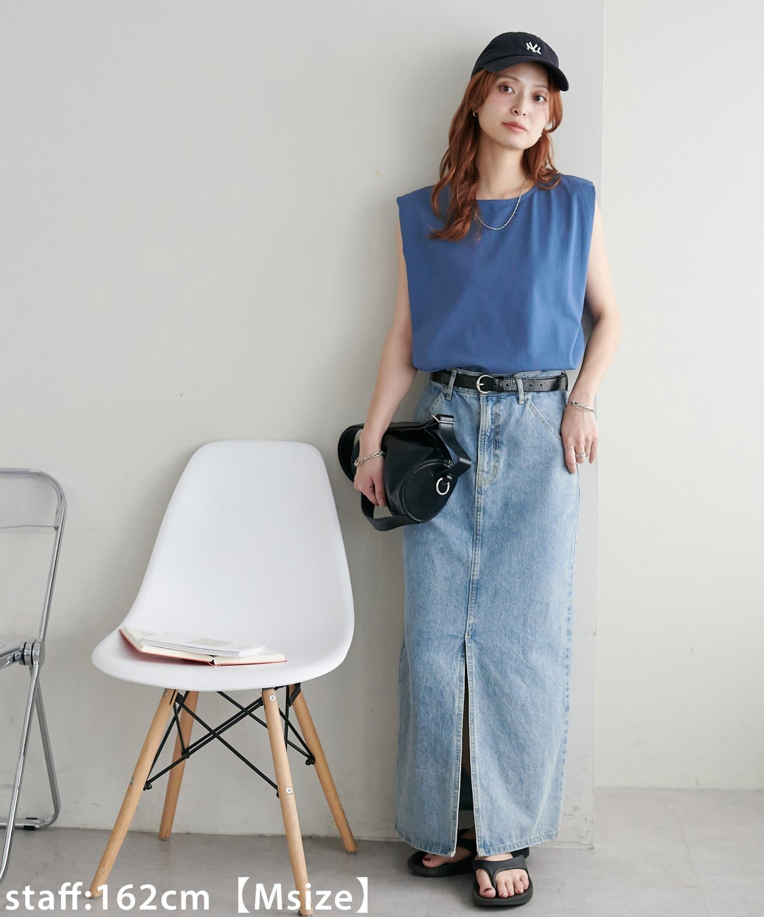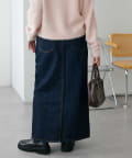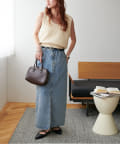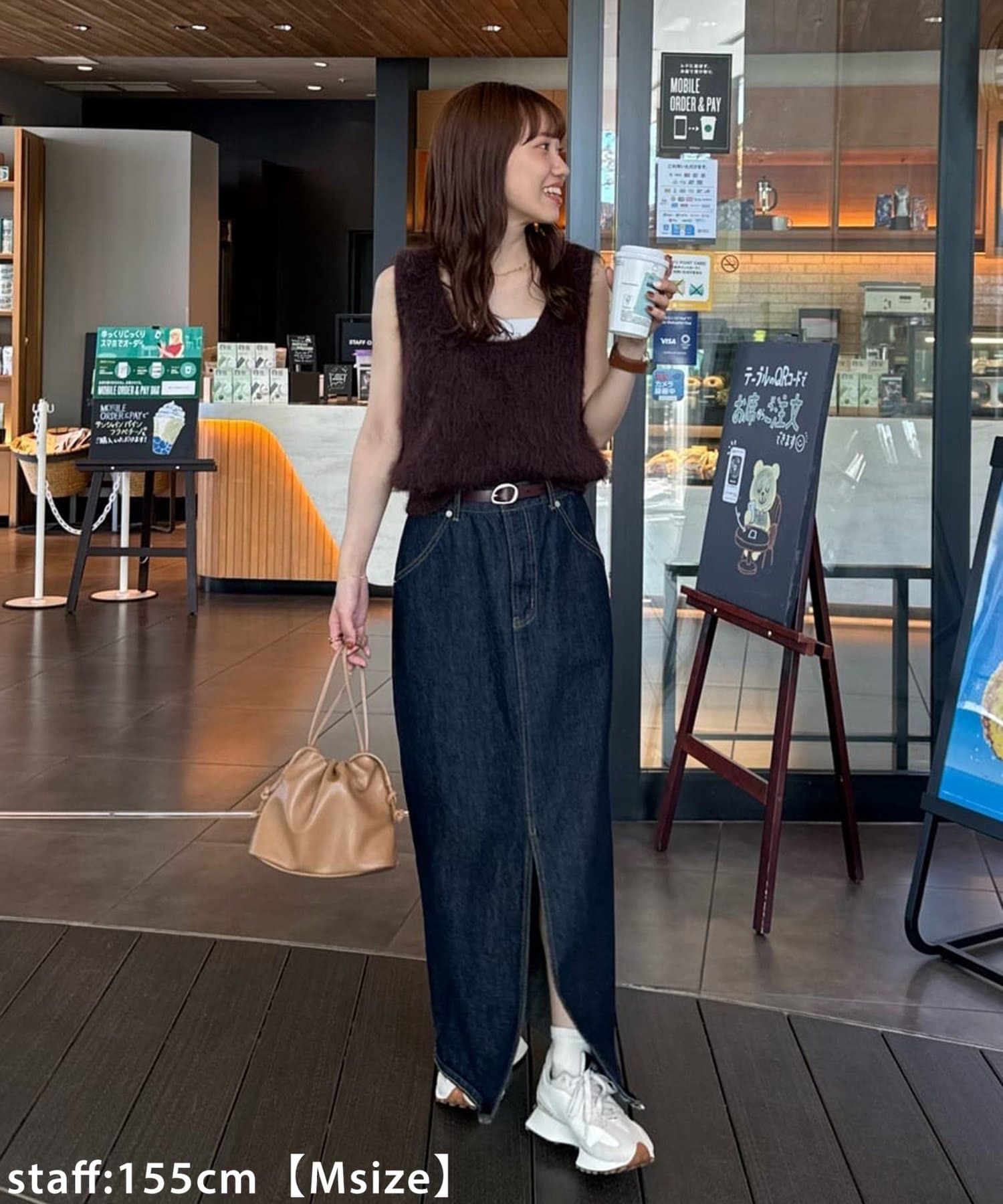華奢見えする美シルエットのデニムナロースカート。ベーシックなデザインで様々なトップスと合わせやすく、着回しのできるアイテムです。前スリットも入っているので歩きやすさも抜群!