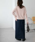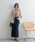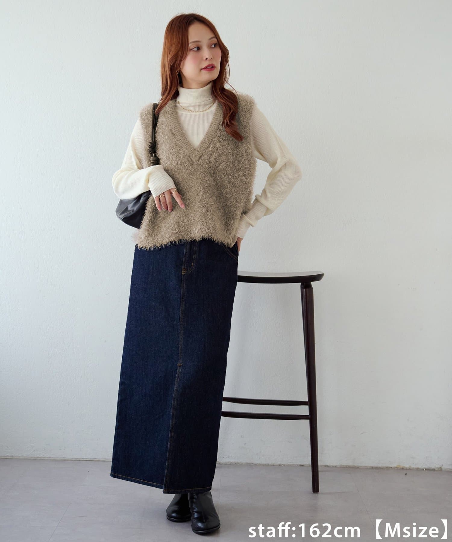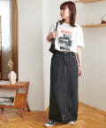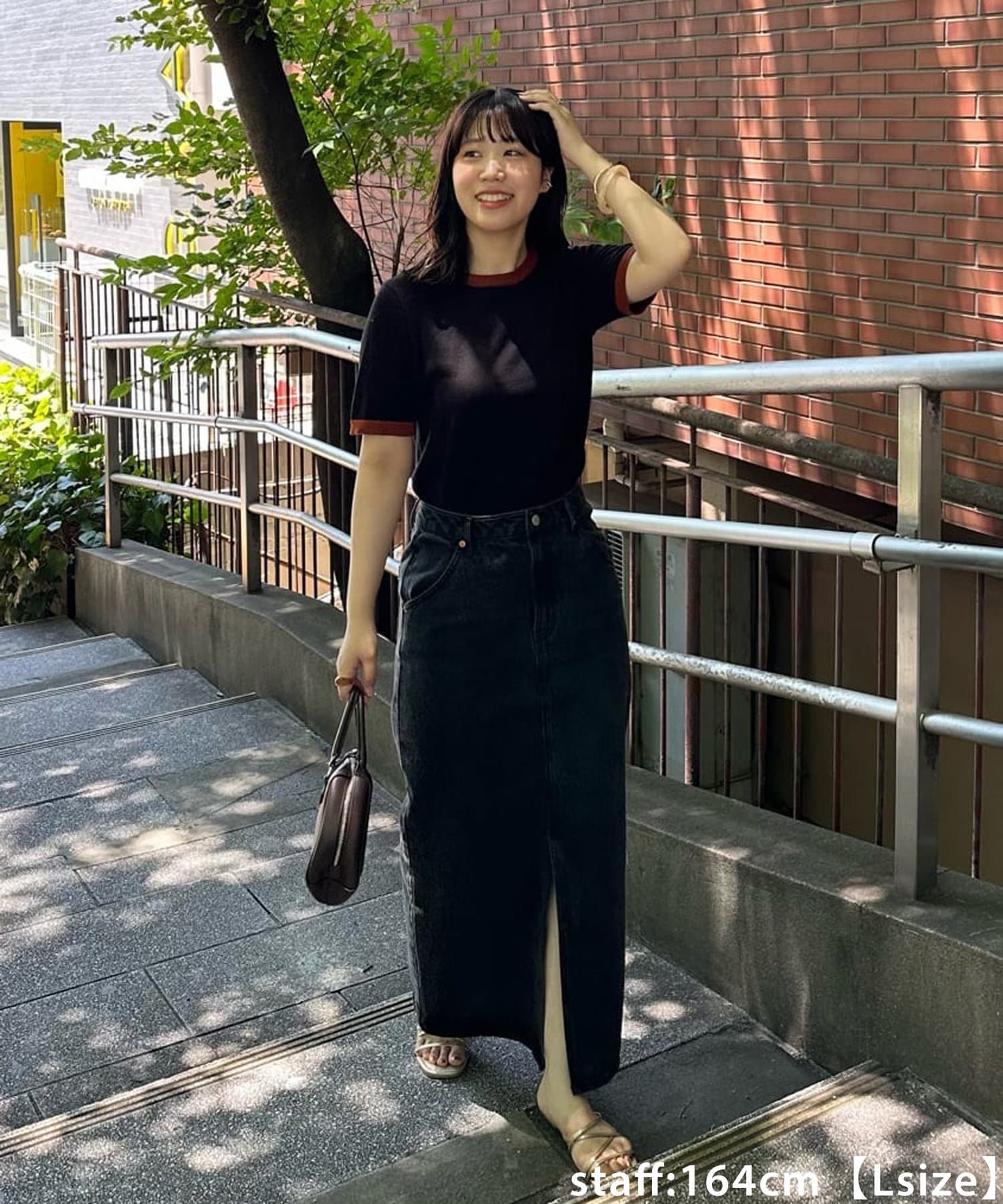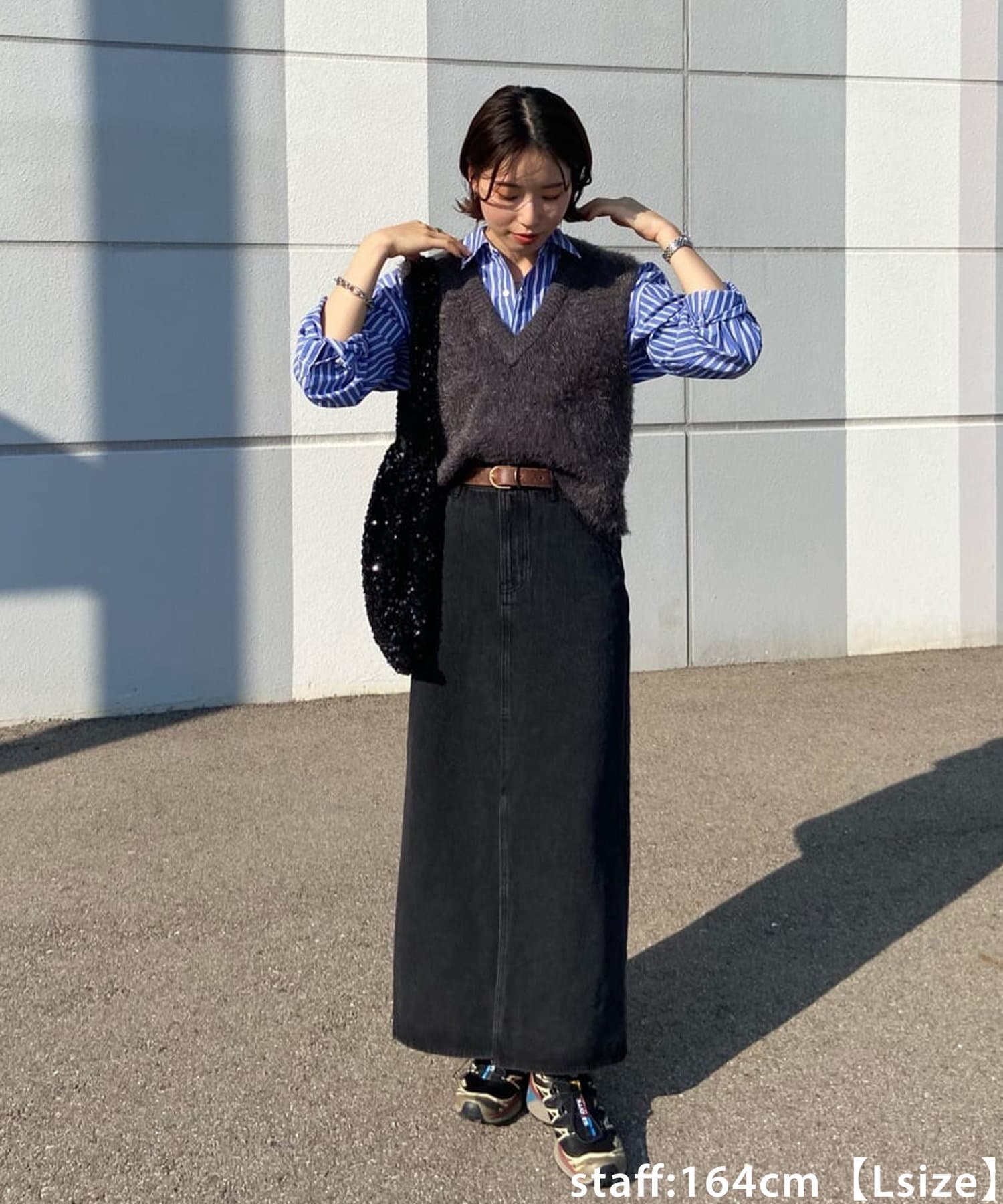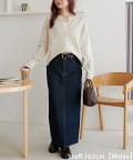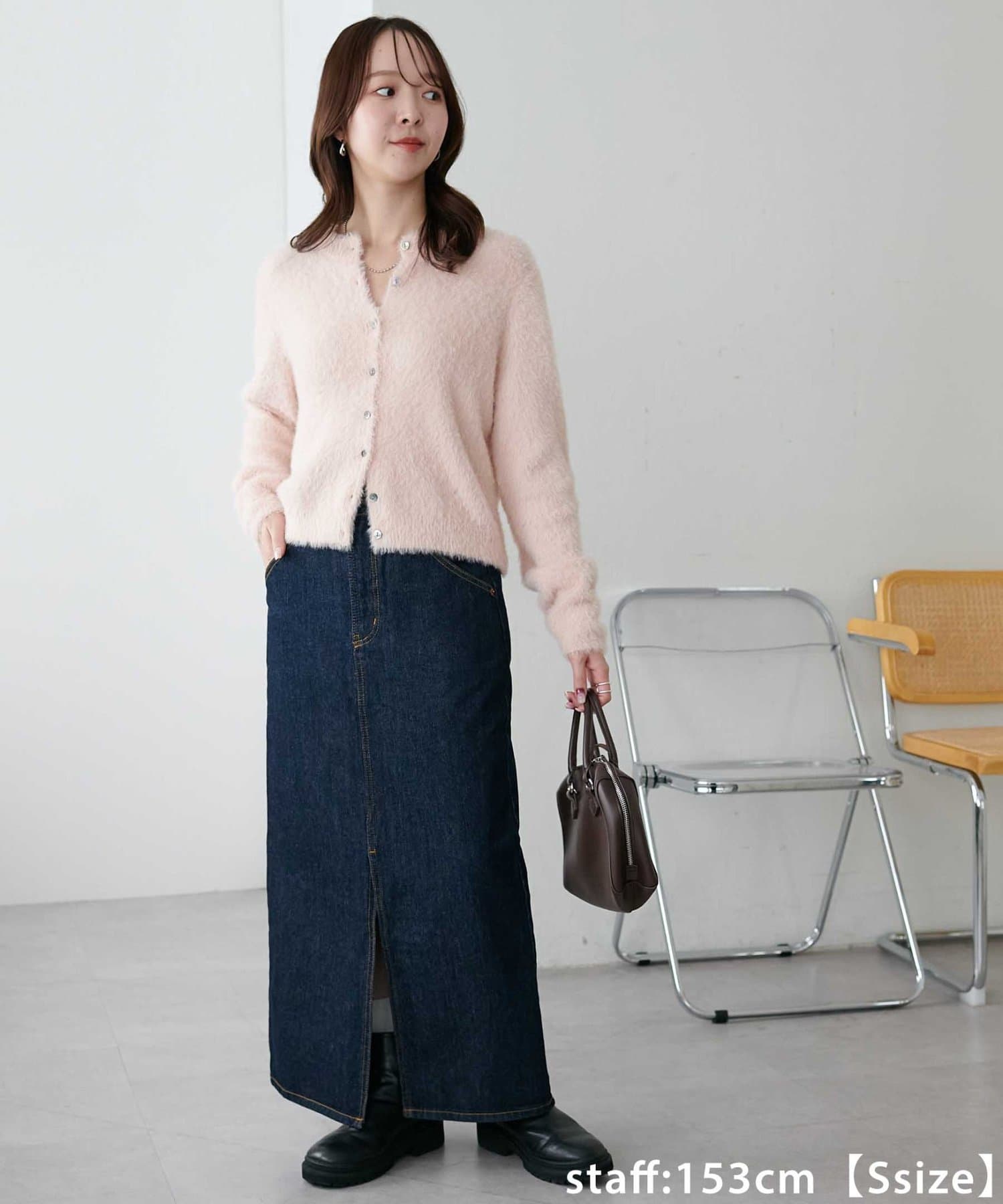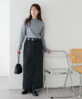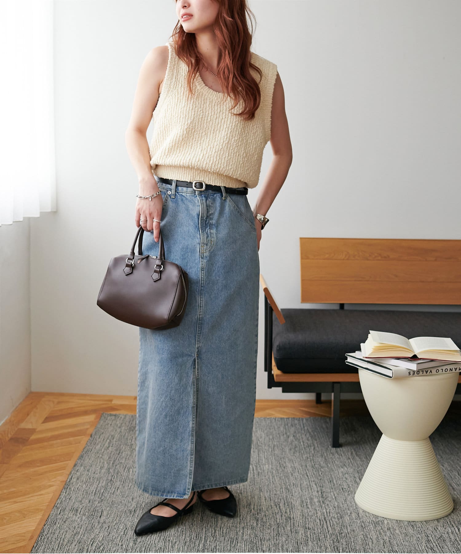 華奢見えする美シルエットのデニムナロースカート。ベーシックなデザインで様々なトップスと合わせやすく、着回しのできるアイテムです。前スリットも入っているので歩きやすさも抜群!
