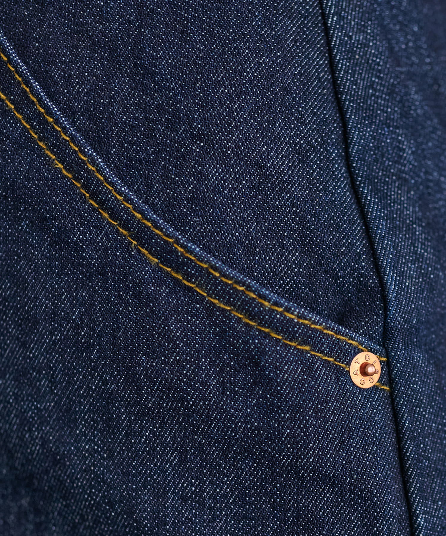 リニューアルデザインは、オリジナルのタック釦を使用し、バックポケットにピスネームをプラス、ポケット部分のボタンにはDISCOATと文字入れをし、生地ごとにカラーを変え細部までこだわりました。サックスブルーにはシルバー、ネイビー・ブラックにはブロンズとなっております。