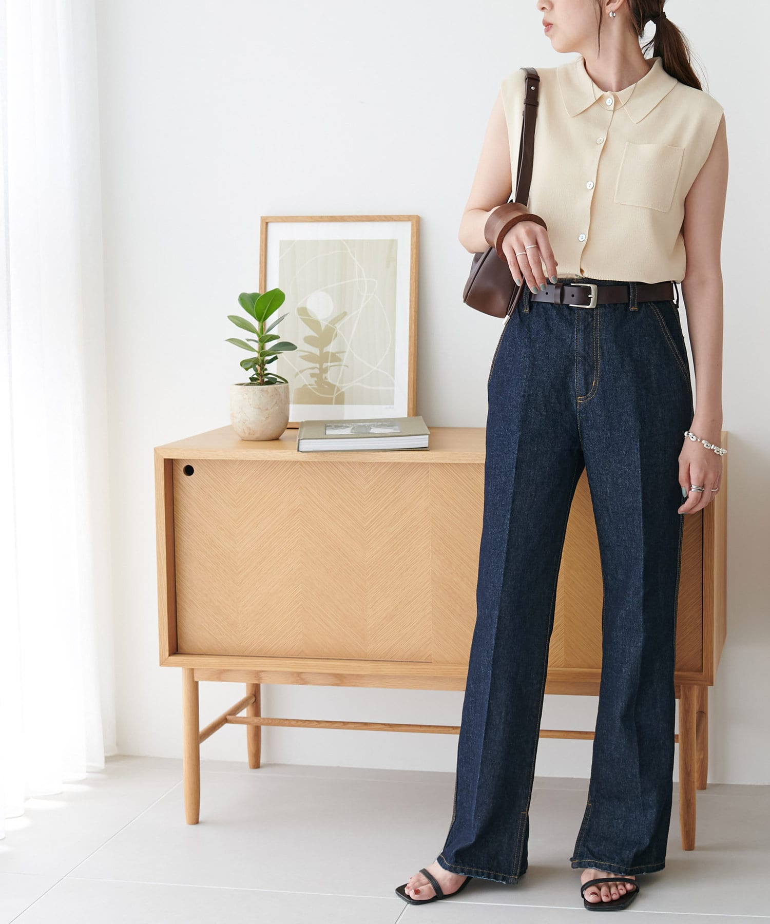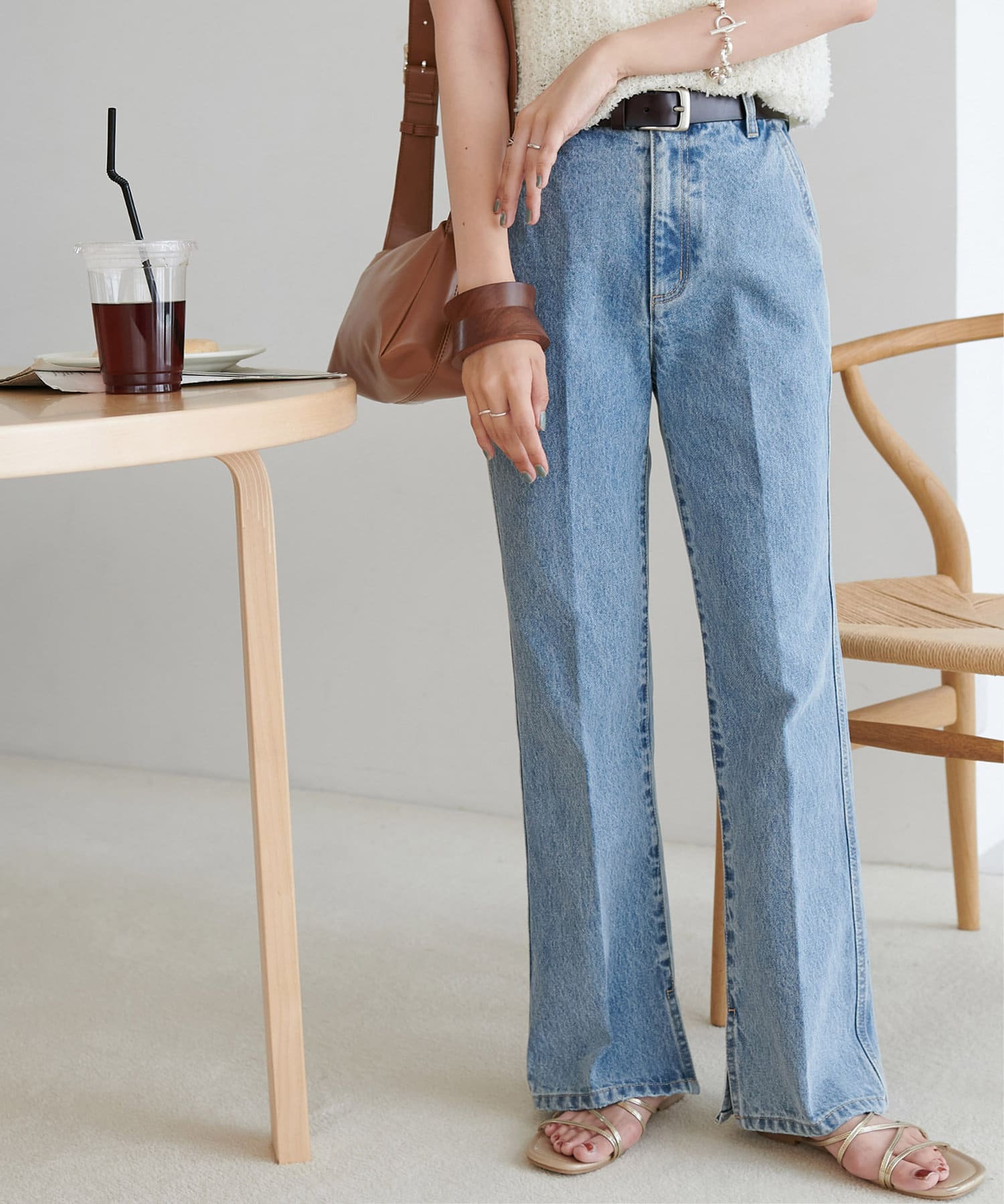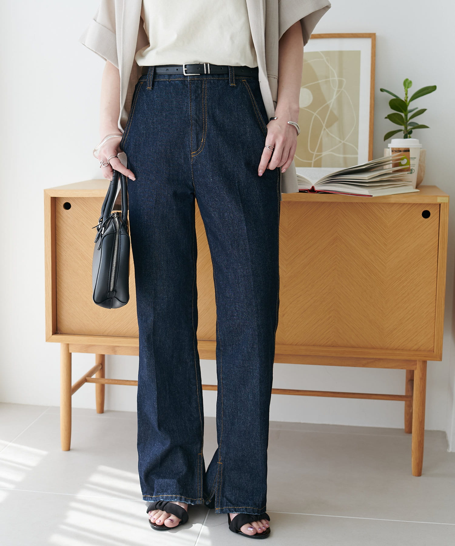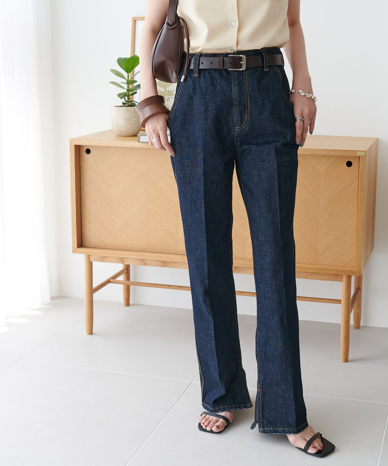 膝下からの程よい広がりとセンタープレスデザインが美脚効果をもたらす秘訣です。カジュアルながらも裾にスリットを入れることにより、抜け感と女性らしさをプラスします。カットオフデザインがなくなったことで、よりスッキリとした印象に。
