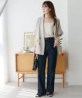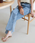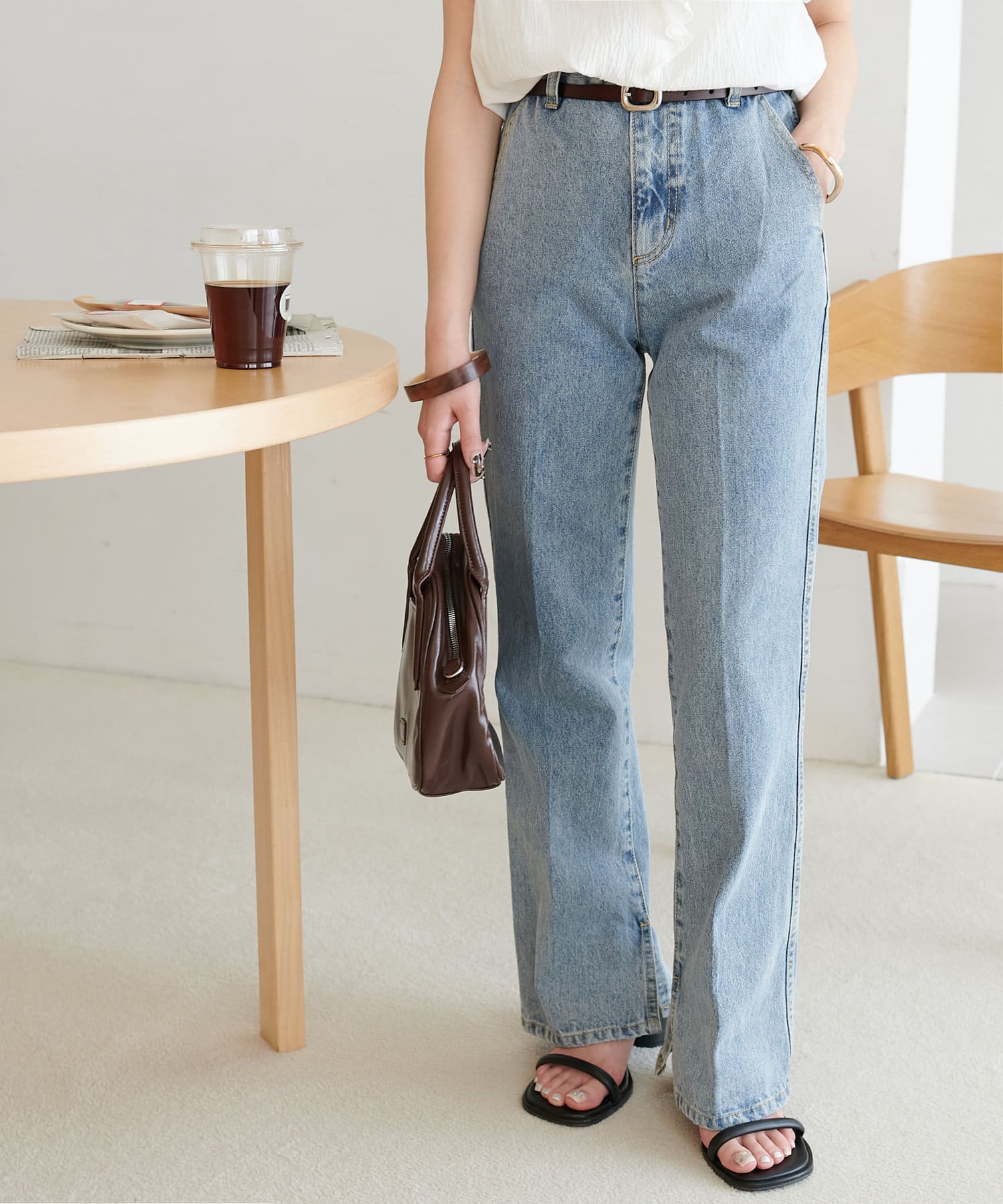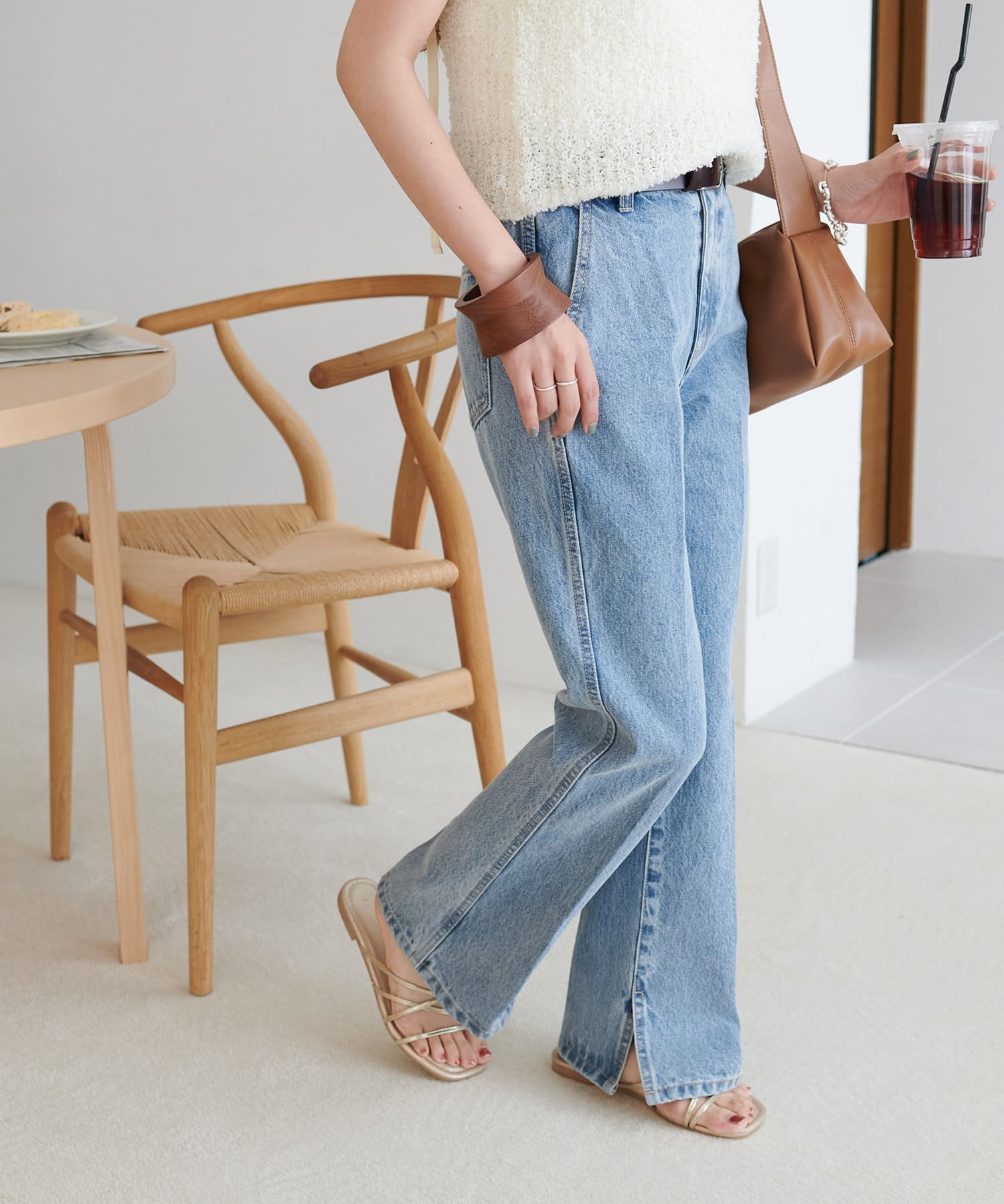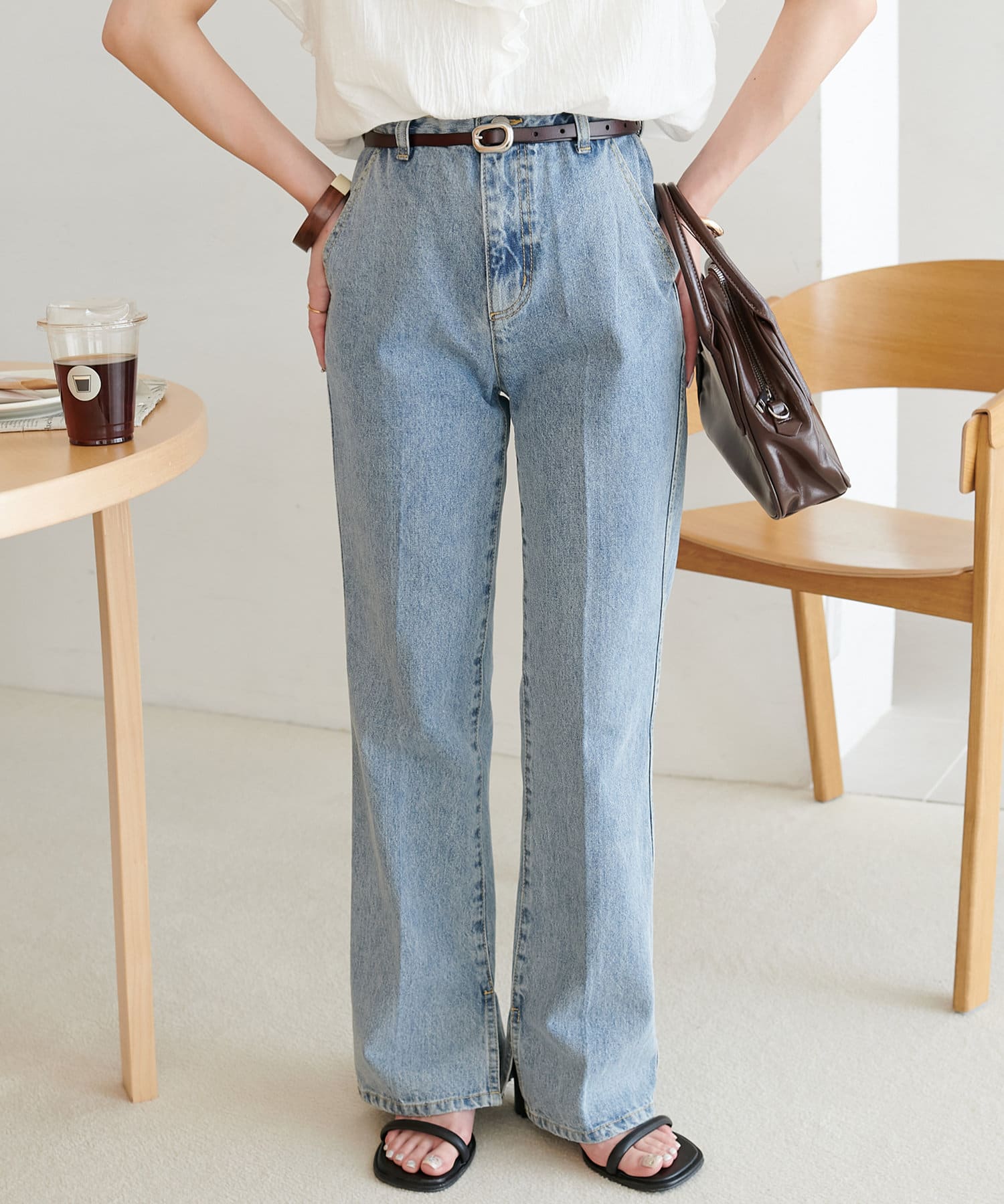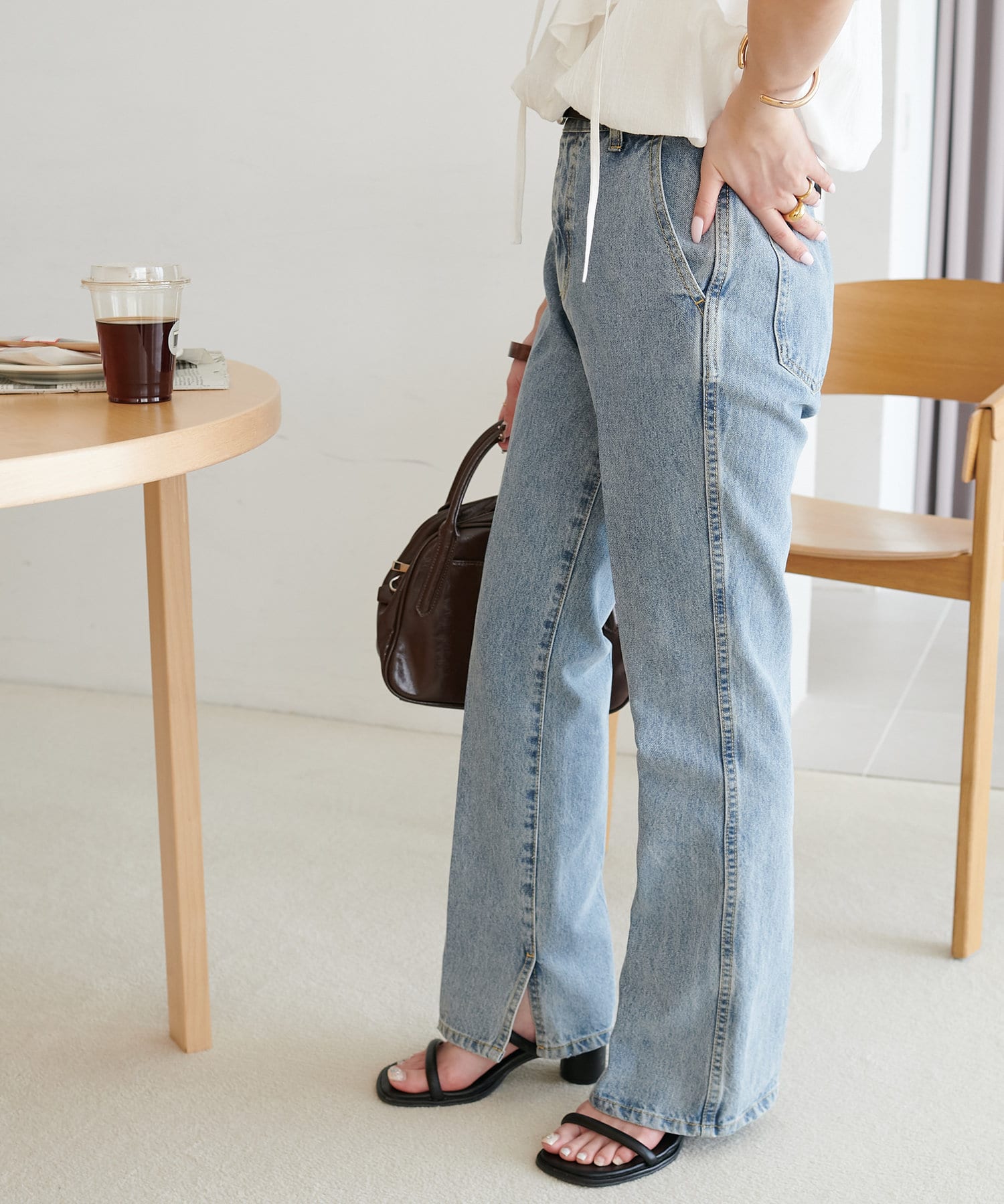 膝下からの程よい広がりとセンタープレスデザインが美脚効果をもたらす秘訣です。カジュアルながらも裾にスリットを入れることにより、抜け感と女性らしさをプラスします。カットオフデザインがなくなったことで、よりスッキリとした印象に。