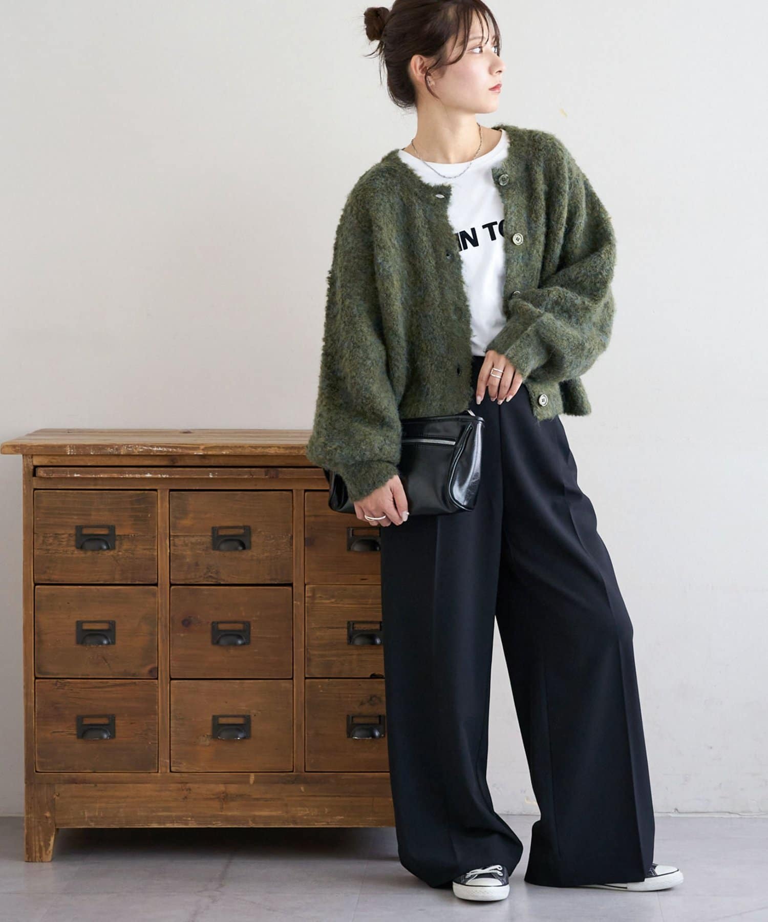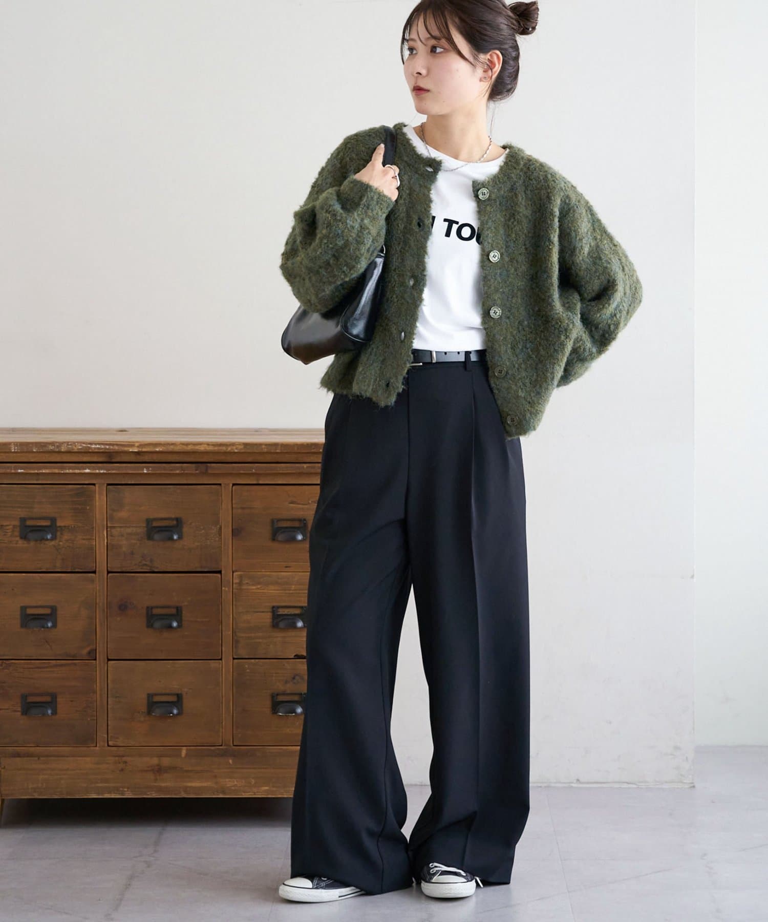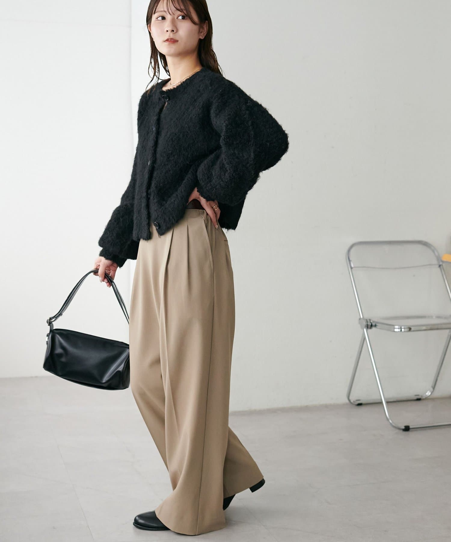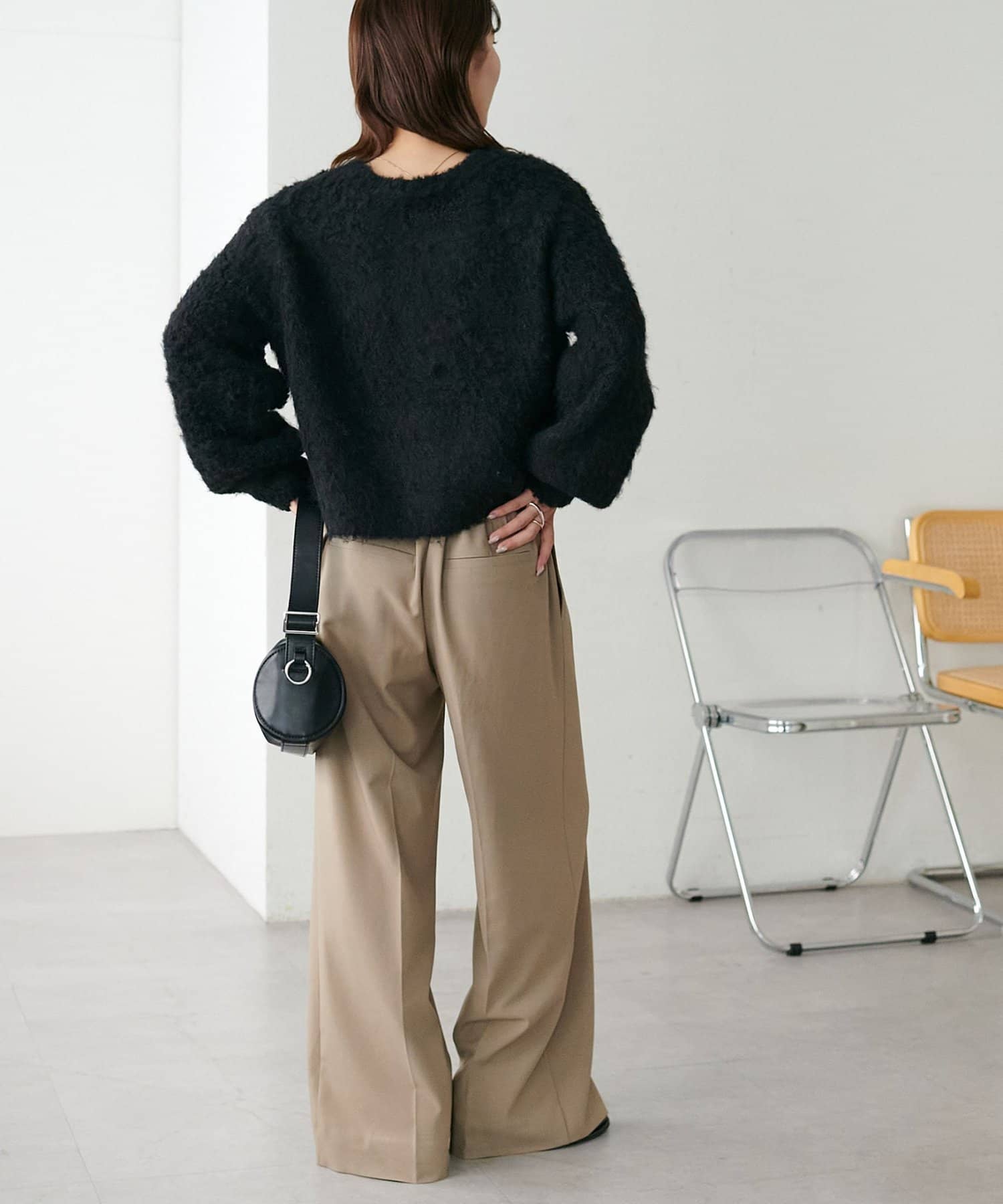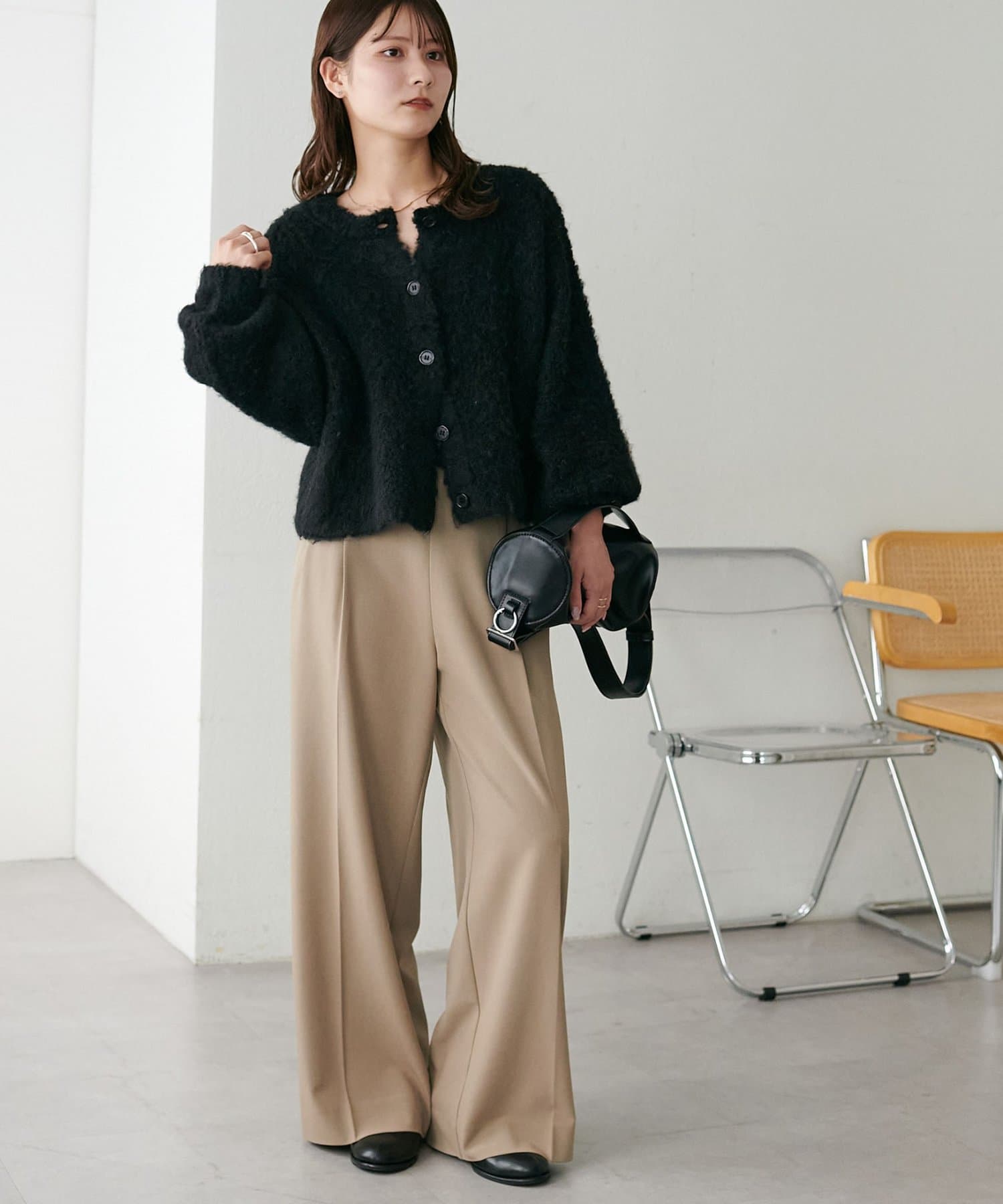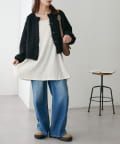 腰丈のコンパクトなシルエットなので、ハイウエストパンツやワイドパンツとの相性が抜群◎