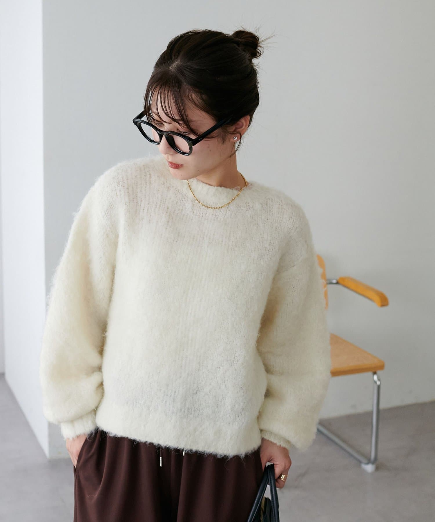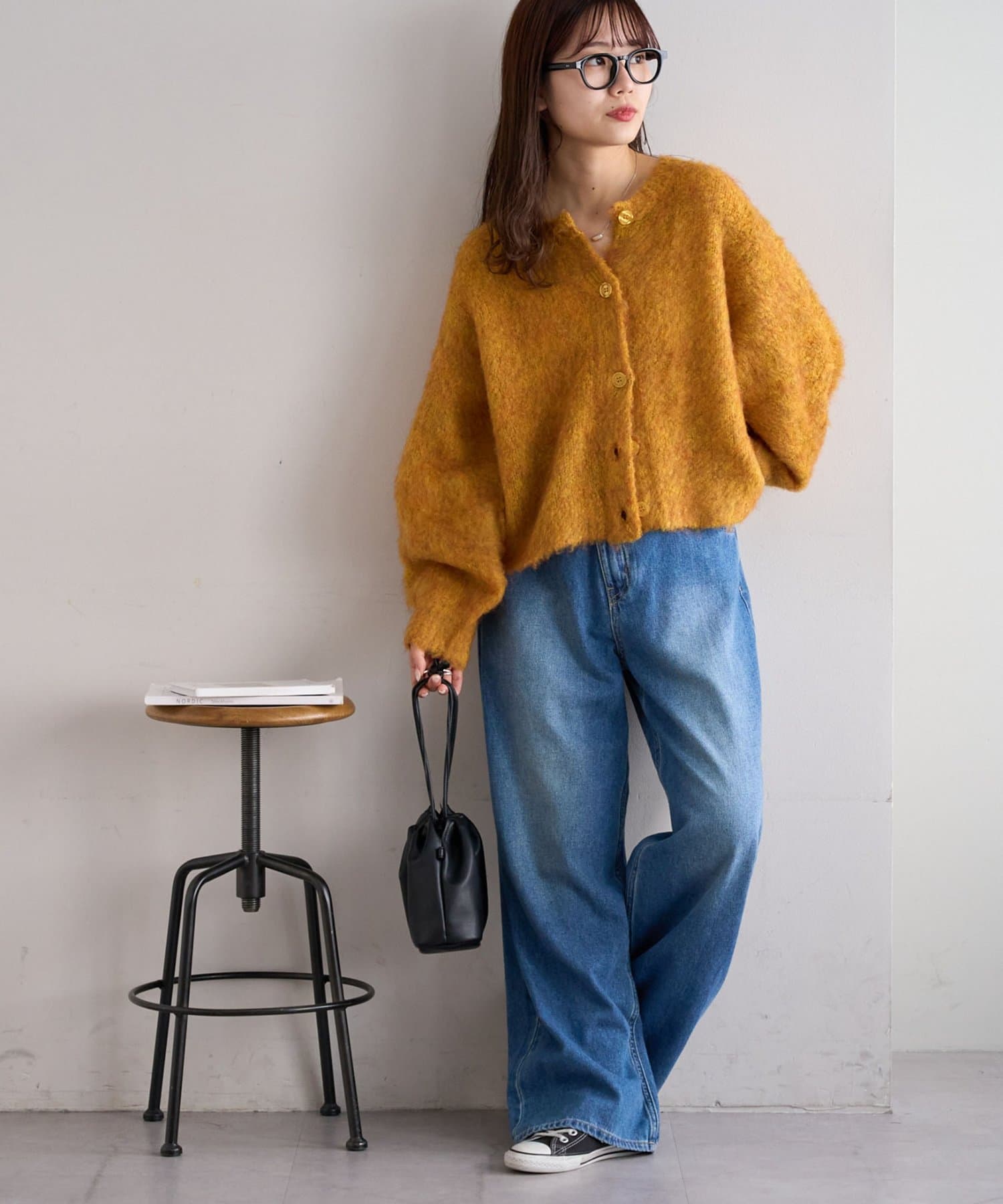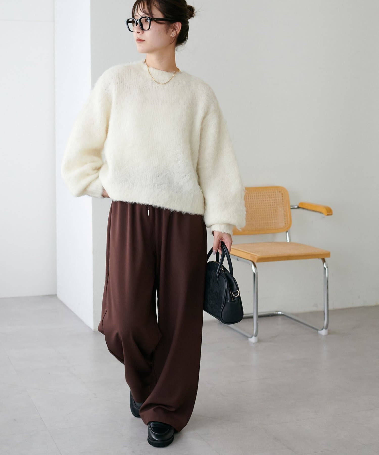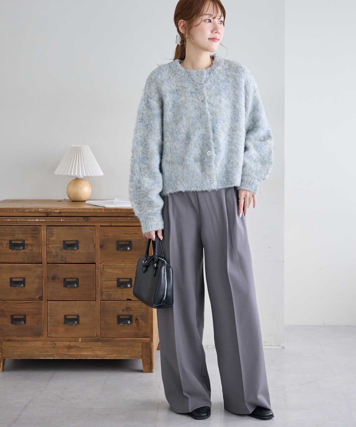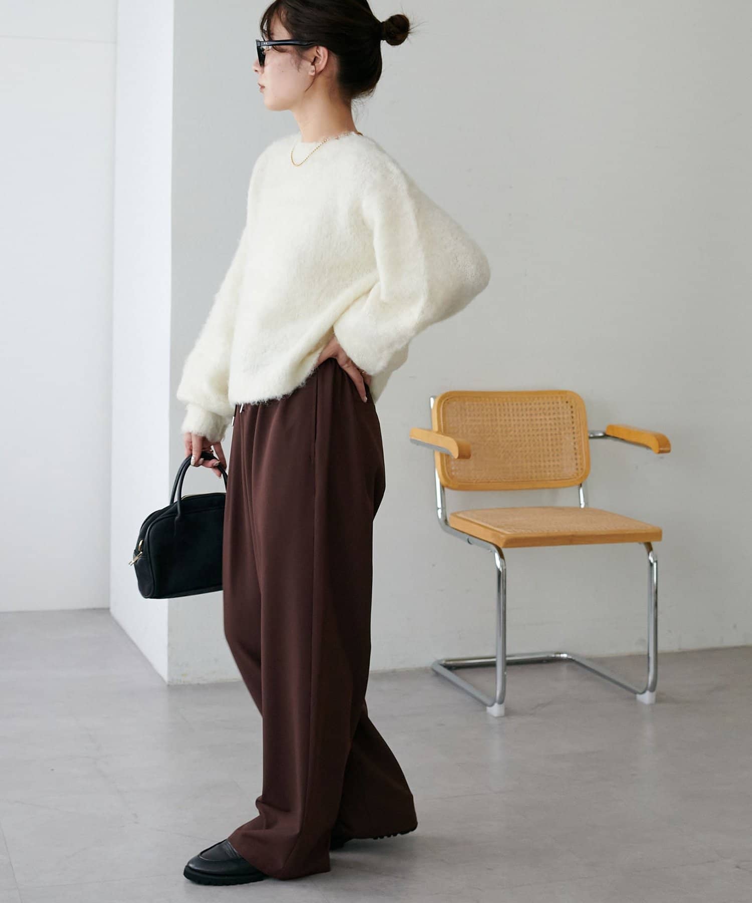 腰丈のコンパクトなシルエットなので、ハイウエストパンツやワイドパンツとの相性が抜群◎