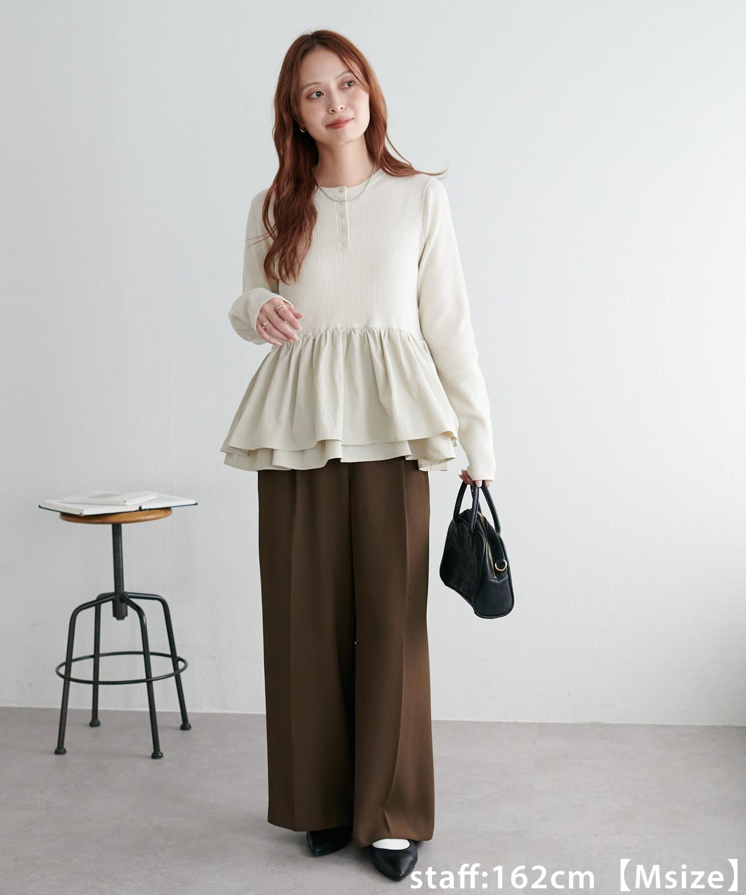 158cmスタッフ(Mサイズ):ワイドなシルエットで腰回りがスラッと細く見えますが、タックが入っているので余裕もありリラックスして着ることができます!オンオフ問わず合わせられるので、年代問わずおすすめです。