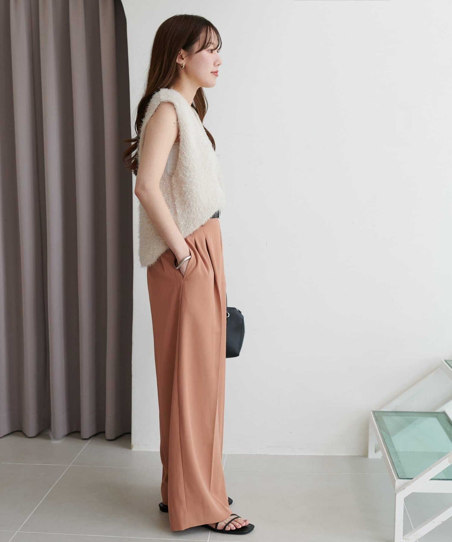 ・ワイドパンツなので、コンパクトな着丈のトップス合わせはメリハリのあるコーデに!