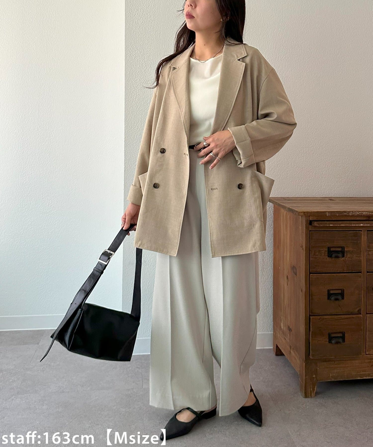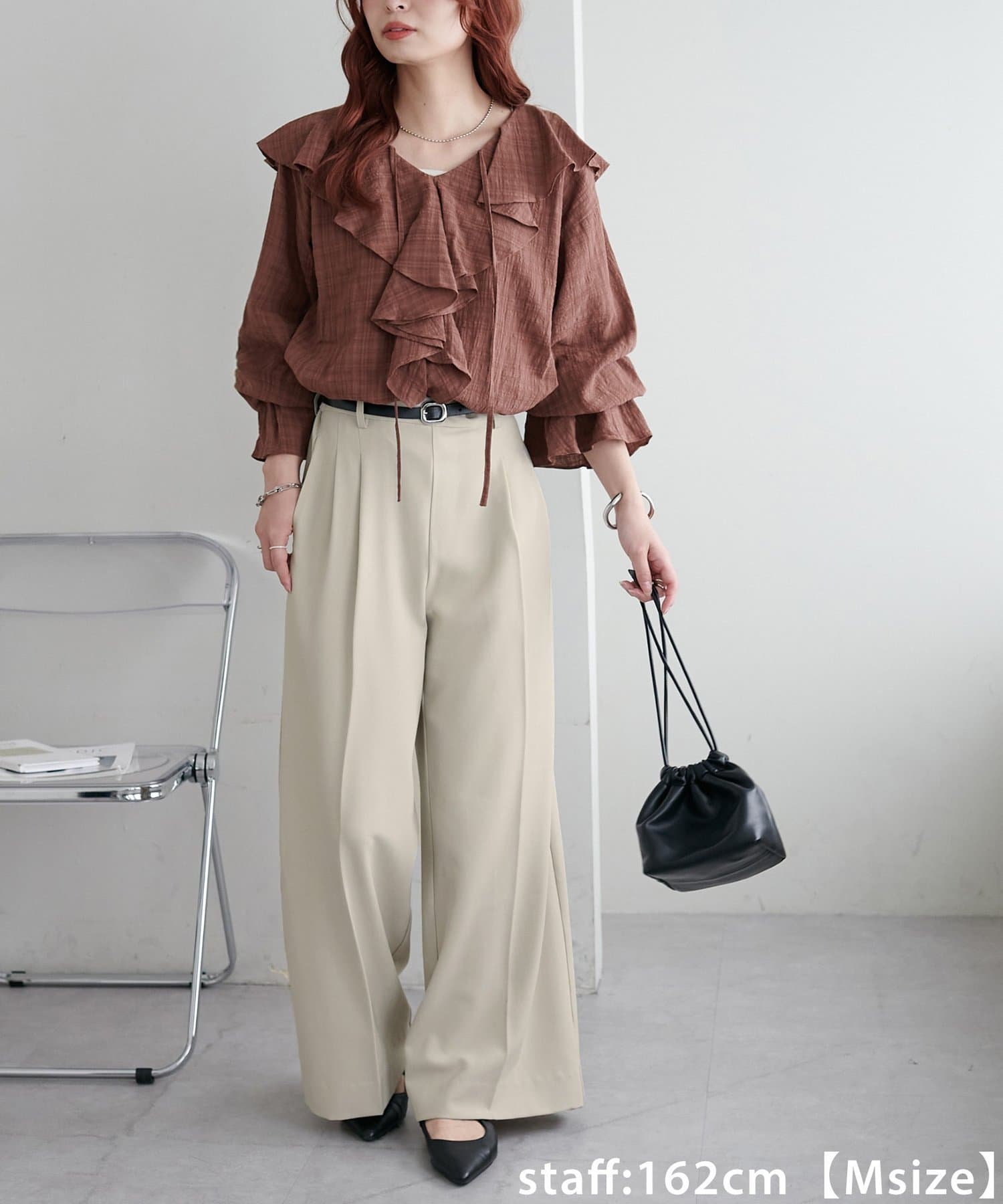 158cmスタッフ(Mサイズ):ワイドなシルエットで腰回りがスラッと細く見えますが、タックが入っているので余裕もありリラックスして着ることができます!オンオフ問わず合わせられるので、年代問わずおすすめです。