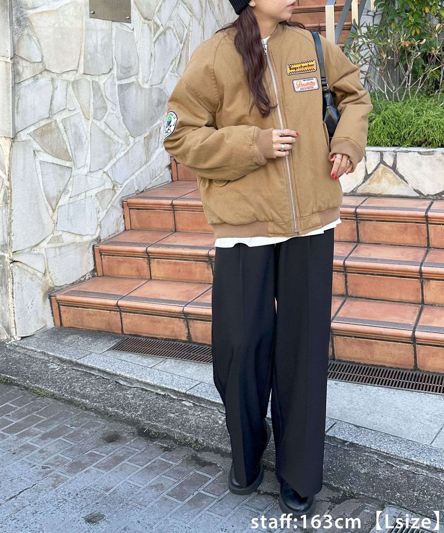 165cmスタッフ(TMサイズ着用):Lサイズだと丈が足りなくなることが多いですが、TMサイズはスニーカーでもブーツでも合わせやすい丈感◎