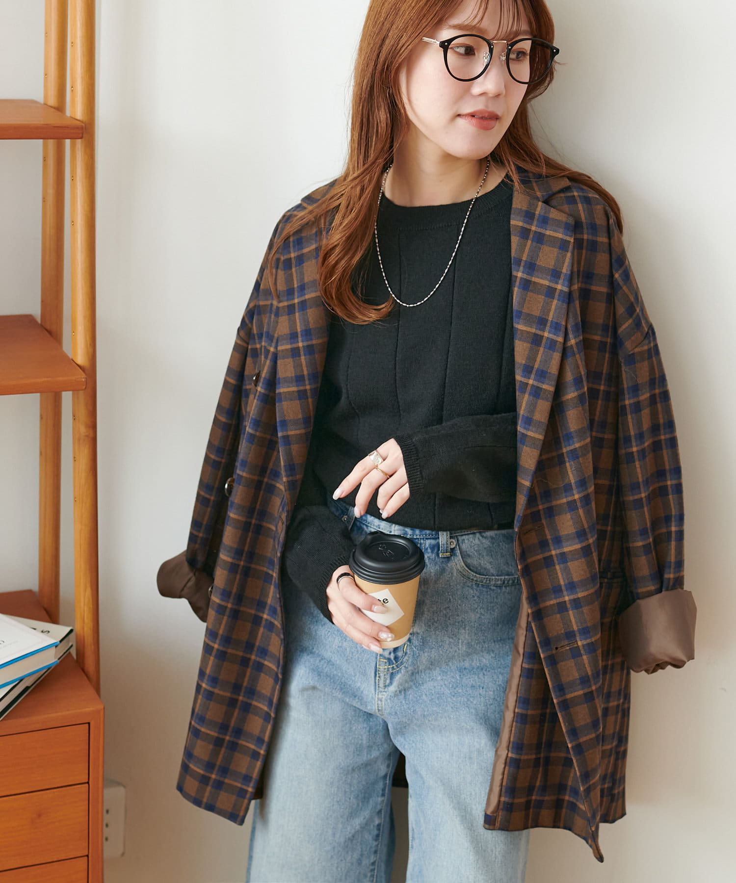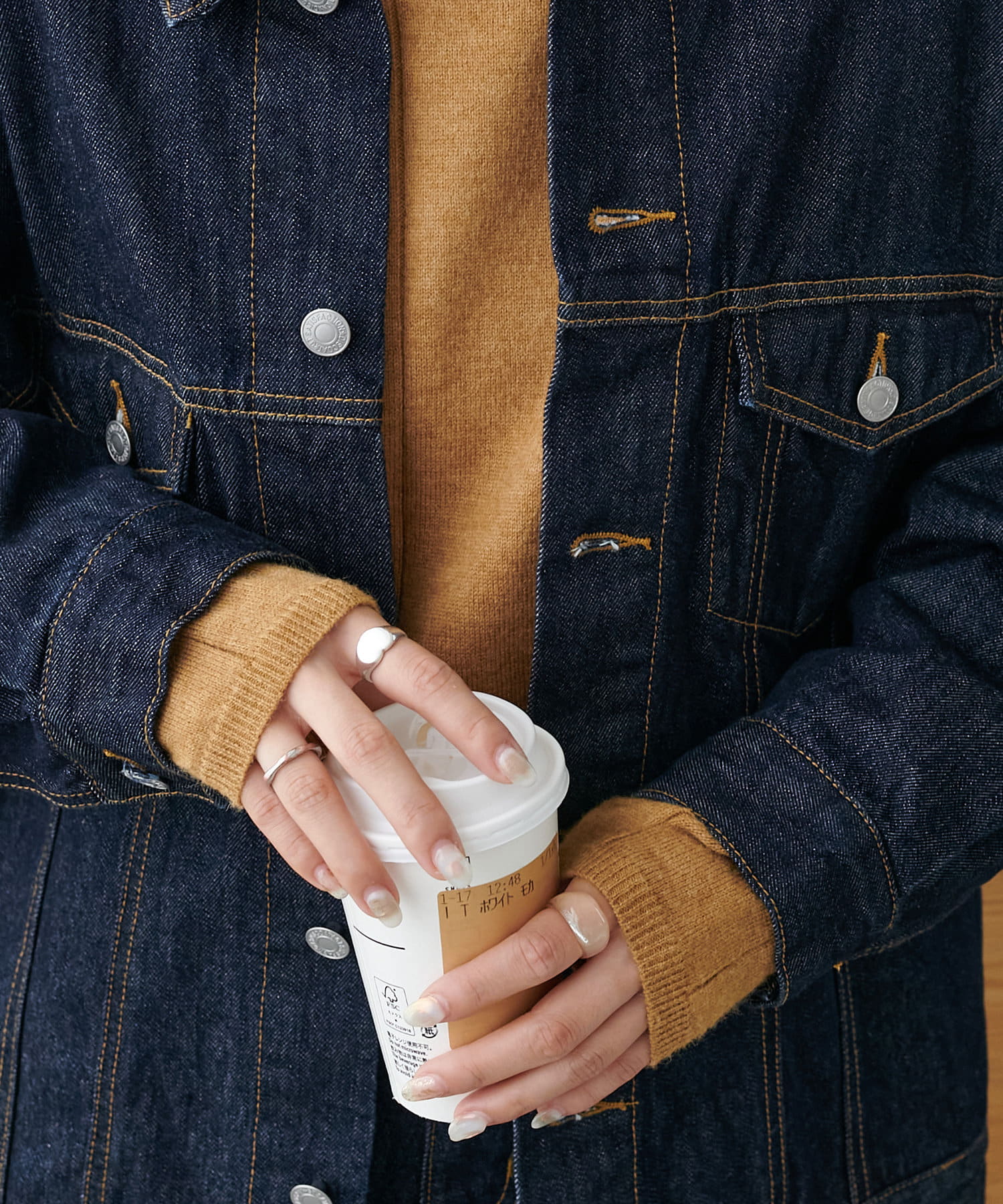 ・158cmスタッフ(Mサイズ着用):程よいフィット感で窮屈な感じもなく着心地も◎シルエットもとても綺麗なので1枚で着ていても様になります。