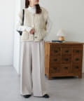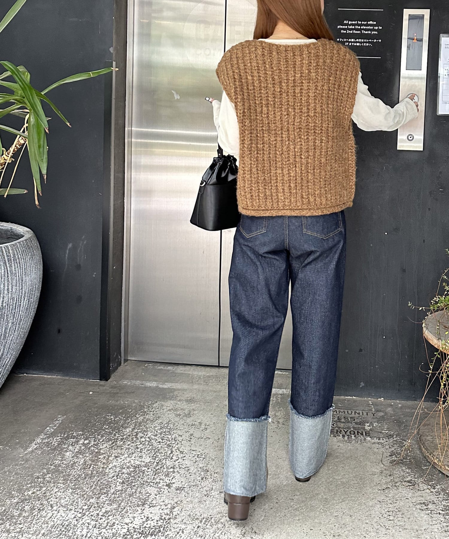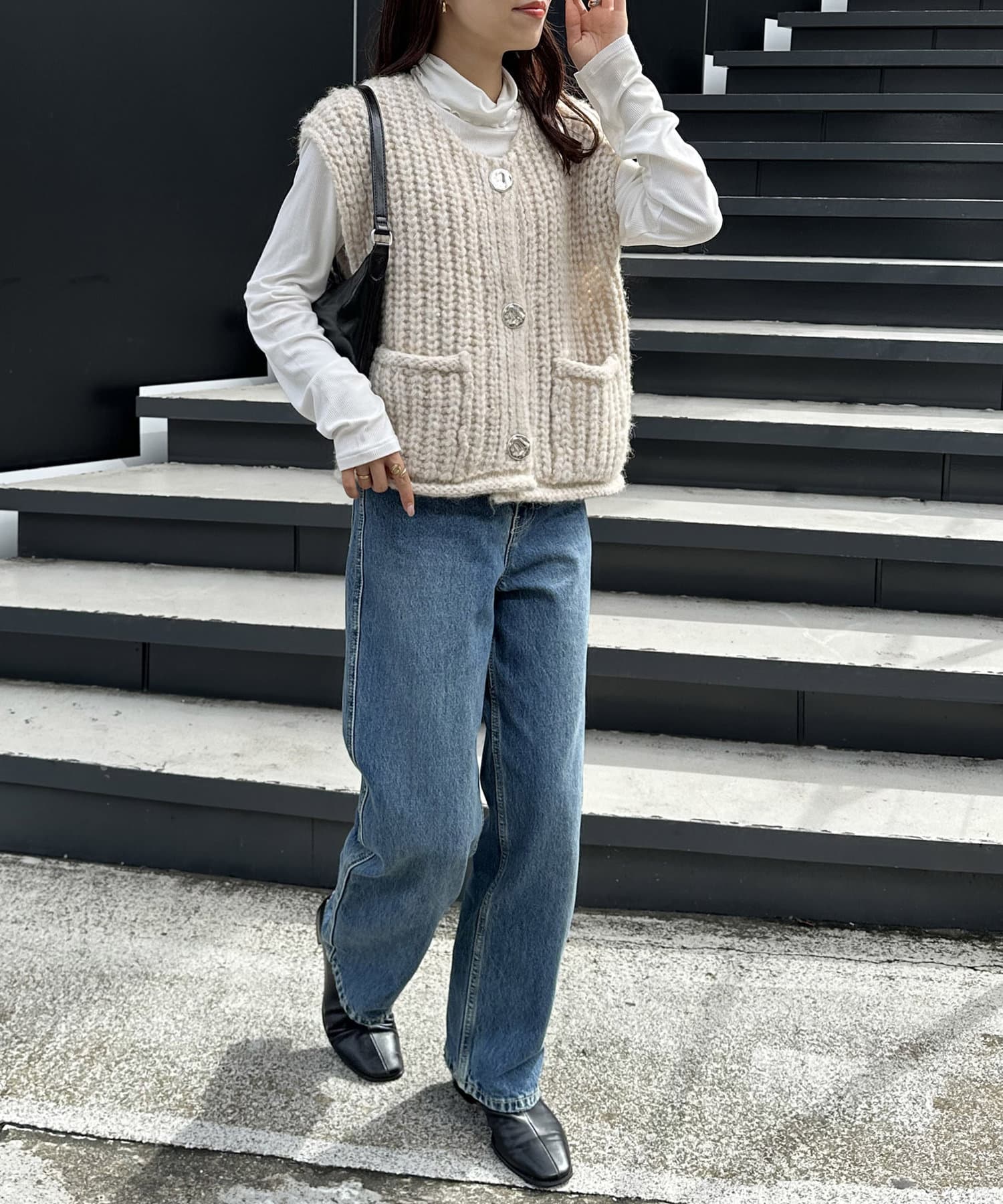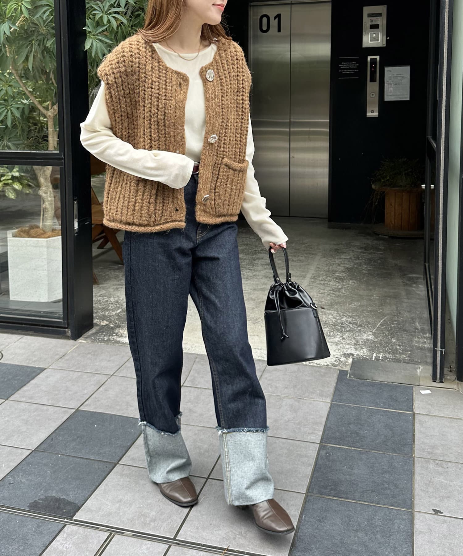 前を開けても着用できるベストは、着回しが効くのでワードローブの強い味方になります。