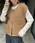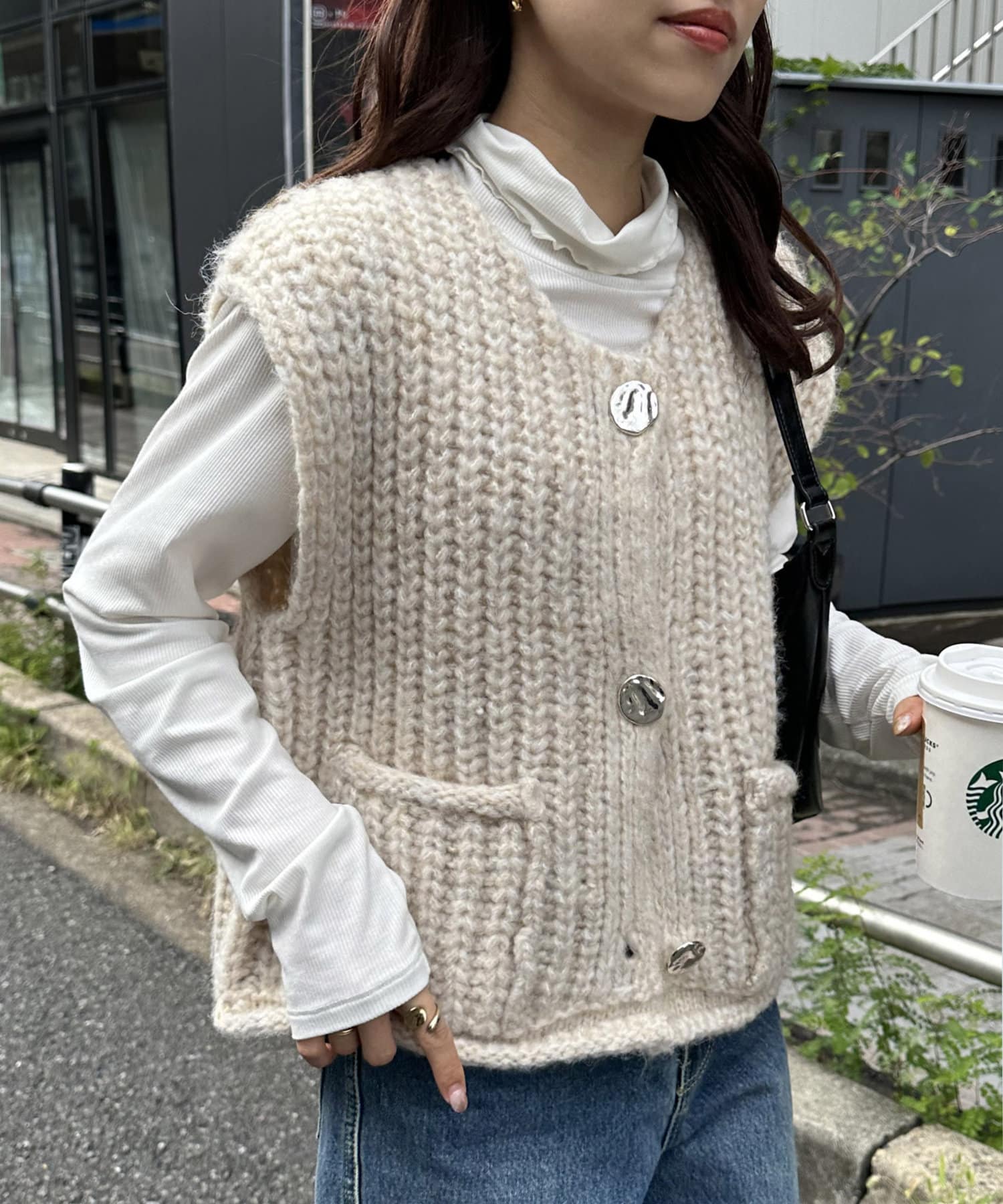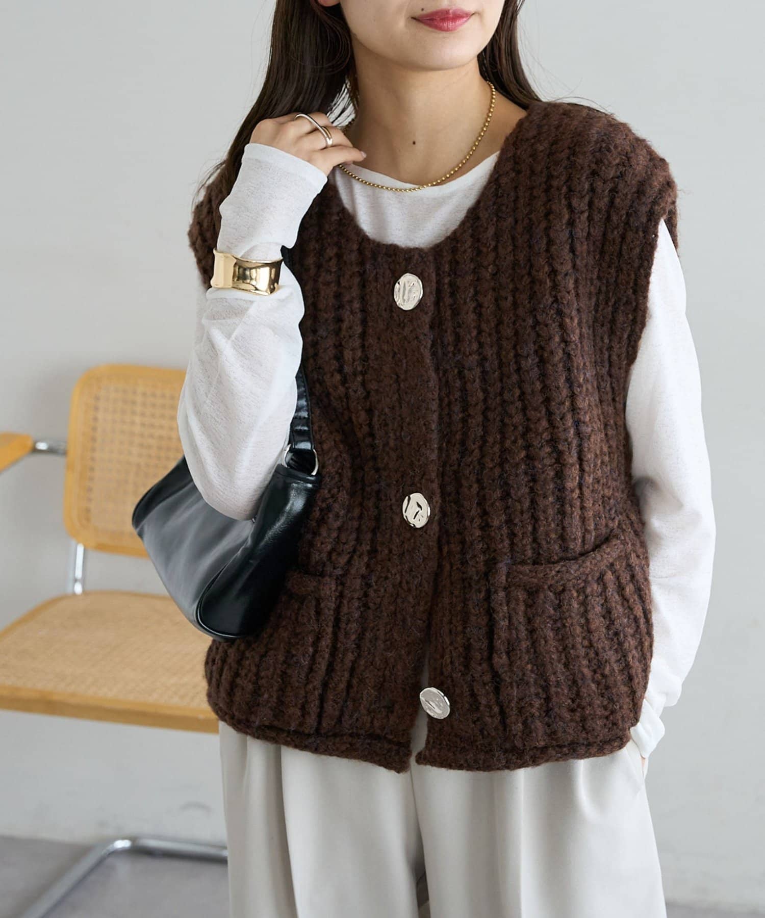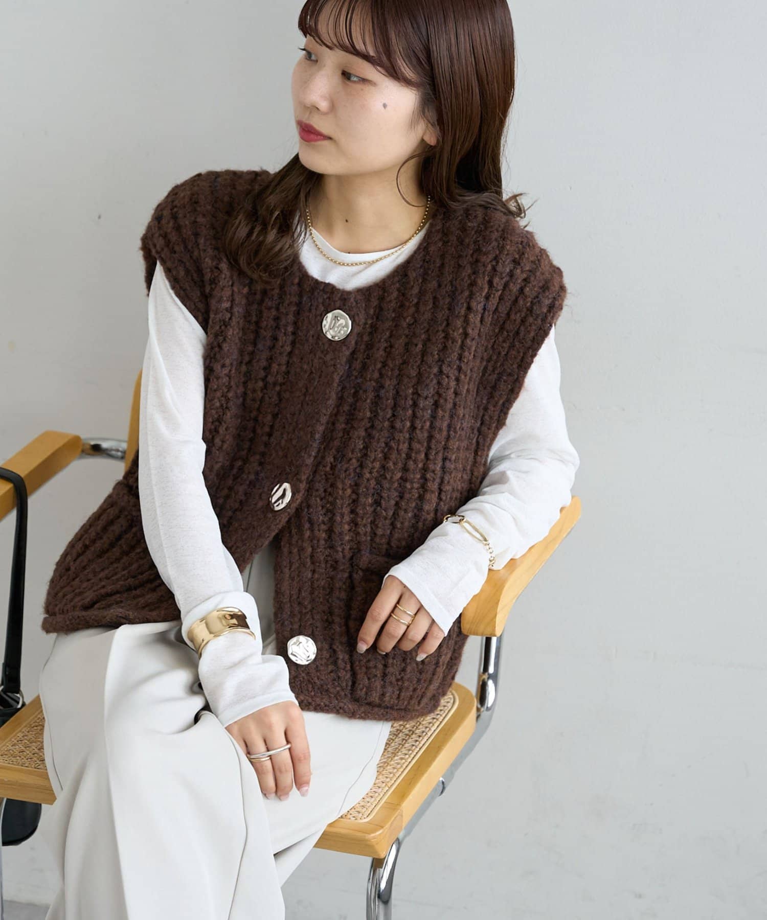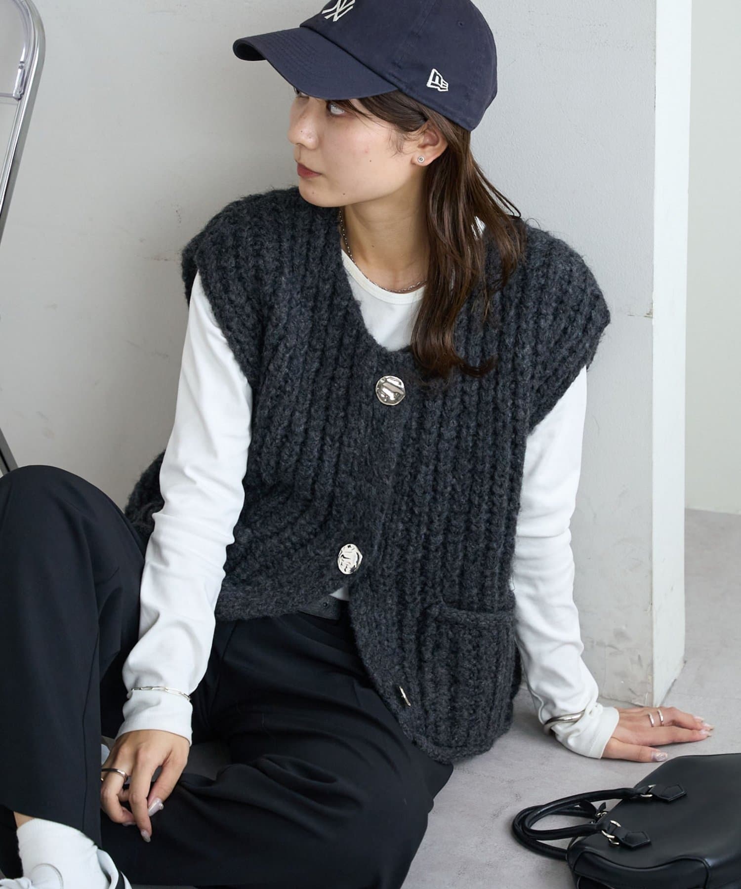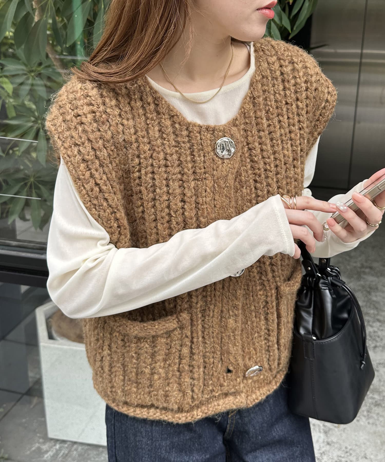 大きなデザインボタンが目を引くニットベスト。ざっくりとした網目がシーズンムードを高めてくれます♪フロントのポケットもアクセントになり他とは差がつく1枚に!