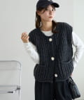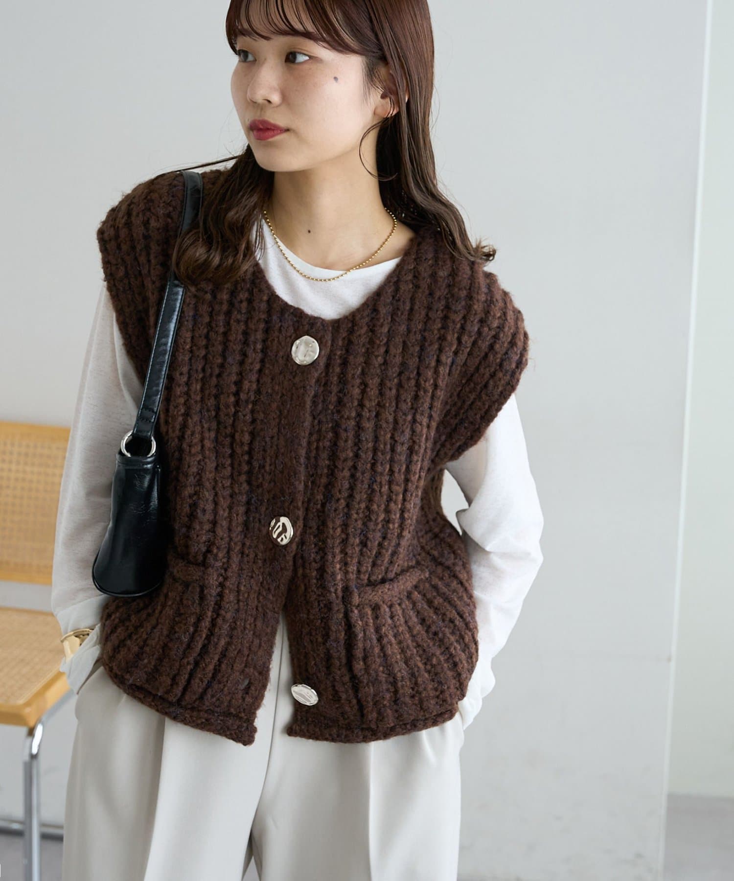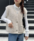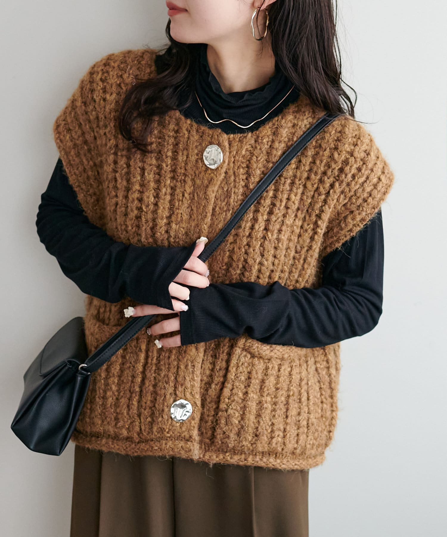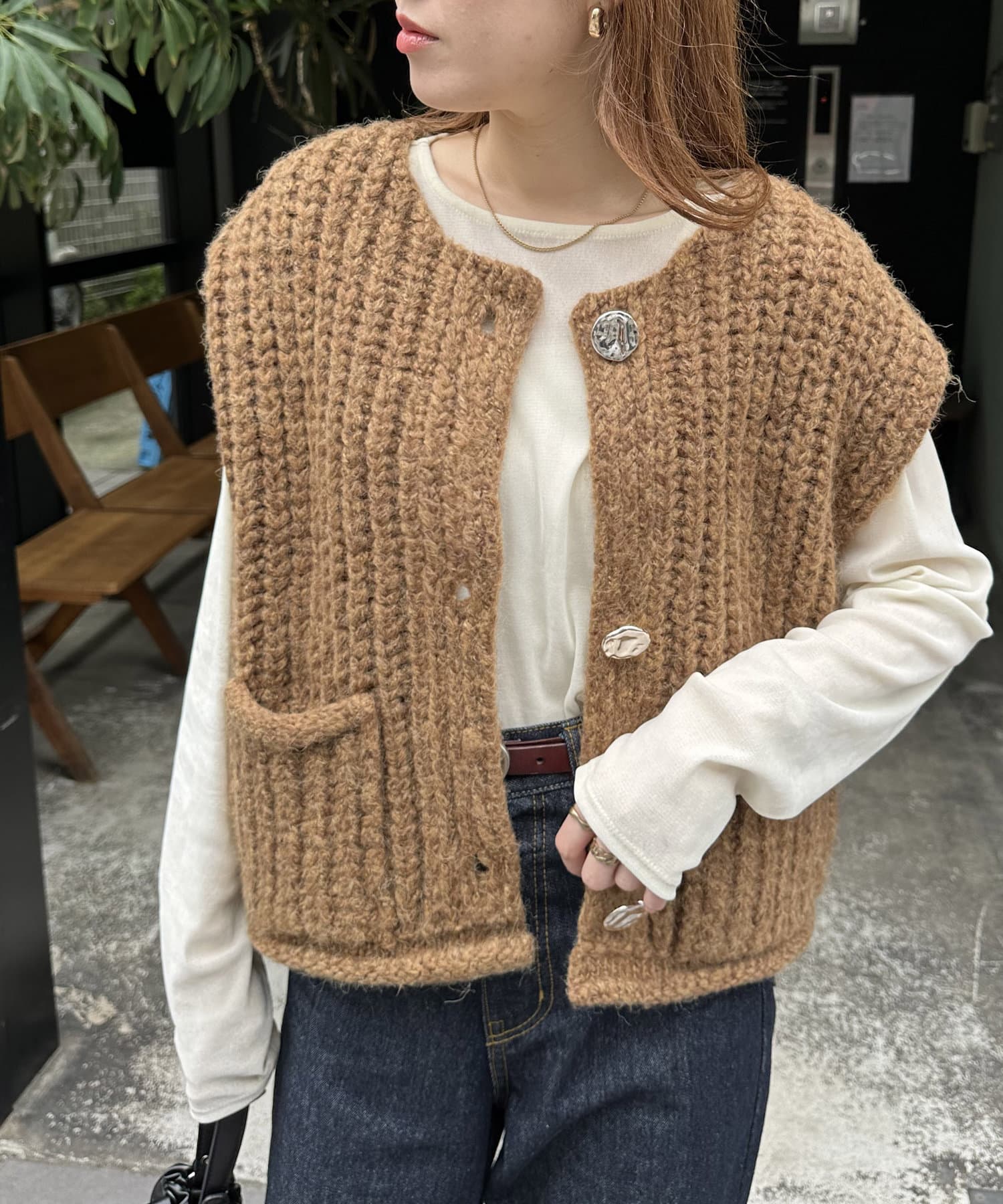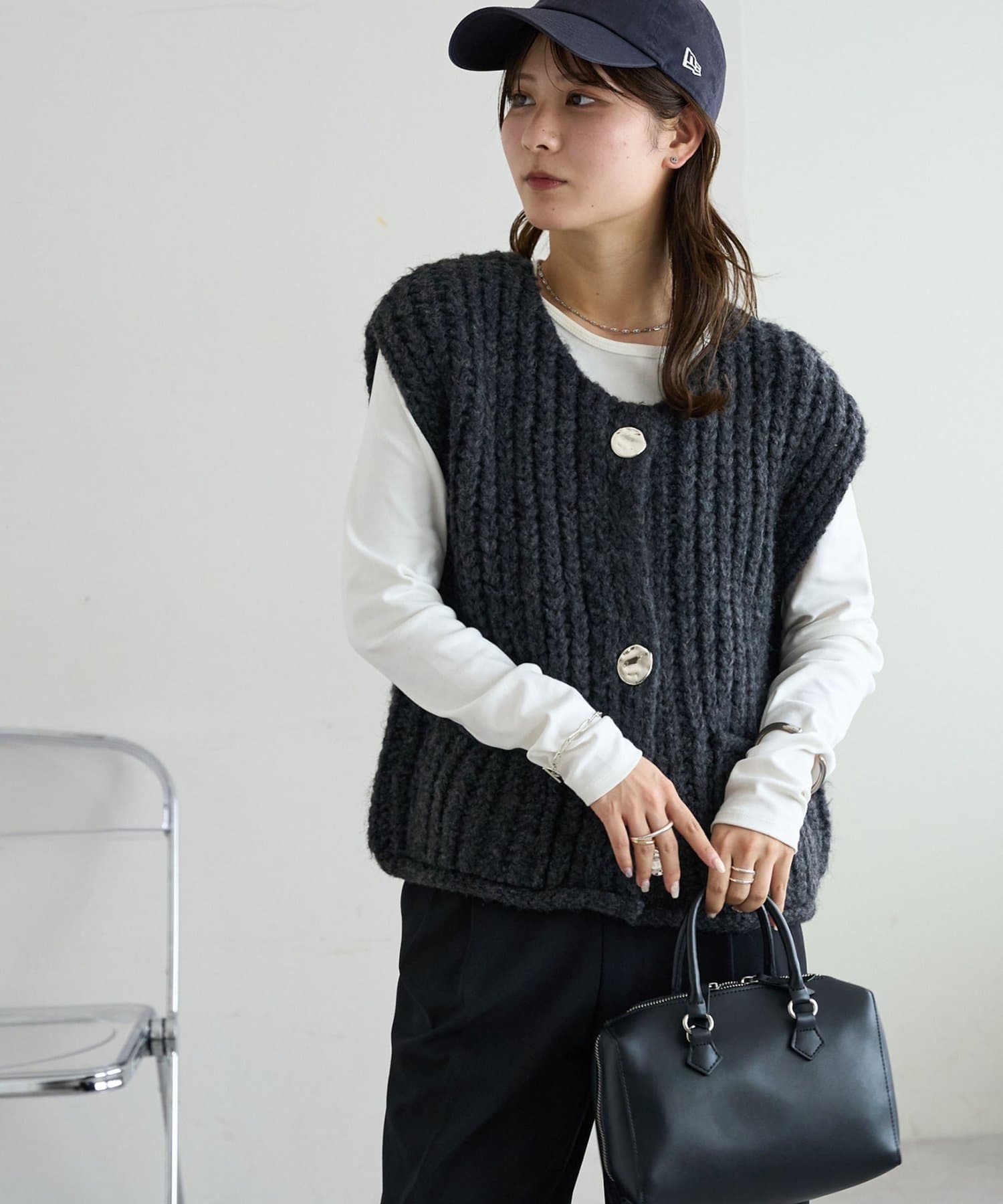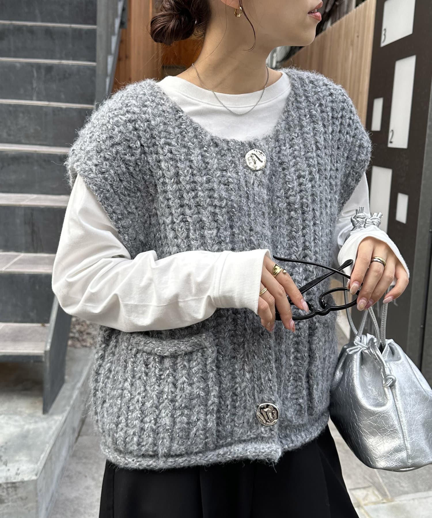 大きなデザインボタンが目を引くニットベスト。ざっくりとした網目がシーズンムードを高めてくれます♪フロントのポケットもアクセントになり他とは差がつく1枚に!