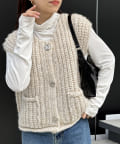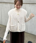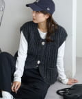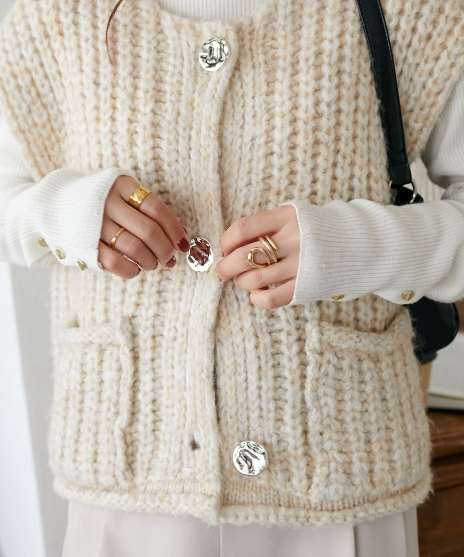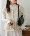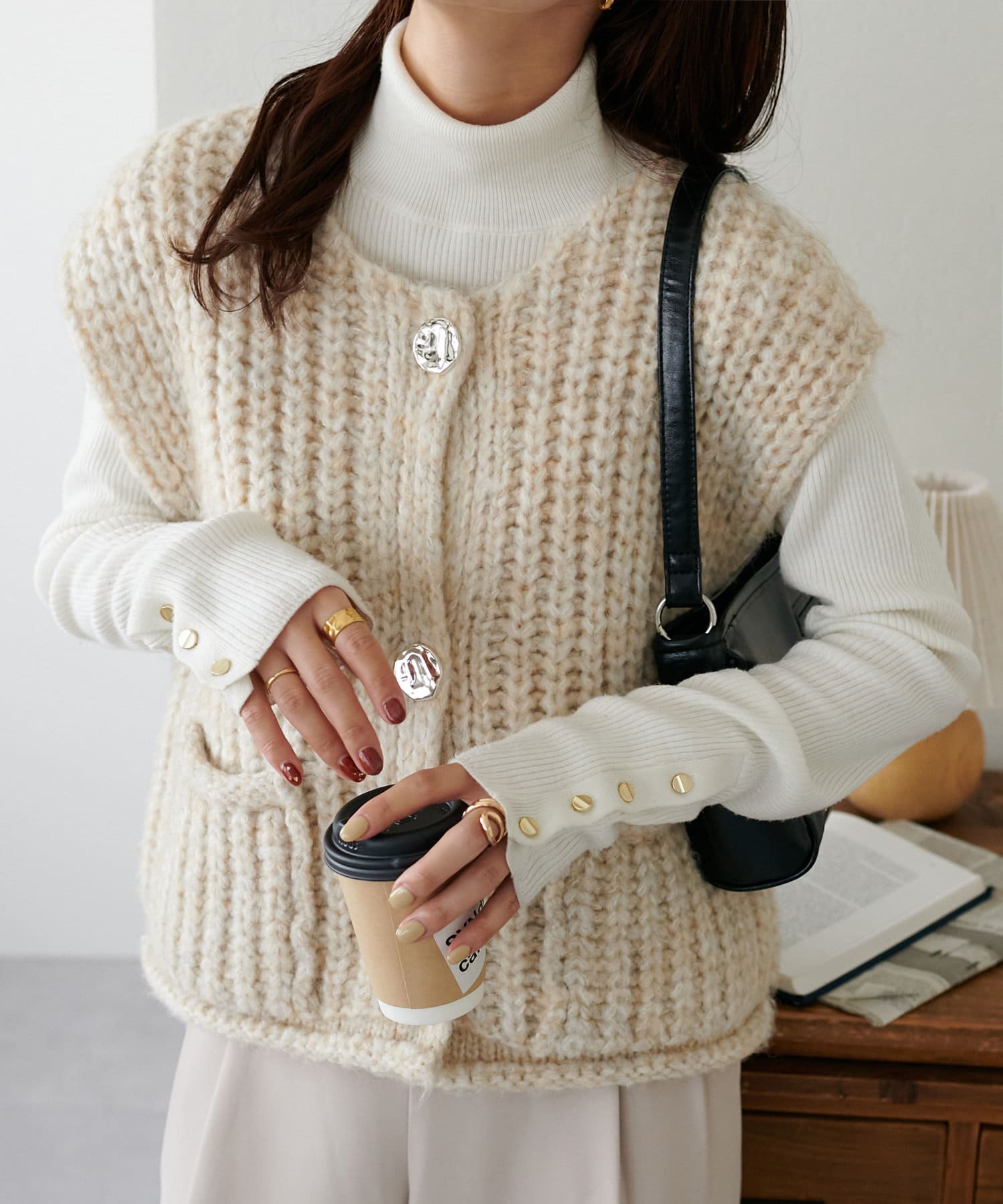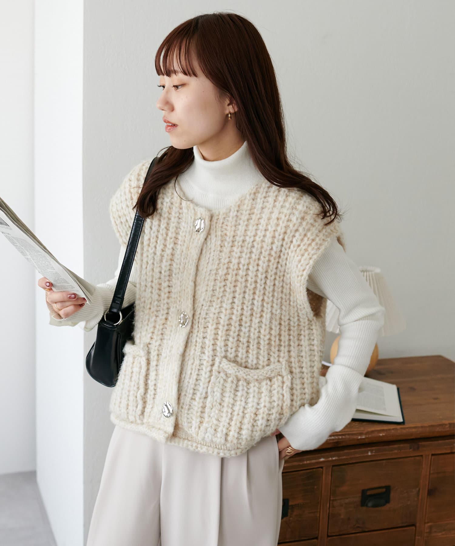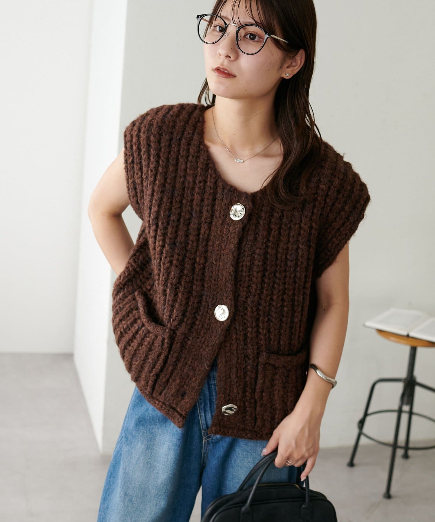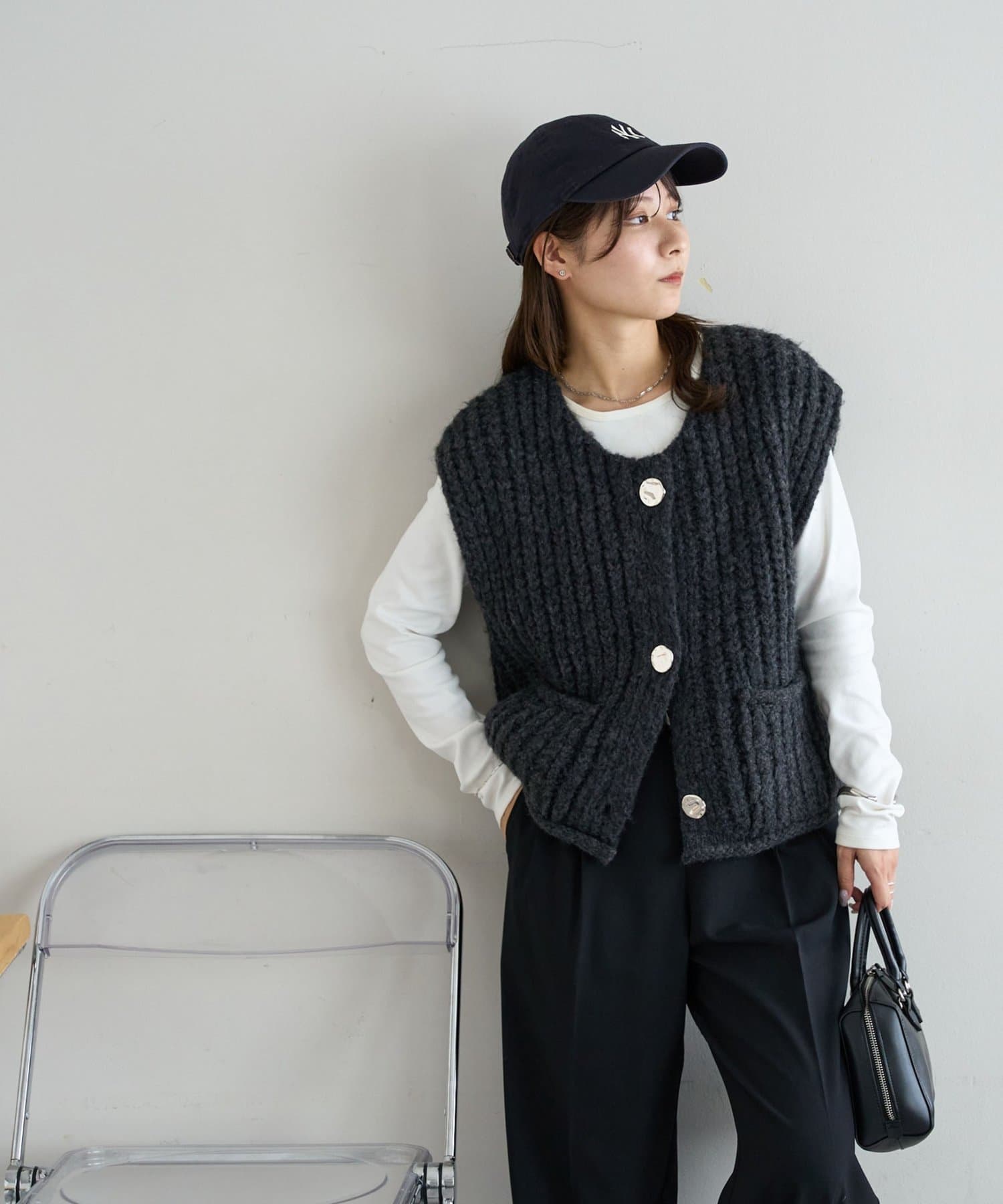大きなデザインボタンが目を引くニットベスト。ざっくりとした網目がシーズンムードを高めてくれます♪フロントのポケットもアクセントになり他とは差がつく1枚に!