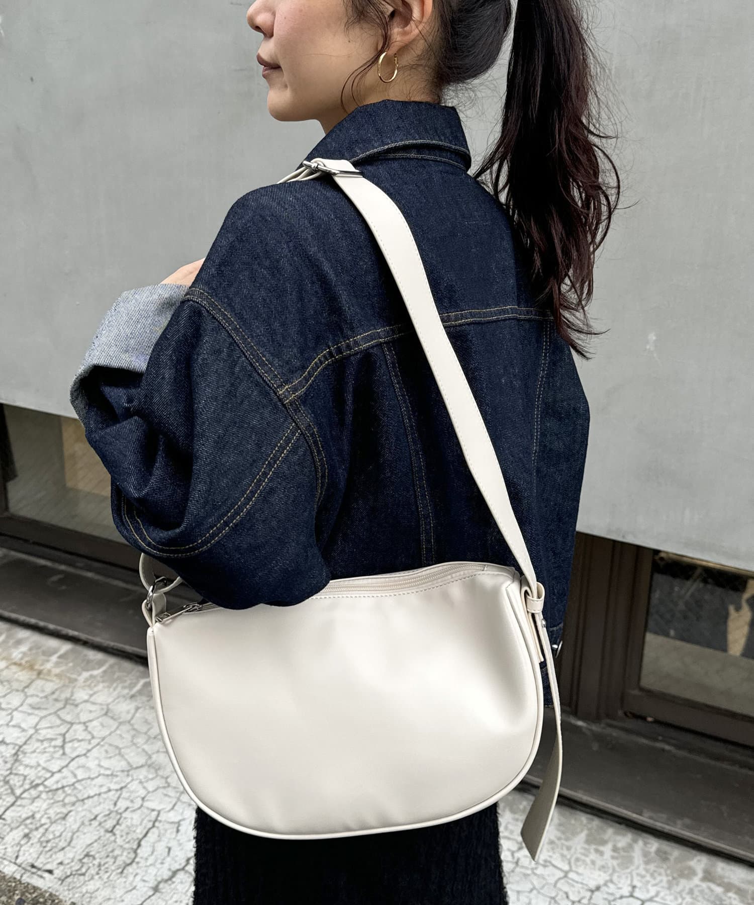 どんなテイストのコーデにも合うシンプルなデザインの半円ショルダーバッグ。マチが8.5㎝としっかりあるので自立するだけでなく、荷物を収納しやすいなど機能性にも優れています。また、ショルダー紐は太めのベルトデザインで肩が疲れにくく、さらに長さ調節可能なので様々な持ち方でお使いいただけます!さらに、開口部が大きく開く為、荷物の出し入れもしやすく、内側には小物を収納できるポケットもあり整理しながら収納できます。カラー展開はブラック・アイボリー・ダークブラウン・キャメルのベーシックな4色展開です♪