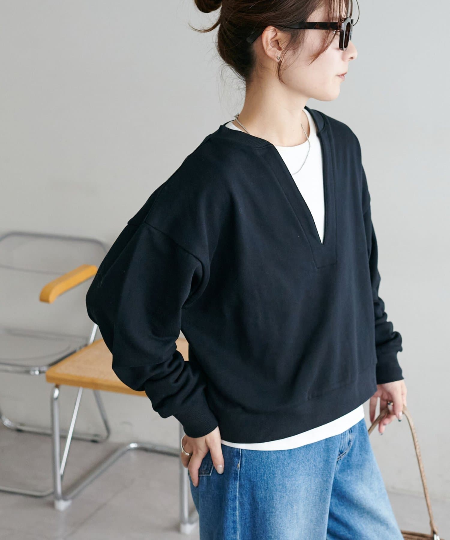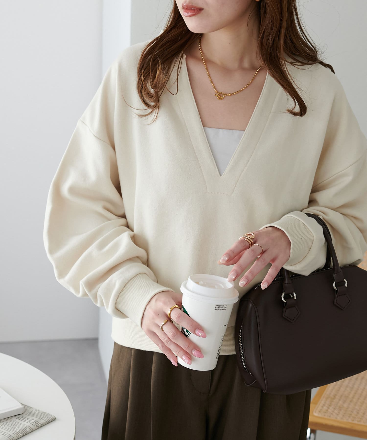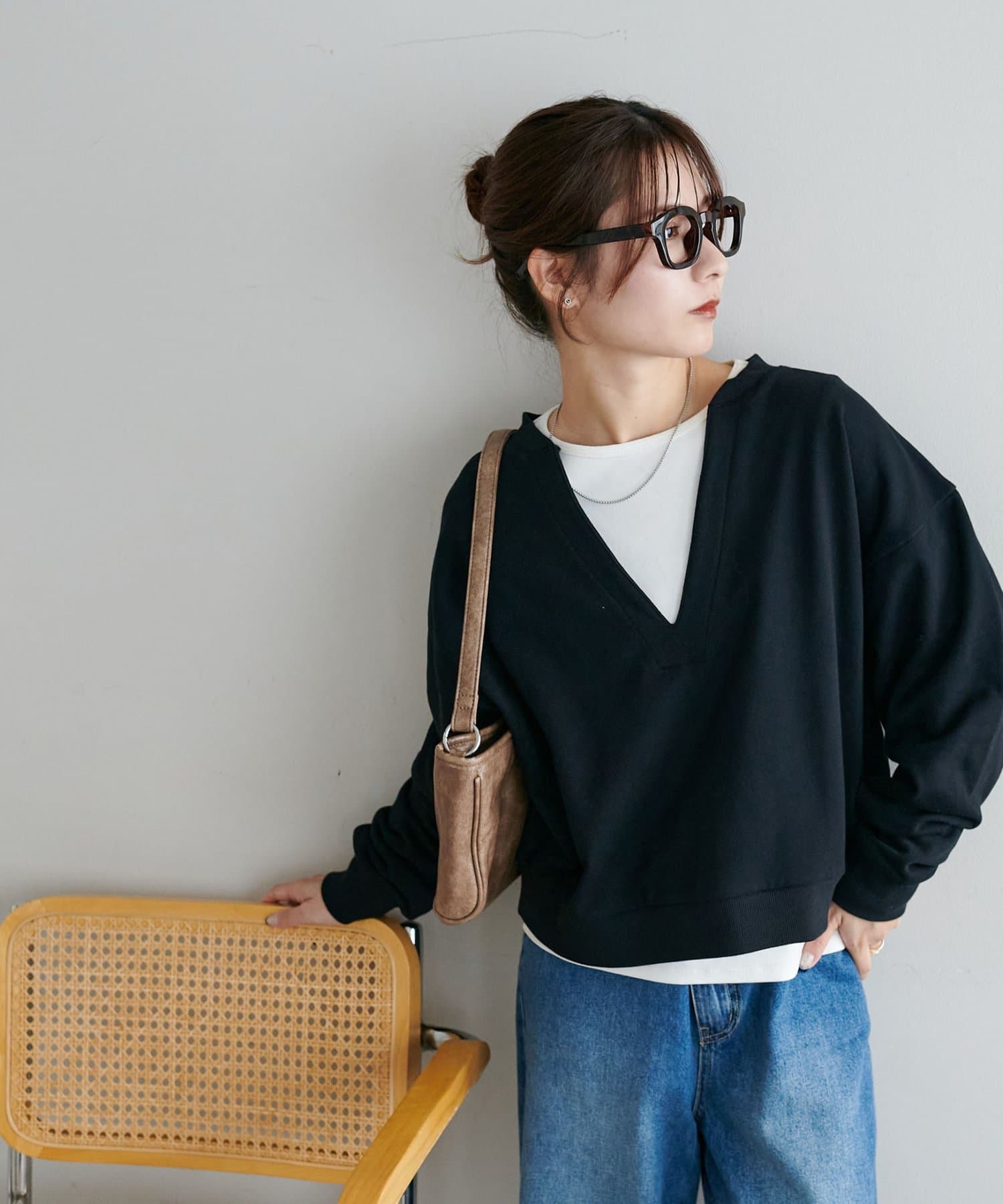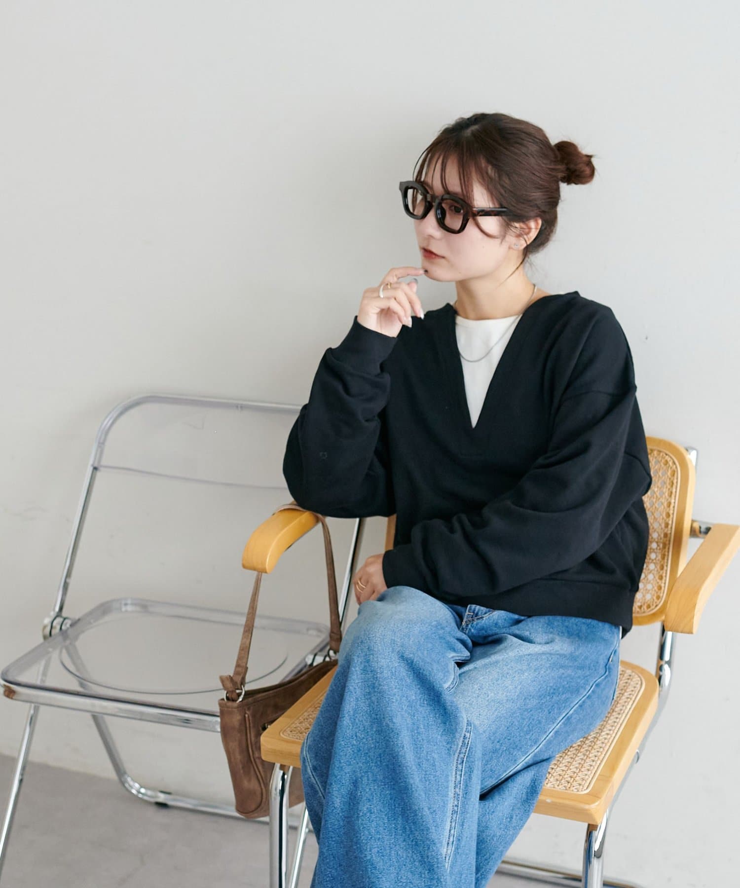 ・153cmスタッフ(Mサイズ着用): 深めのⅤネックが女性らしくカジュアルになり過ぎないのでスカートとも相性抜群♪裏毛素材なのでロングシーズン着用できるのも嬉しいポイント!