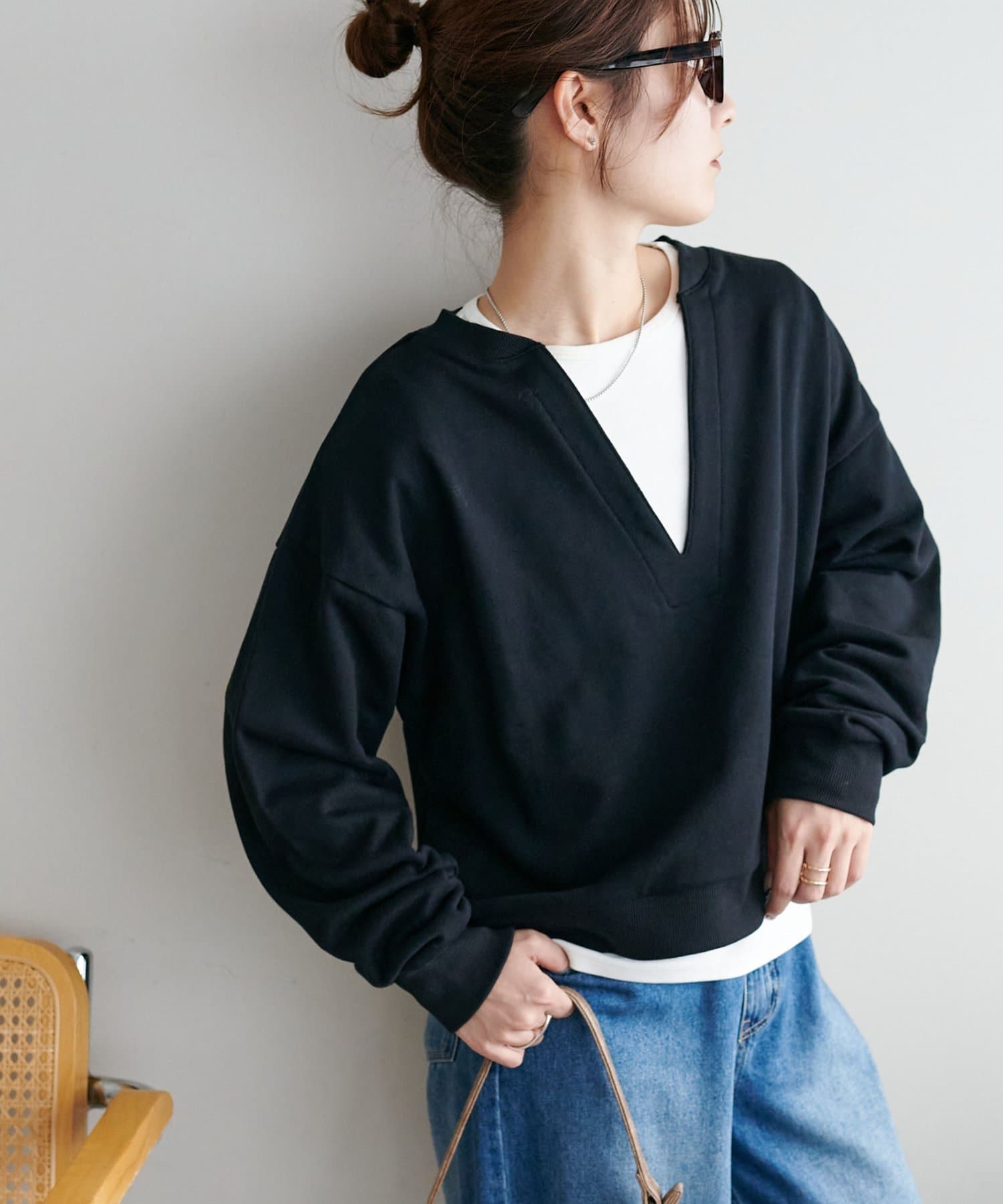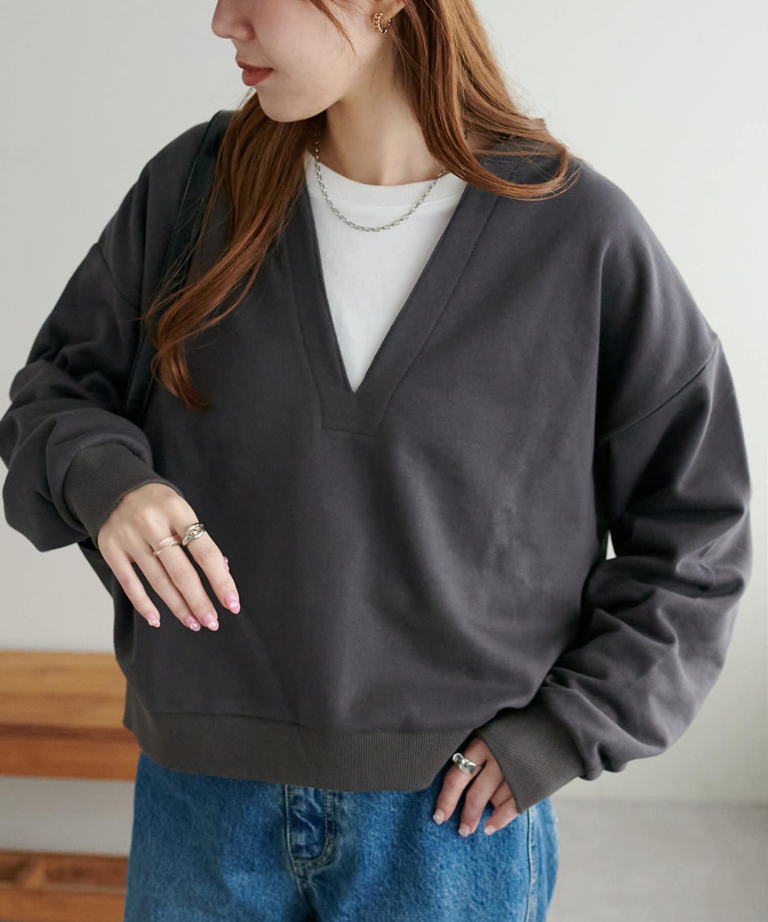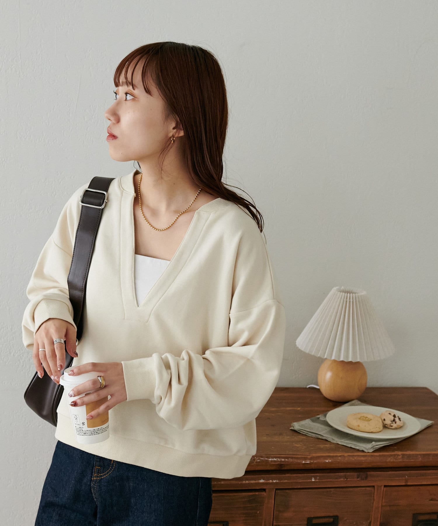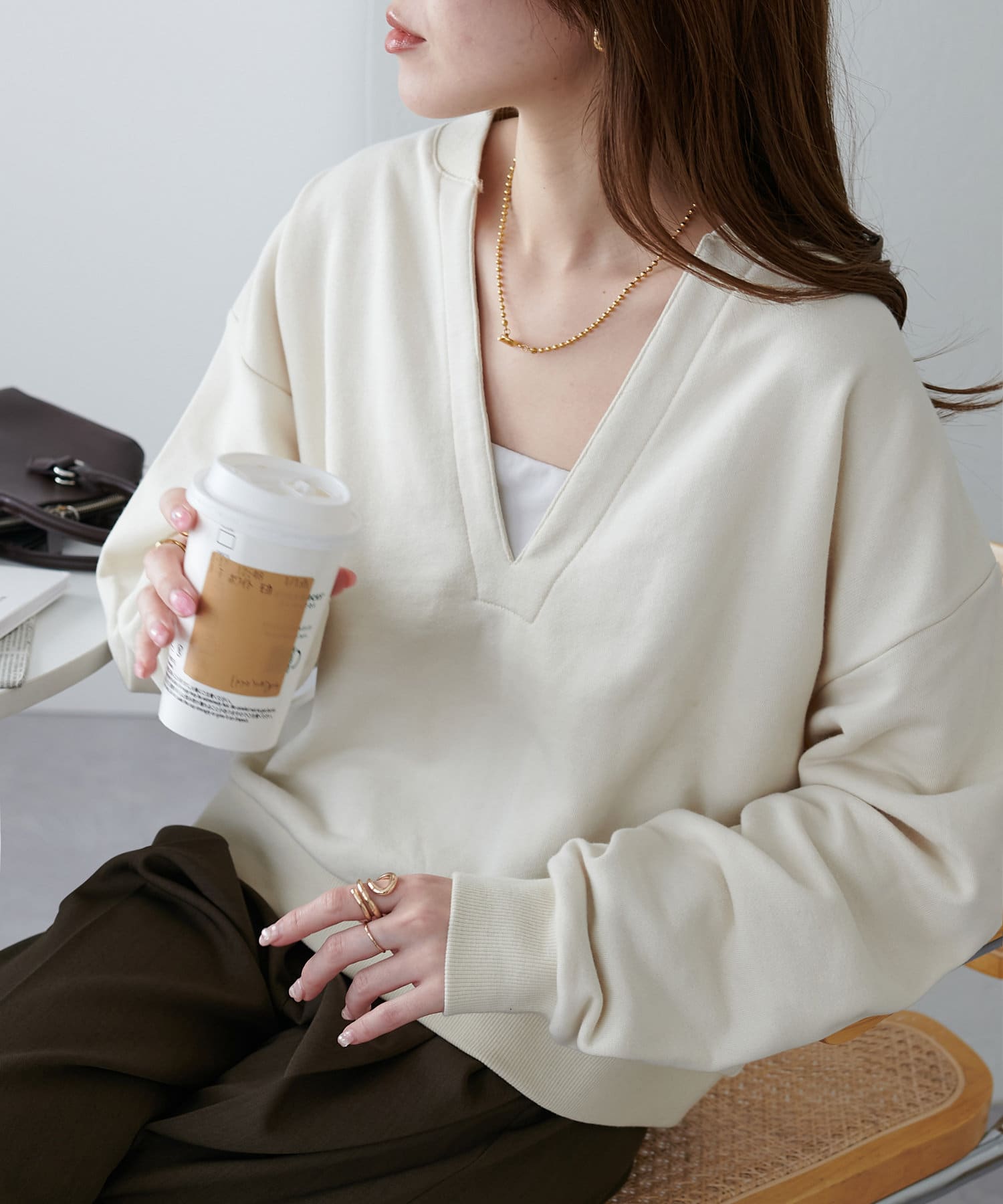 ・153cmスタッフ(Mサイズ着用): 深めのⅤネックが女性らしくカジュアルになり過ぎないのでスカートとも相性抜群♪裏毛素材なのでロングシーズン着用できるのも嬉しいポイント!
