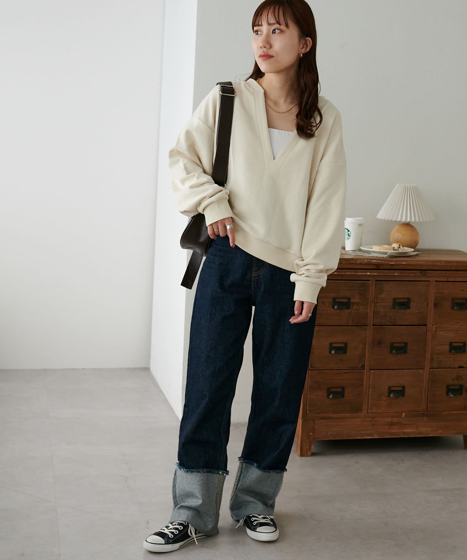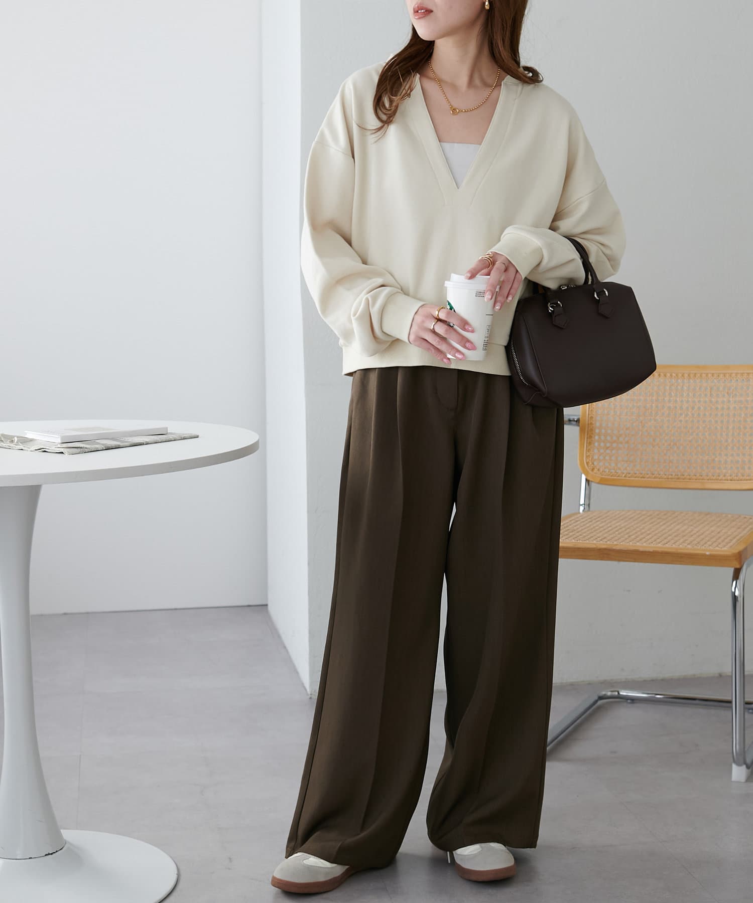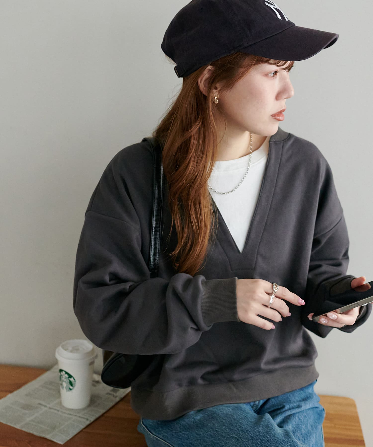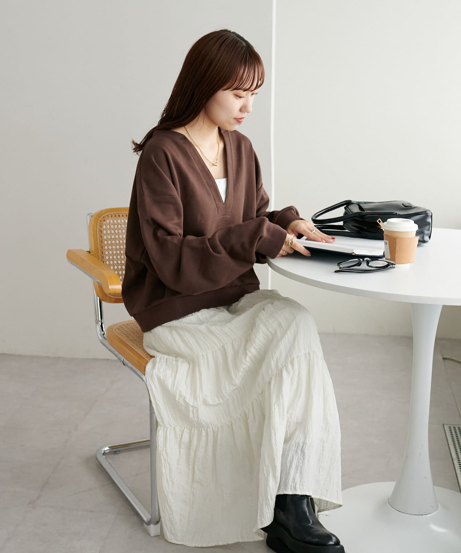 ・153cmスタッフ(Mサイズ着用): 深めのⅤネックが女性らしくカジュアルになり過ぎないのでスカートとも相性抜群♪裏毛素材なのでロングシーズン着用できるのも嬉しいポイント!