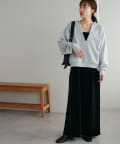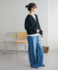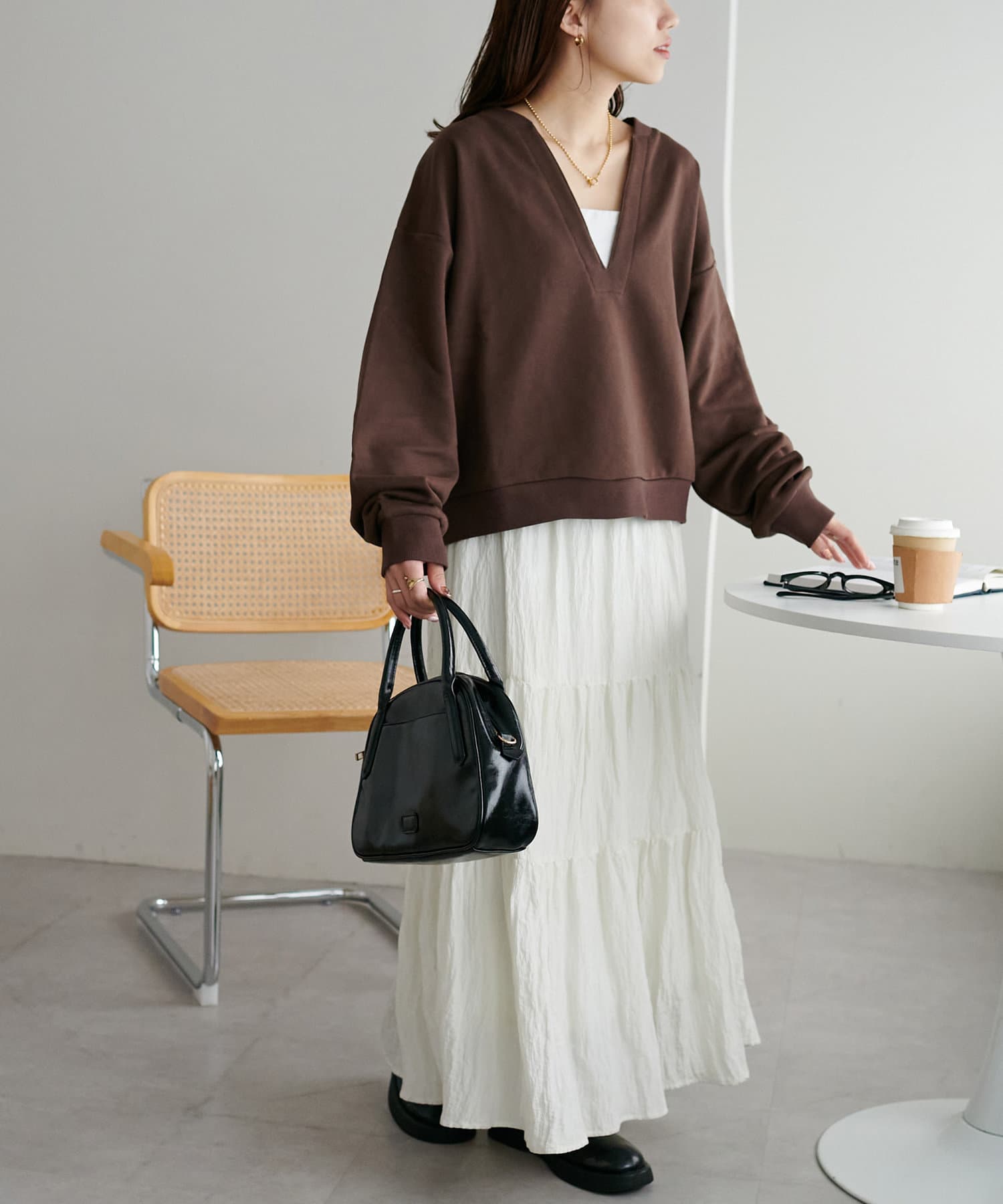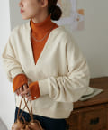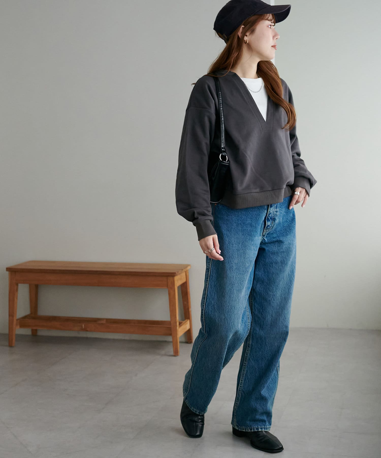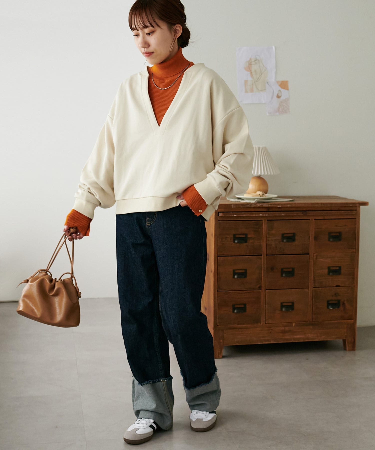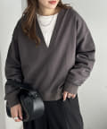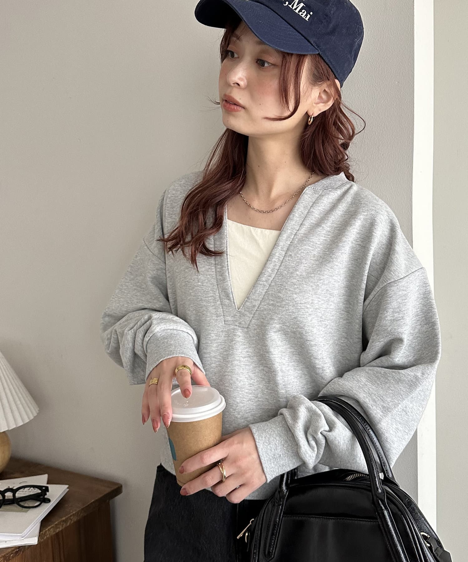 ・153cmスタッフ(Mサイズ着用): 深めのⅤネックが女性らしくカジュアルになり過ぎないのでスカートとも相性抜群♪裏毛素材なのでロングシーズン着用できるのも嬉しいポイント!