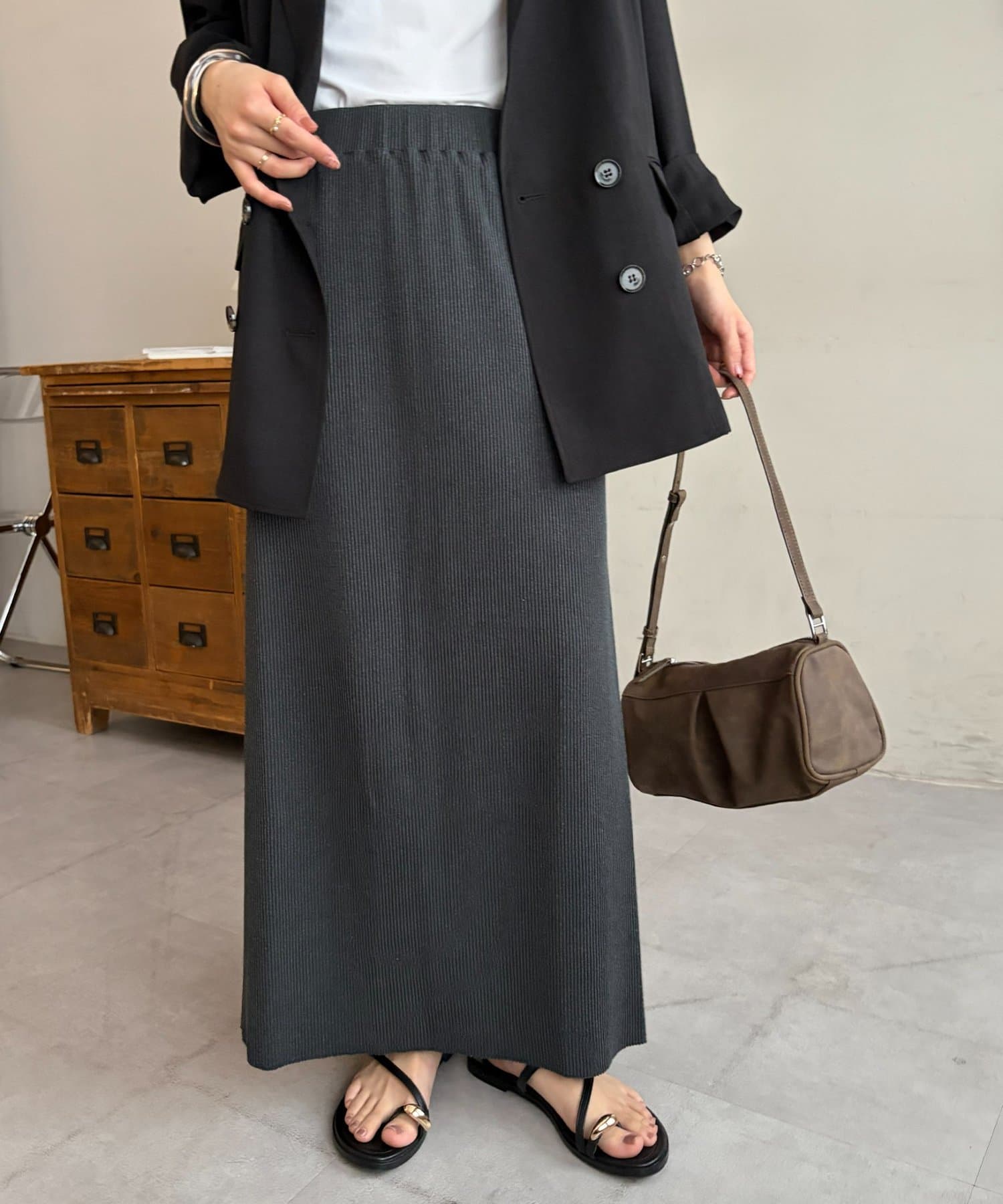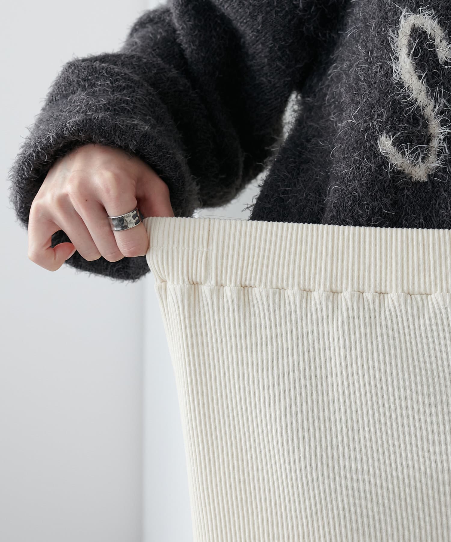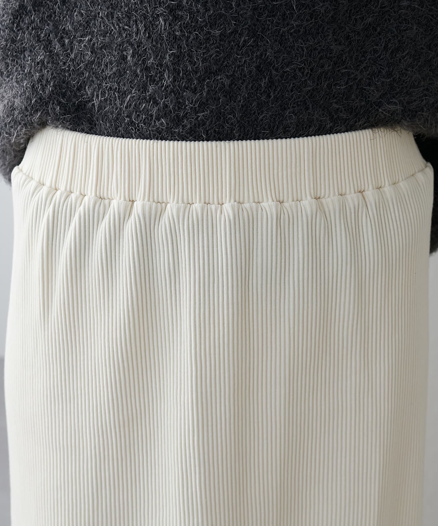 柔らかなリブニット生地にウエストゴムのデザインでリラクシーな着心地が叶うリブナロースカート。
