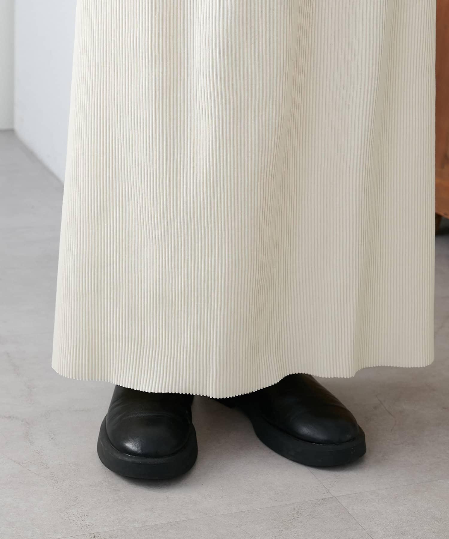 Iラインを強調したすっきりと見えるシルエットですが、凹凸感のあるリブ生地で体にフィットしすぎず着ていただけます◎